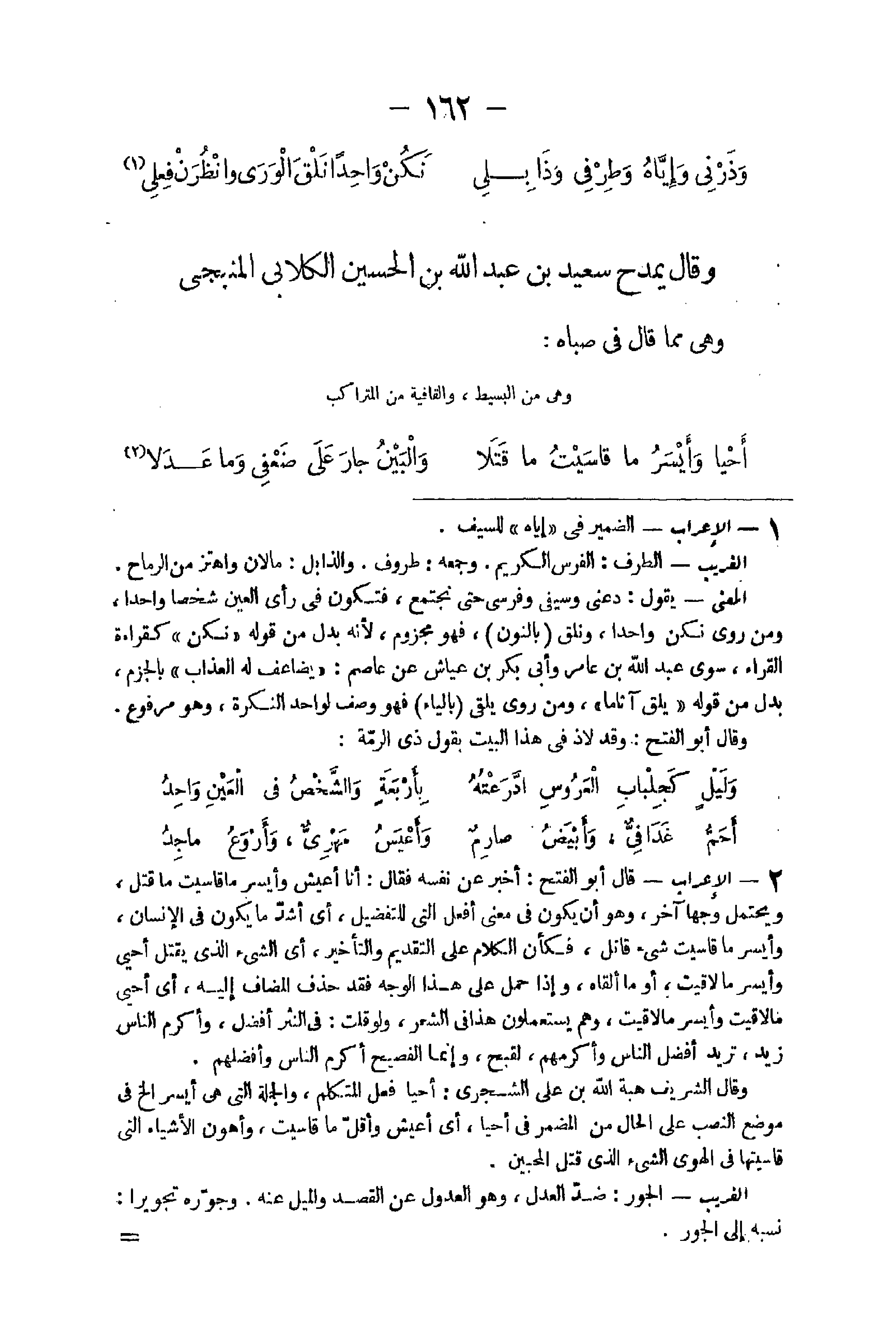 - 1 الْإِعْرَاب قَالَ أَبُو الْفَتْح أخبر عَن نَفسه فَقَالَ أَنا أعيش وأيسر مَا قاسيت مَا قتل وَيحْتَمل وَجها آخر وَهُوَ أَن يكون فِي معنى أفعل الَّتِي للتفضيل أَي أَشد مَا يكون فِي الْإِنْسَان وأيسر مَا قاسيت شَيْء قَاتل فَكَأَن الْكَلَام على التَّقْدِيم وَالتَّأْخِير أَي الشَّيْء الَّذِي يقتل أحيى وأيسر مَا لاقيت أَو مَا أَلْقَاهُ وَإِذا حمل على هَذَا الْوَجْه فقد حذف الْمُضَاف إِلَيْهِ أَي أحيى مَا لاقيت وأيسر مَا لاقيت وهم يستعملون هَذَا فِي الشّعْر وَلَو قلت فِي النثر أفضل وَأكْرم النَّاس زيد تُرِيدُ أفضل النَّاس وَأكْرمهمْ لقبح وَإِنَّمَا الفصيح أكْرم النَّاس وأفضلهم وَقَالَ الشريف هبة الله بن عَليّ الشجري أَحْيَا فعل الْمُتَكَلّم وَالْجُمْلَة الَّتِي هِيَ ايسر الخ فِي مَوضِع النصب على الْحَال من الْمُضمر فِي أَحْيَا أَي أعيش وَأَقل مَا قاسيت وأهون الْأَشْيَاء الَّتِي قاسيتها فِي الْهوى الشَّيْء الَّذِي قتل المحبين الْغَرِيب الْجور ضد الْعدْل وَهُوَ الْعُدُول عَن الْقَصْد والميل عَنهُ وجوره تجويرا نسبه إِلَى الْجور