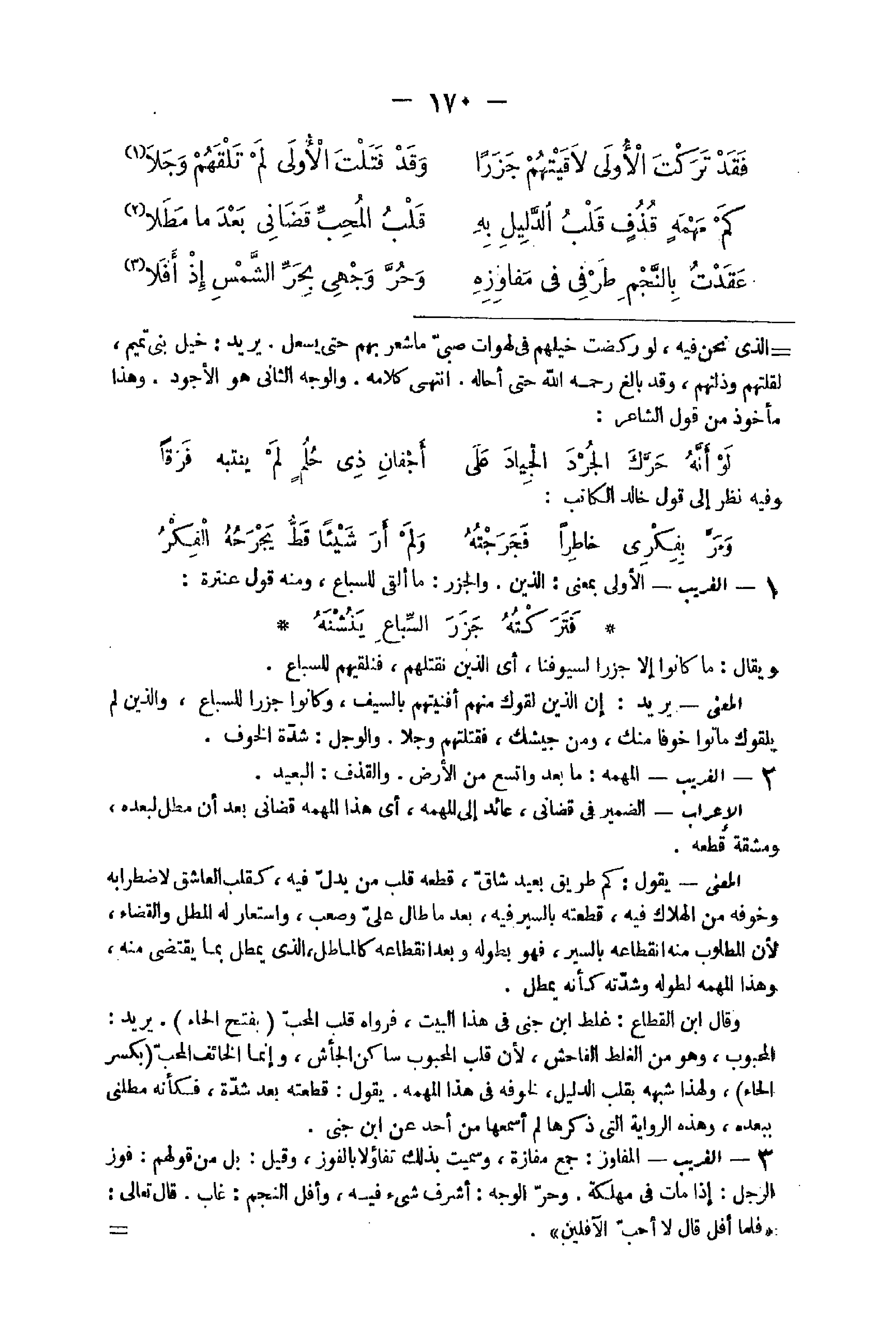 21 - الْغَرِيب المهمة مَا بعد واتسع من الأَرْض وَالْقَذْف الْبعيد الْإِعْرَاب الضَّمِير فِي قضاني عَائِد إِلَى المهمة أَي هَذَا المهمة قضاني بعد أَن مطل لبعده ومشقة قطعه الْمَعْنى يَقُول كم طَرِيق بعيد شاق قطعه قلب من يدل فِيهِ كقلب العاشق لاضطرابه وخوفه من الْهَلَاك فِيهِ قطعته بالسير فِيهِ بعد مَا طَال على وصعب واستعارة لَهُ المطل وَالْقَضَاء لِأَن الْمَطْلُوب مِنْهُ انْقِطَاعه بالسير فَهُوَ بِطُولِهِ وَبعد انْقِطَاعه كالماطل الَّذِي يمطل بِمَا يَقْتَضِي مِنْهُ وَهَذَا المهمة لطوله وشدته كَأَنَّهُ يمطل وَقَالَ ابْن القطاع غلط ابْن جنى فِي هَذَا الْبَيْت فَرَوَاهُ قلب الْمُحب بِفَتْح الْحَاء يُرِيد المحبوب وَهُوَ من الْغَلَط الْفَاحِش لِأَن قلب المحبوب سَاكن الجأش وَإِنَّمَا الْخَائِف الْمُحب بِكَسْر الْحَاء وَلِهَذَا شبهه بقلب الدَّلِيل لخوفه فِي هَذَا المهمه يَقُول قطعته بعد شدَّة فَكَأَنَّهُ مطلني ببعده وَهَذِه الرِّوَايَة الَّتِي ذكرهَا لم أسمعها من اُحْدُ عَن ابْن جنى