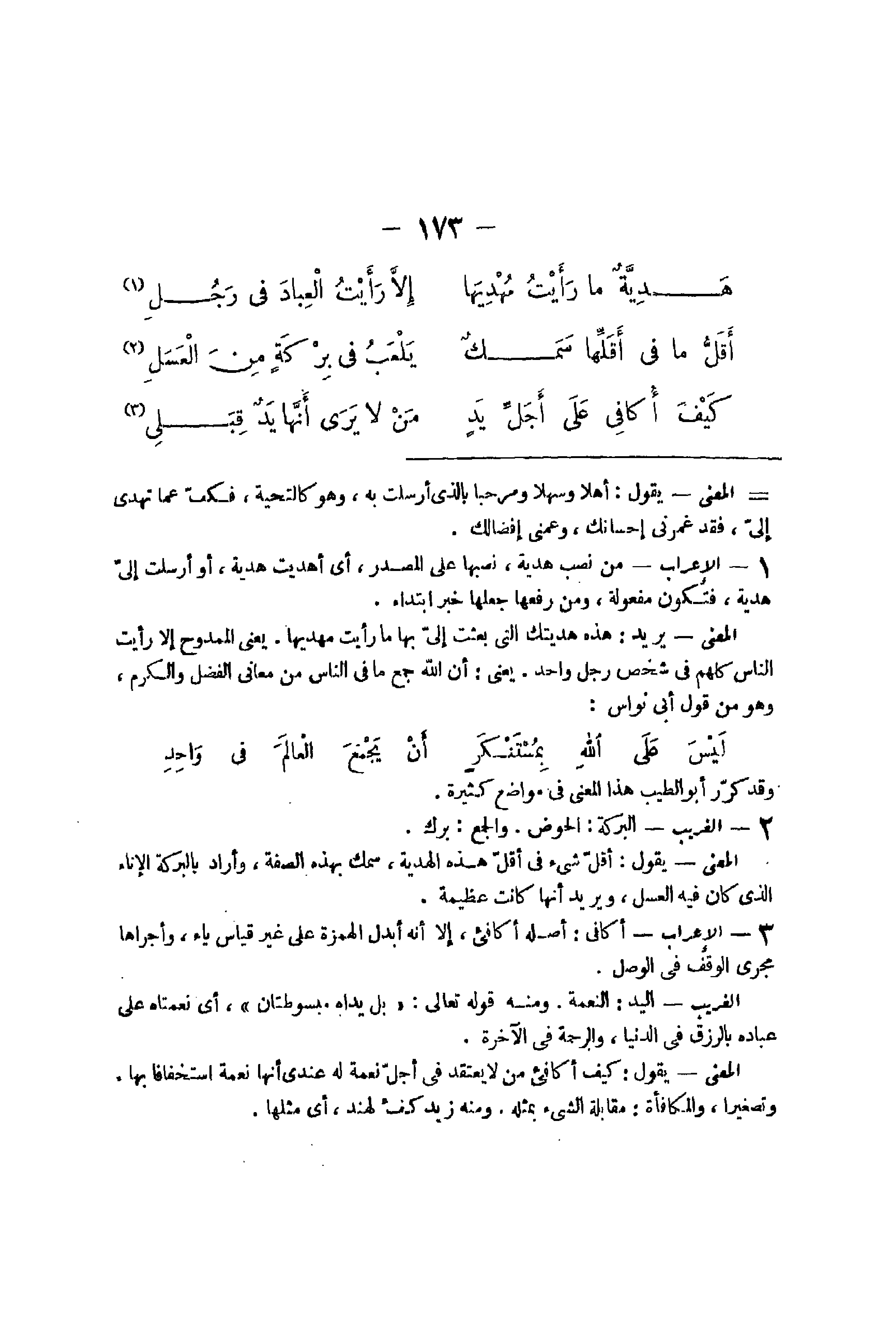 4 - الْإِعْرَاب من نصب هَدِيَّة نصبها على الْمصدر أَي أهديت هَدِيَّة أَو أرْسلت إِلَى هَدِيَّة فَتكون مفعولة وَمن رَفعهَا جعلهَا خبر ابْتِدَاء الْمَعْنى يُرِيد هَذِه هديتك الَّتِي بعثت إِلَى بهَا مَا رَأَيْت مهديها يعْنى الممدوح إِلَّا رَأَيْت النَّاس كلهم فِي شخص رجل وَاحِد يَعْنِي أَن الله جمع مَا فِي النَّاس من مَعَاني الْفضل وَالْكَرم وَهُوَ من قَول أبي نواس