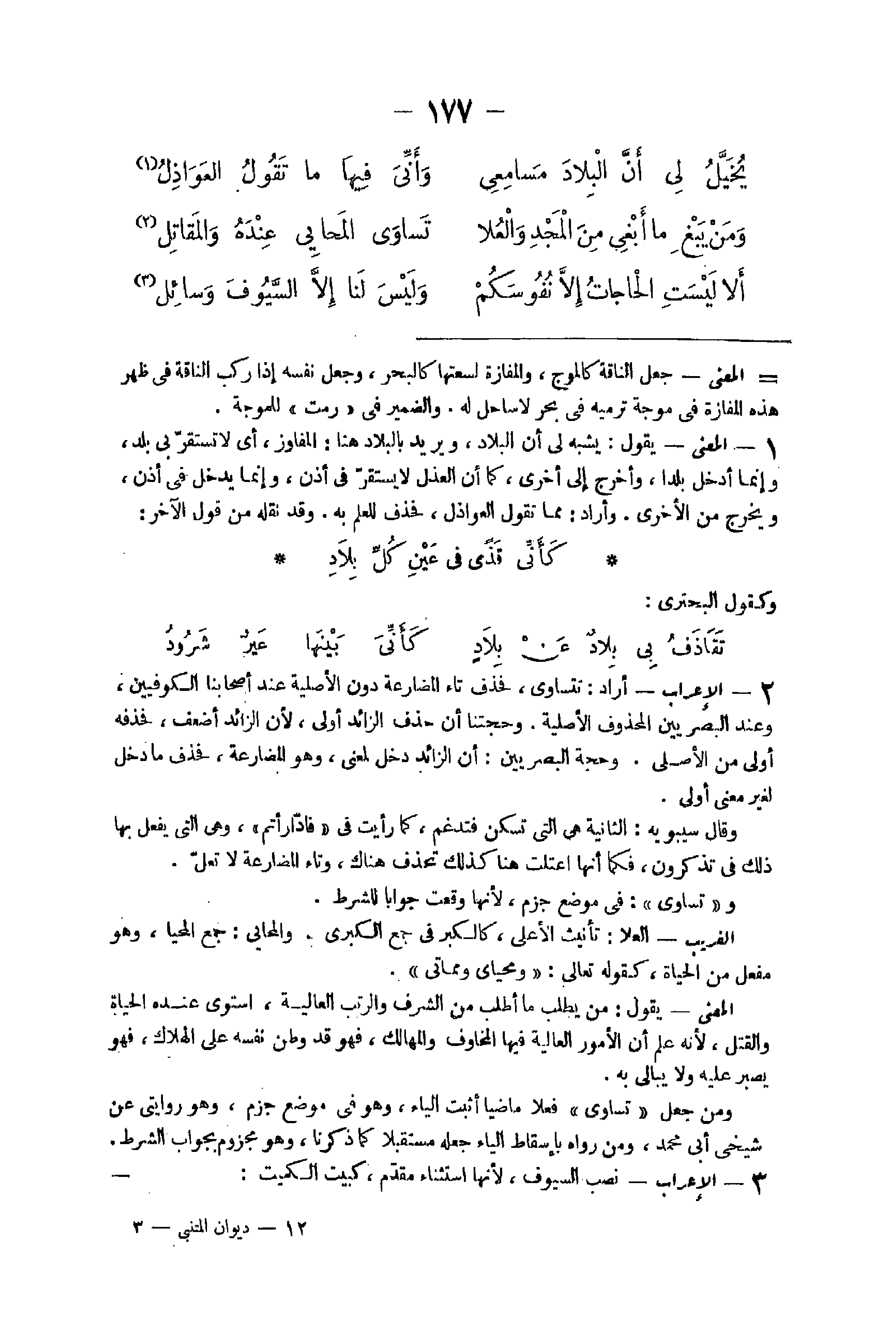 11 - الْإِعْرَاب أَرَادَ تتساوى فَحذف تَاء المضارعة دون الْأَصْلِيَّة عِنْد أَصْحَابنَا الْكُوفِيّين وَعند الْبَصرِيين الْمَحْذُوف الْأَصْلِيَّة وَحجَّتنَا أَن حذف الزَّائِدَة أولى لِأَن الزَّائِد أَضْعَف فَحَذفهُ أولى من الْأَصْلِيّ وَحجَّة الْبَصرِيين أَن الزَّائِد دخل لِمَعْنى وَهُوَ المضارعة فَحذف مَا دخل لغير معنى أولى وَقَالَ سِيبَوَيْهٍ الثَّانِيَة هِيَ الَّتِي تسكن فتدغم كَمَا رَأَيْت فِي فاد ارأتم وَهِي الَّتِي يفعل بهَا ذَلِك فِي تذكرُونَ فَكَمَا أَنَّهَا اعتلت هُنَا كَذَلِك تحذف هُنَاكَ وتاء المضارعة لاتعل وتساوى فِي مَوضِع جزم لِأَنَّهَا وَقعت جَوَابا للشّرط الْغَرِيب الْعلَا تَأْنِيث الْأَعْلَى كالكبر فِي جمع الْكُبْرَى والمحابي جمع الْمحيا وَهُوَ مفعل من الْحَيَاة كَقَوْلِه تَعَالَى {ومحياي ومماتي} الْمَعْنى يَقُول من يطْلب مَا أطلب من الشّرف والرتب الْعَالِيَة اسْتَوَى عِنْده الْحَيَاة وَالْقَتْل لِأَنَّهُ علم أَن الْأُمُور الْعَالِيَة فِيهَا المخاوف والمهالك فَهُوَ قد وَطن نَفسه على الْهَلَاك فَهُوَ يصبر عَلَيْهِ وَلَا يُبَالِي بِهِ وَمن جعل تَسَاوِي فعلا مَاضِيا أثبت الْيَاء وَهُوَ فِي مَوضِع جزم وَهُوَ روايتي عَن شيخى أبي مُحَمَّد وَمن رَوَاهُ بِإِسْقَاط الْيَاء جعله مُسْتَقْبلا كَمَا ذكرنَا وَهُوَ مجزوم بِجَوَاب الشَّرْط