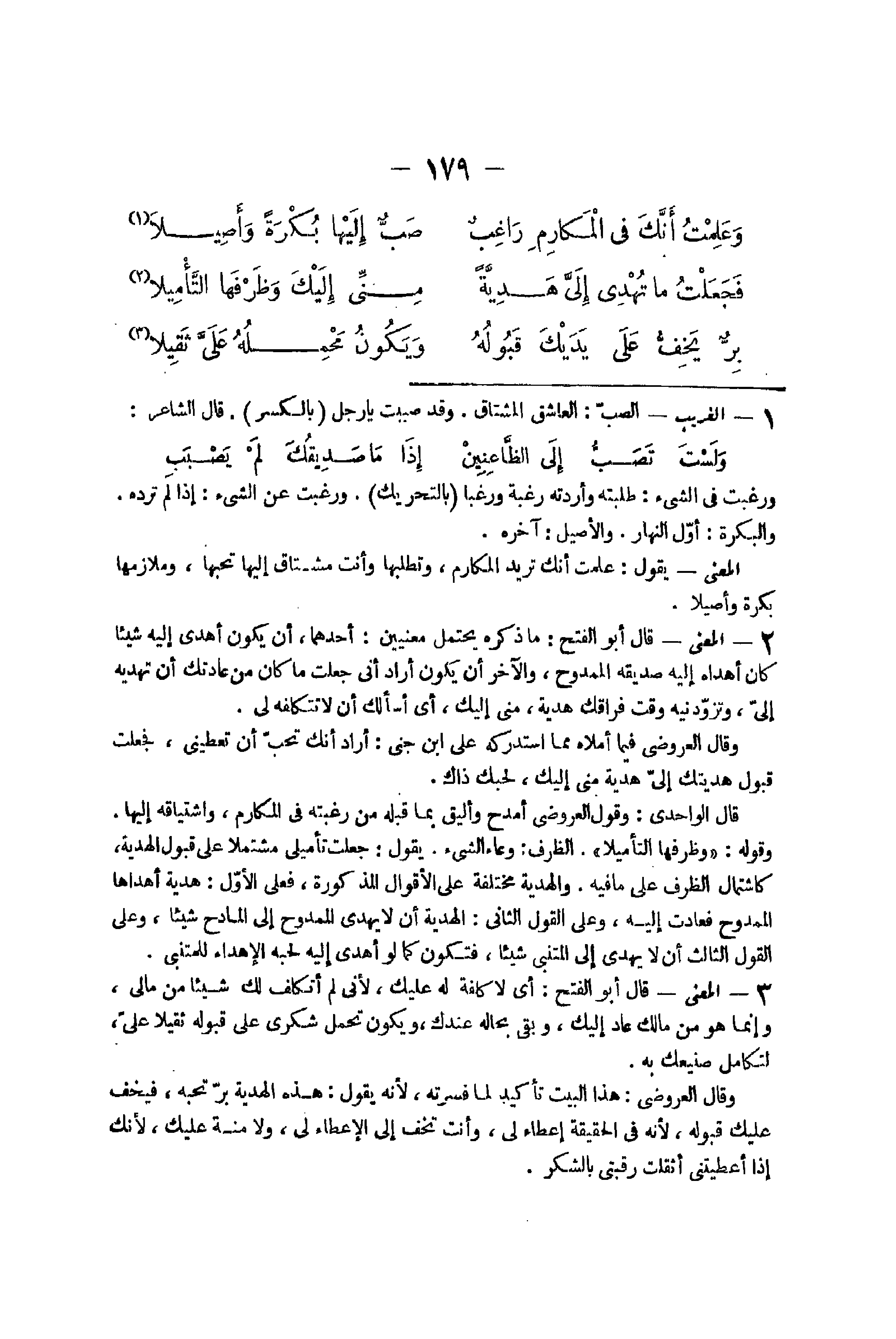 3 - الْمَعْنى قَالَ أَبُو الْفَتْح مَا ذكره يحْتَمل مَعْنيين أَحدهمَا أَن يكون أهْدى إِلَيْهِ شَيْئا كَانَ أهداه إِلَيْهِ صديقه الممدوح وَالْآخر أَن يكون أَرَادَ أَنِّي جعلت مَا كَانَ من عادتك أَن تهديه إِلَيّ وتزودينه وَقت فراقك هَدِيَّة مني إِلَيْك أَي أَسأَلك أَن لَا تتكفله لي وَقَالَ الْعَرُوضِي فِيمَا أملاه مِمَّا استدركه على أبن جنى أَرَادَ أَنَّك تحب أَن تُعْطِينِي فَجعلت قبُول هديتك إِلَى هَدِيَّة مني إِلَيْك لحبك ذَاك قَالَ الواحدي وَقَول الْعَرُوضِي أمدح وأليق بِمَا قبله من رغبته فِي المكارم وأشتياقه إِلَيْهَا وَقَوله وظرفها التأميلا الظّرْف وعَاء الشَّيْء يَقُول جعلت تأميلي مُشْتَمِلًا على قبُول الْهَدِيَّة كاشمال الظّرْف على مَا فِيهِ والهدية مُخْتَلفَة على الْأَقْوَال الْمَذْكُورَة فعلى الأول هَدِيَّة أهداها الممدوح فَعَادَت إِلَيْهِ وعَلى القَوْل الثَّانِي الْهَدِيَّة أَن لَا يهدي الممدوح إِلَى المادح شَيْئا وعَلى القَوْل الثَّالِث أَن لَا يهدي إِلَى المتنبي شَيْئا فَتكون كَمَا لَو أهْدى إِلَيْهِ لحبه الإهداء للمتنبي