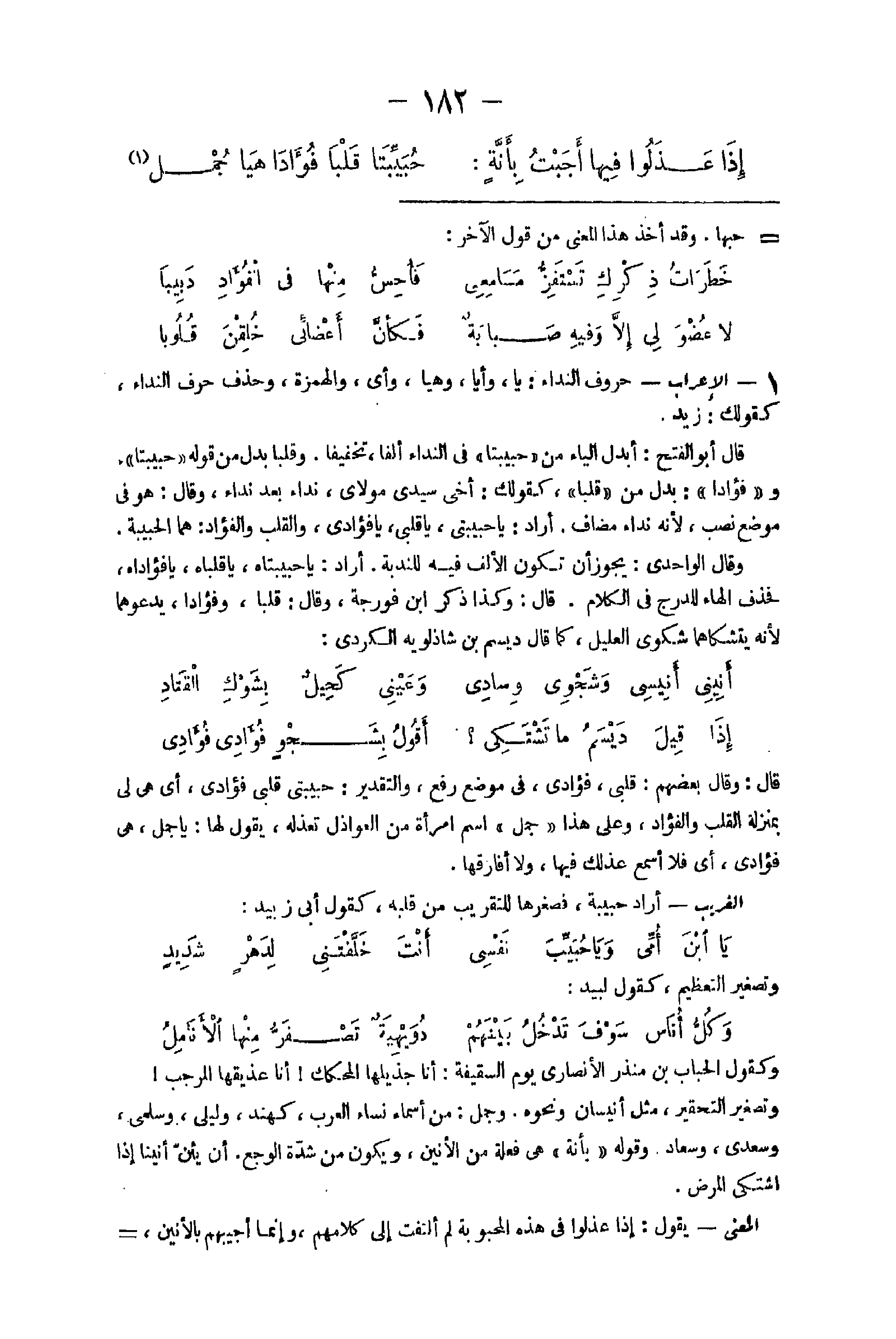 6 - الْإِعْرَاب حُرُوف النداء يَا وأيا وهيا وَأي والهمزة وَحذف حرف النداء كَقَوْلِك زيد قَالَ أَبُو الْفَتْح أبدل الْيَاء من حبيبتا فِي النداء ألفا تَخْفِيفًا وَقَلْبًا بدل من قَوْله حبيبتا وفؤادا بدل من قلبا كَقَوْلِك أخي سَيِّدي مولَايَ نِدَاء بعد نِدَاء وَقَالَ هُوَ فِي مَوضِع نصب لِأَنَّهُ نِدَاء مُضَاف أَرَادَ يَا حبيبتي يَا قلبِي يَا فُؤَادِي وَالْقلب والفؤاد هما الحبيبة وَقَالَ الواحدي يجوز أَن تكون الْألف فِيهِ للندبة أَرَادَ يَا حبيبتاه يَا قلباه يَا فؤاداه فَحذف الْهَاء للدرج فِي الْكَلَام قَالَ وَكَذَا ذكر ابْن فورجة وَقَالَ قلبا وفؤادا يدعوهما لِأَنَّهُ يتشكاهما شكوى العليل كَمَا قَالَ ديسم بن شاذلويه الْكرْدِي