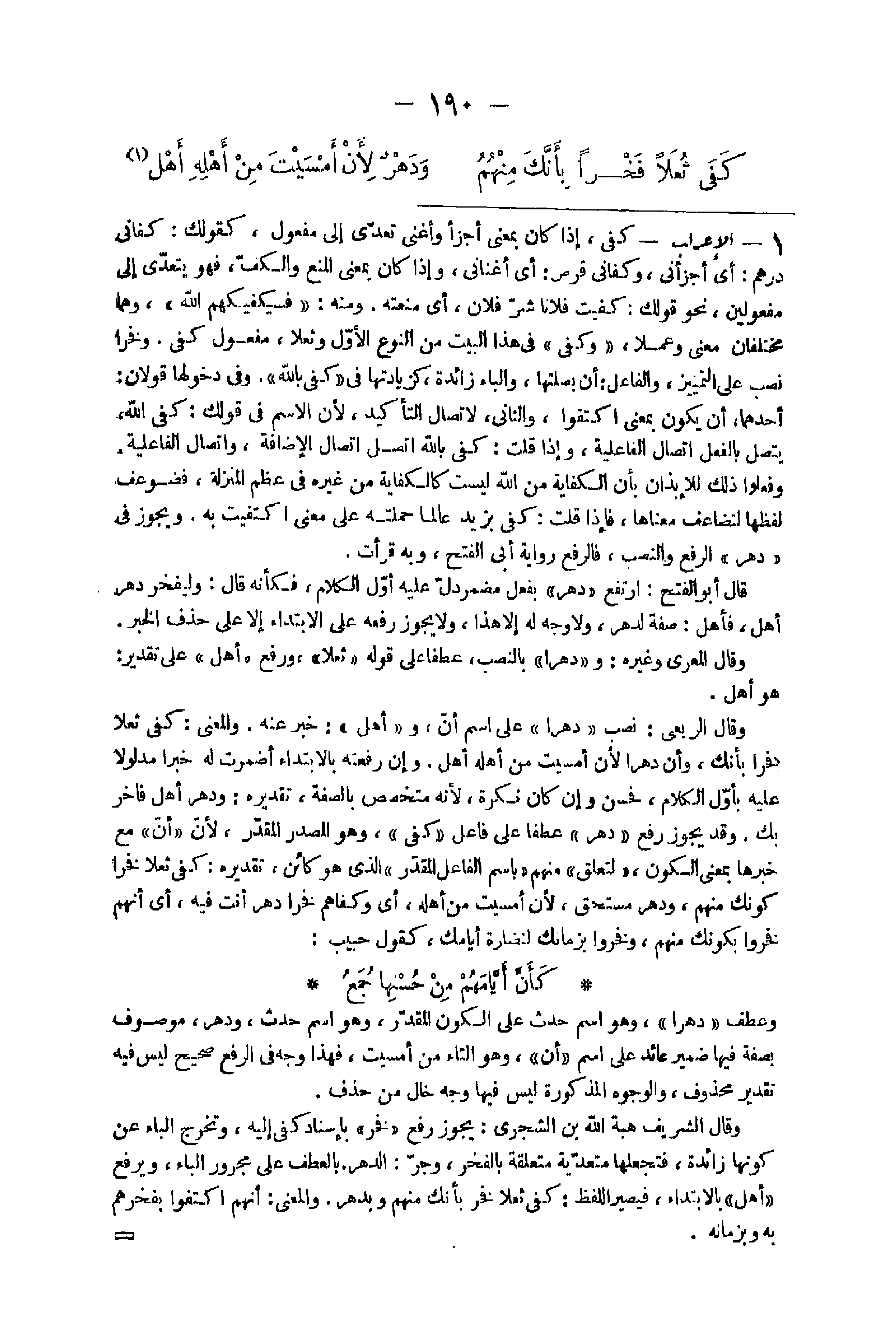 - الْإِعْرَاب كفى إِذا كَانَ بِمَعْنى أَجْزَأَ وأغنى تعدى إِلَى مفعول كَقَوْلِك كفاني دِرْهَم أَي أجزأني وكفاني قرص أَي أغناني وَإِذا كَانَ بِمَعْنى الْمَنْع والكف فَهُوَ يعتدي إِلَى مفعولين نَحْو قَوْلك كفيت فلَانا شَرّ فلَان أَي منعته وَمِنْه فَسَيَكْفِيكَهُم الله وهما مُخْتَلِفَانِ معنى وَعَملا وَكفى فِي هَذَا الْبَيْت من النَّوْع الأول وثعلا مفعول كفى وفخرا نصب على التَّمْيِيز وَالْفَاعِل أَن بصلتها وَالْبَاء زَائِدَة كزيادتها فِي كفى بِاللَّه وَفِي دُخُولهَا قَولَانِ أَحدهمَا أَن يكون بِمَعْنى اكتفوا وَالثَّانِي لاتصال التَّأْكِيد لِأَن الِاسْم فِي قَوْلك كفى الله يتَّصل بِالْفِعْلِ اتِّصَال الفاعلية وَإِذا قلت كفى بِاللَّه اتَّصل اتِّصَال الْإِضَافَة واتصال الفاعلية وفعلوا ذَلِك للإيذان بِأَن الْكِفَايَة من الله لَيست كالكفاية من غَيره فِي عظم الْمنزلَة فضوعف لَفظهَا لتضاعف مَعْنَاهَا فَإِذا قلت كفى بزيد عَالما حَملته على معنى اكتفيت بِهِ وَيجوز فِي دهر الرّفْع وَالنّصب فالرفع راوية أبي الْفَتْح وَبِه قَرَأت قَالَ أَبُو الْفَتْح ارْتَفع دهر بِفعل مُضْمر دلّ عَلَيْهِ أول الْكَلَام فَكَأَنَّهُ قَالَ وليفخر دهر أهل فَأهل صفة لدهر وَلَا وَجه لَهُ إِلَّا هَذَا وَلَا يجوز رَفعه على الأبتداء إِلَّا على حذف الْخَبَر وَقَالَ المعري وَغَيره ودهرا بِالنّصب عطفا على قَوْله ثعلا وَرفع أهل على تَقْدِير هُوَ أهل وَقَالَ الربعِي نصب دهرا على أسم أَن وَأهل خبر عَنهُ وَالْمعْنَى كفى ثعلا فخرا بأنك وَأَن دهرا لِأَن أمسيت من أَهله أهل وَإِن رفعته بِالِابْتِدَاءِ أضمرت لَهُ خَبرا مدلولا عَلَيْهِ بِأول الْكَلَام فَحسن وَإِن كَانَ نكرَة لِأَنَّهُ متخصص بِالصّفةِ تَقْدِيره ودهر أهل فاخر بك وَقد يجوز رفع دهر عطفا على فَاعل كفى وَهُوَ الْمصدر الْمُقدر لِأَن أَن مَعَ خَبَرهَا بِمَعْنى الْكَوْن لتَعلق مِنْهُم باسم الْفَاعِل الْمُقدر الَّذِي هُوَ كَائِن تَقْدِيره كفى ثعلا فخرا كونك مِنْهُم ودهر مُسْتَحقّ لِأَن أمسيت من أَهله أَي وكفاهم فخرا دهر أَنْت فِيهِ أَي أَنهم فَخَروا بكونك مِنْهُم وفخروا بزمانك لنضارة أيامك كَقَوْل حبيب