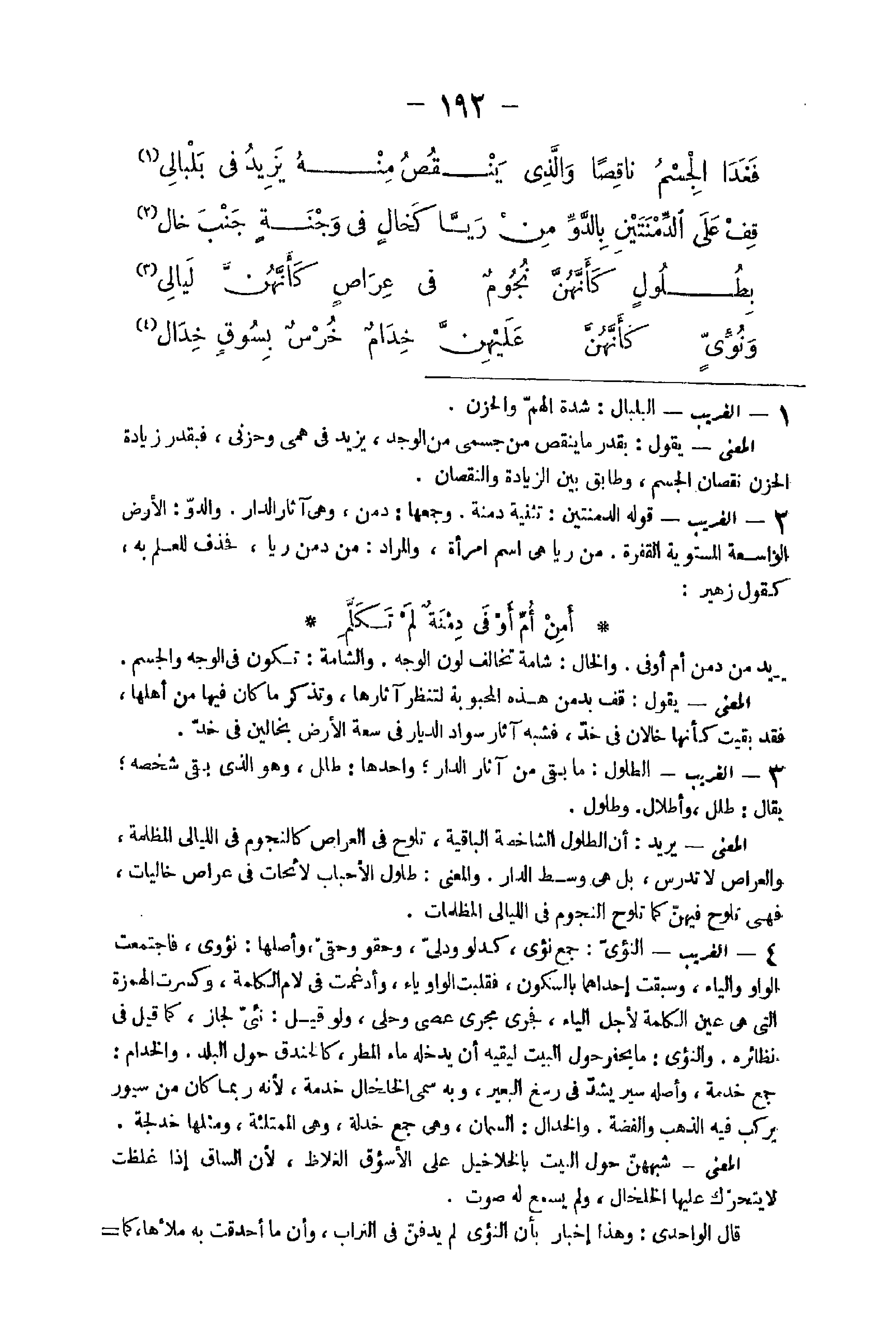 4 - الْغَرِيب الطلول مَا بقى من آثَار الدَّار وَاحِدهَا طلل وَهُوَ الَّذِي بقى شخصه يُقَال طلل وأطلال وطلول الْمَعْنى يُرِيد أَن الطلول الشاخصة الْبَاقِيَة تلوح فِي العراص كَالنُّجُومِ فِي اللَّيَالِي الْمظْلمَة والعراص لَا تدرس بل هِيَ وسط الدَّار وَالْمعْنَى طلول الأحباب لائحات فِي عراص خاليات فَهِيَ تلوح فِيهِنَّ كَمَا تلوح النُّجُوم فِي اللَّيَالِي المظلمات