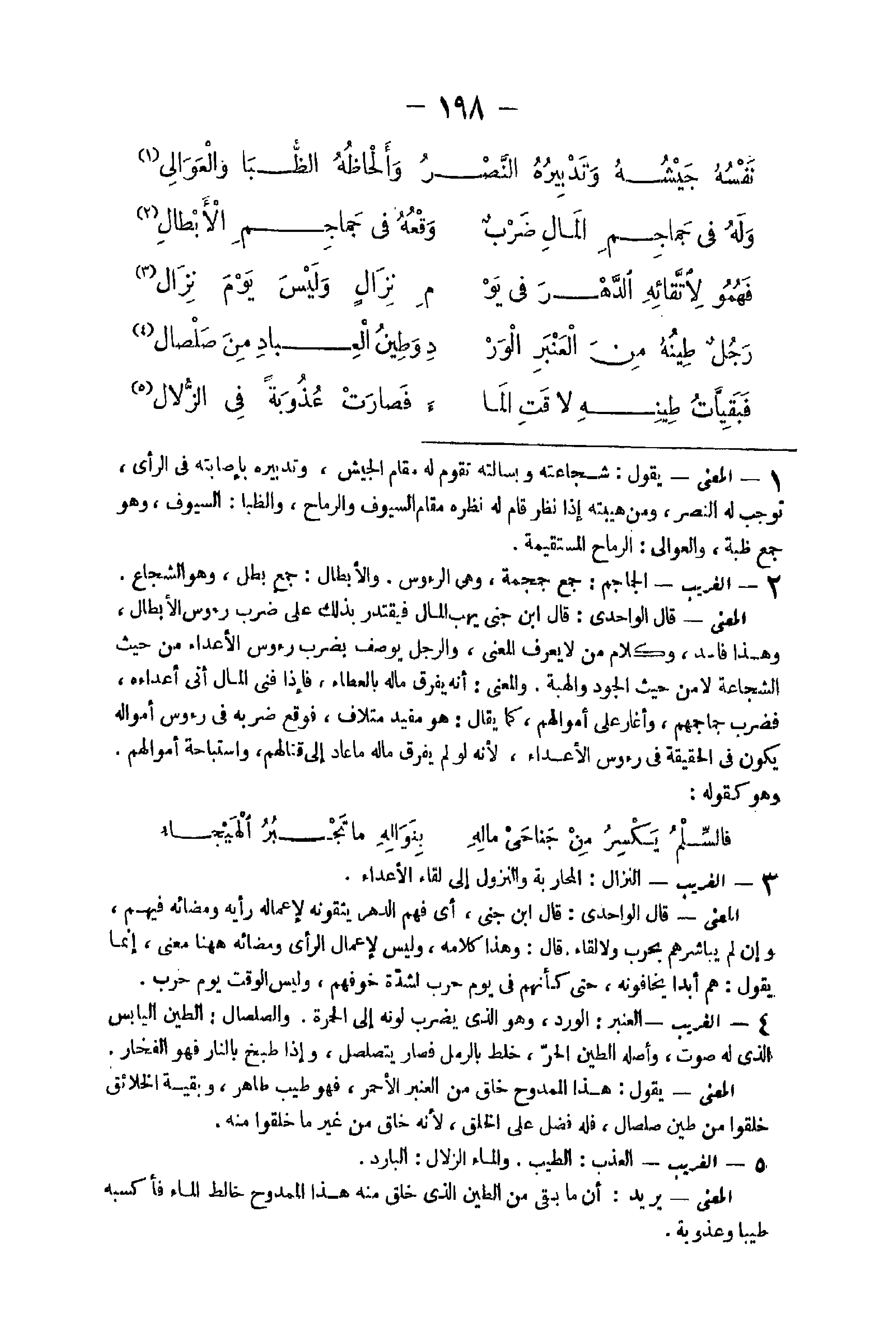 27 - الْغَرِيب النزال الْمُحَاربَة وَالنُّزُول إِلَى لِقَاء الْأَعْدَاء الْمَعْنى قَالَ الواحدي قَالَ ابْن جني أَي فهم الدَّهْر يتقونه لإعماله رَأْيه ومضائه فيهم وَإِن لم يباشرهم بِحَرب وَلَا لِقَاء قَالَ وَهَذَا كَلَامه وَلَيْسَ لإعمال الرَّأْي ومضائه هَاهُنَا معنى إِنَّمَا يَقُول هم أبدا يخافونه حَتَّى كَأَنَّهُمْ فِي وَيَوْم حَرْب لشدَّة خوفهم وَلَيْسَ الْوَقْت يَوْم حَرْب