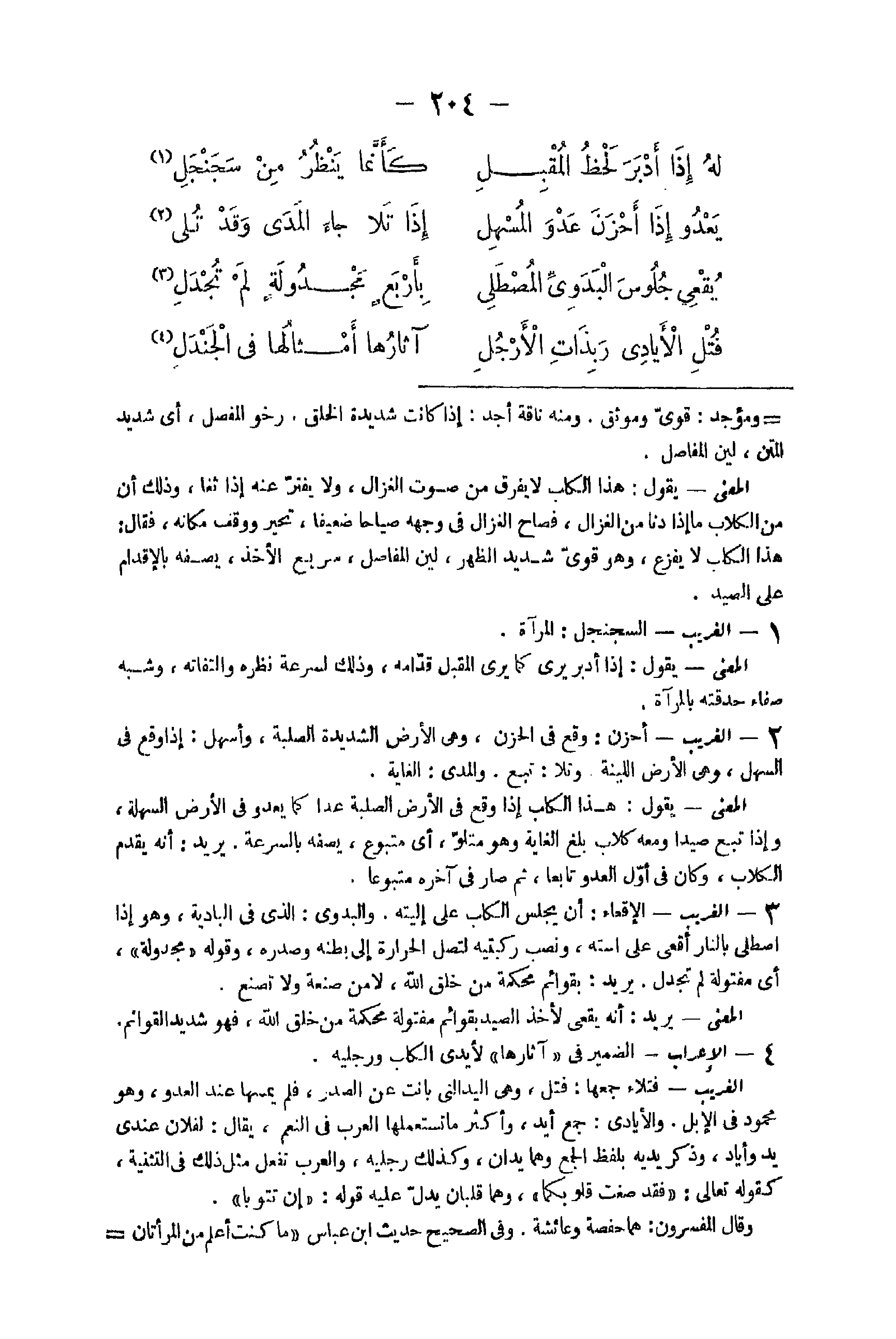 12 - الْإِعْرَاب الضَّمِير فِي آثارها لأيدي الْكَلْب وَرجلَيْهِ الْغَرِيب فتلاء جمعهَا فتل وَهِي الْيَد الَّتِي بَانَتْ عَن الصَّدْر فَلم يَمَسهَا عِنْد الْعَدو وَهُوَ مَحْمُود فِي الْإِبِل والأيادي جمع أيد وَأكْثر مَا تستعملها الْعَرَب فِي النعم يُقَال لفُلَان عِنْدِي يَد وأياد وَذكر يَدَيْهِ بِلَفْظ الْجمع وهما يدان وَكَذَلِكَ رجلَيْهِ وَالْعرب تفعل مثل ذَلِك فِي التَّثْنِيَة كَقَوْلِه تَعَالَى {فقد صغت قُلُوبكُمَا} وهما قلبان يدل عَلَيْهِ قَول {إِن تَتُوبَا} وَقَالَ الْمُفَسِّرُونَ هما حَفْصَة وَعَائِشَة وَفِي الصَّحِيح الحَدِيث