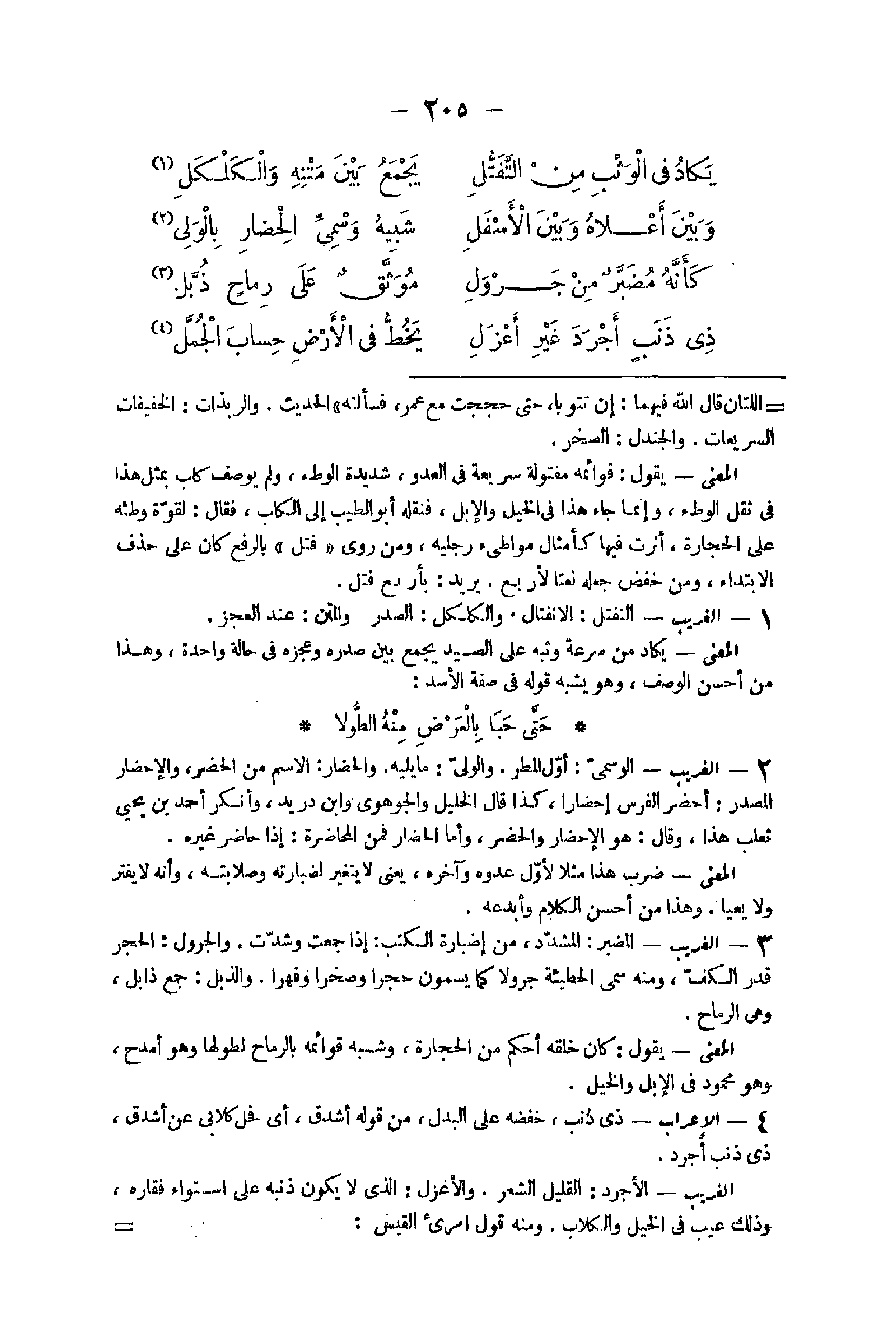 15 - الْغَرِيب المضبر المشدد من إضبار الْكتب إِذا جمعت وشدت والجرول الْحجر قدر الْكَفّ وَمِنْه سمي الحطيئة جرولا كَمَا يسمون حجرا وصخرا وفهرا والذبل جمع ذابل وَهِي الرماح الْمَعْنى يَقُول كَانَ خلقه أحكم من الْحِجَارَة وَشبه قوائمه بِالرِّمَاحِ لطولها وَهُوَ أمدح وَهُوَ مَحْمُود فِي الْإِبِل وَالْخَيْل