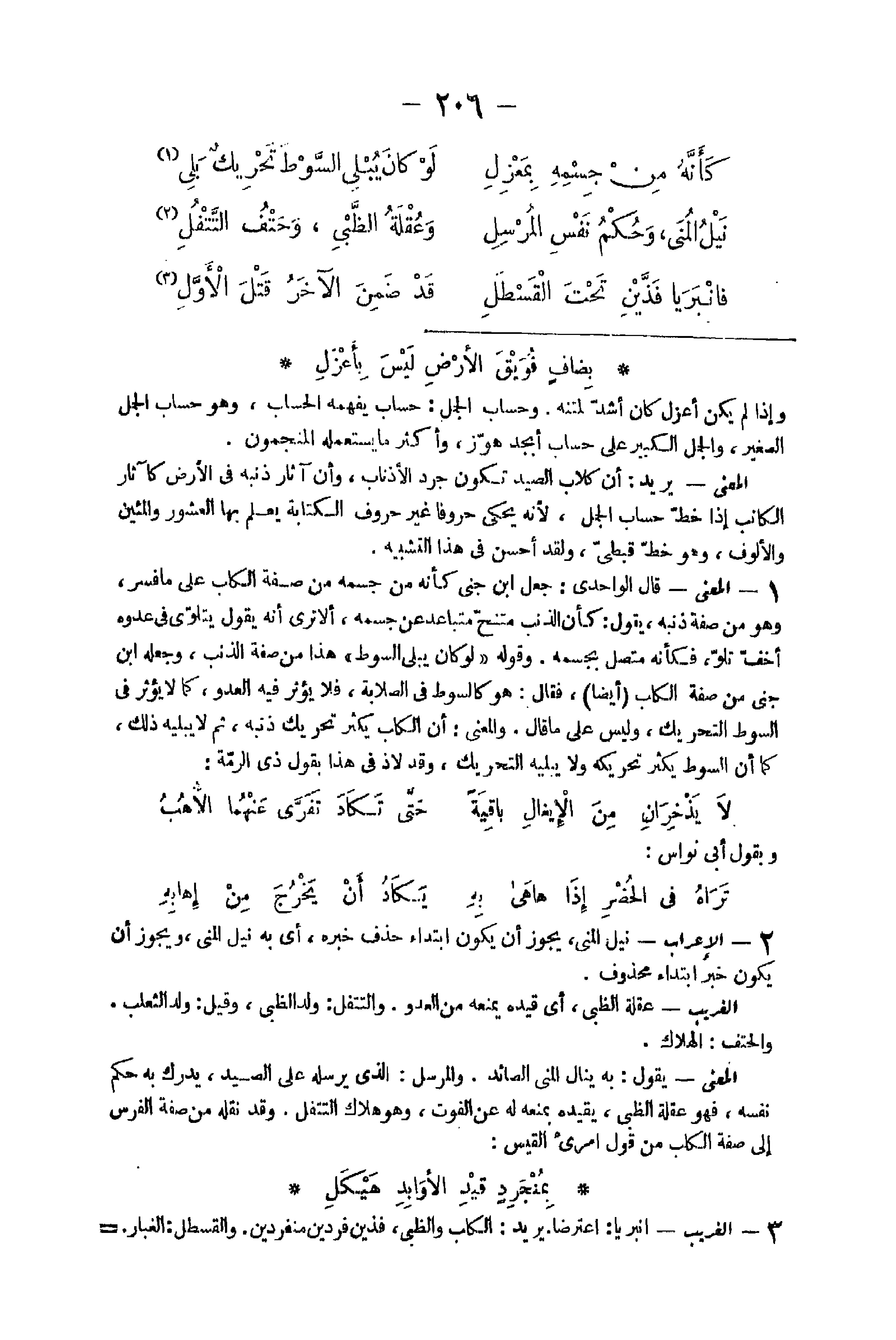 وَإِذا لم يكن أعزل كَانَ أَشد لمتنه وحساب الْجمل حِسَاب يفهمهُ الْحساب وَهُوَ حِسَاب الْجمل الصَّغِير والجمل الْكَبِير على حِسَاب أبجد هوز وَأكْثر مَا يَسْتَعْمِلهُ المنجمون الْمَعْنى يُرِيد أَن كلاب الصَّيْد تكون جرد الأذناب وَأَن آثَار ذَنبه فِي الأَرْض كآثار الْكَاتِب إِذا خطّ حِسَاب الْجمل لِأَنَّهُ يَحْكِي حروفا غير حُرُوف الْكِتَابَة يعلم بهَا العشور والمتين والألوف وَهُوَ خطّ قبْطِي وَلَقَد أحسن فِي هَذَا التَّشْبِيه