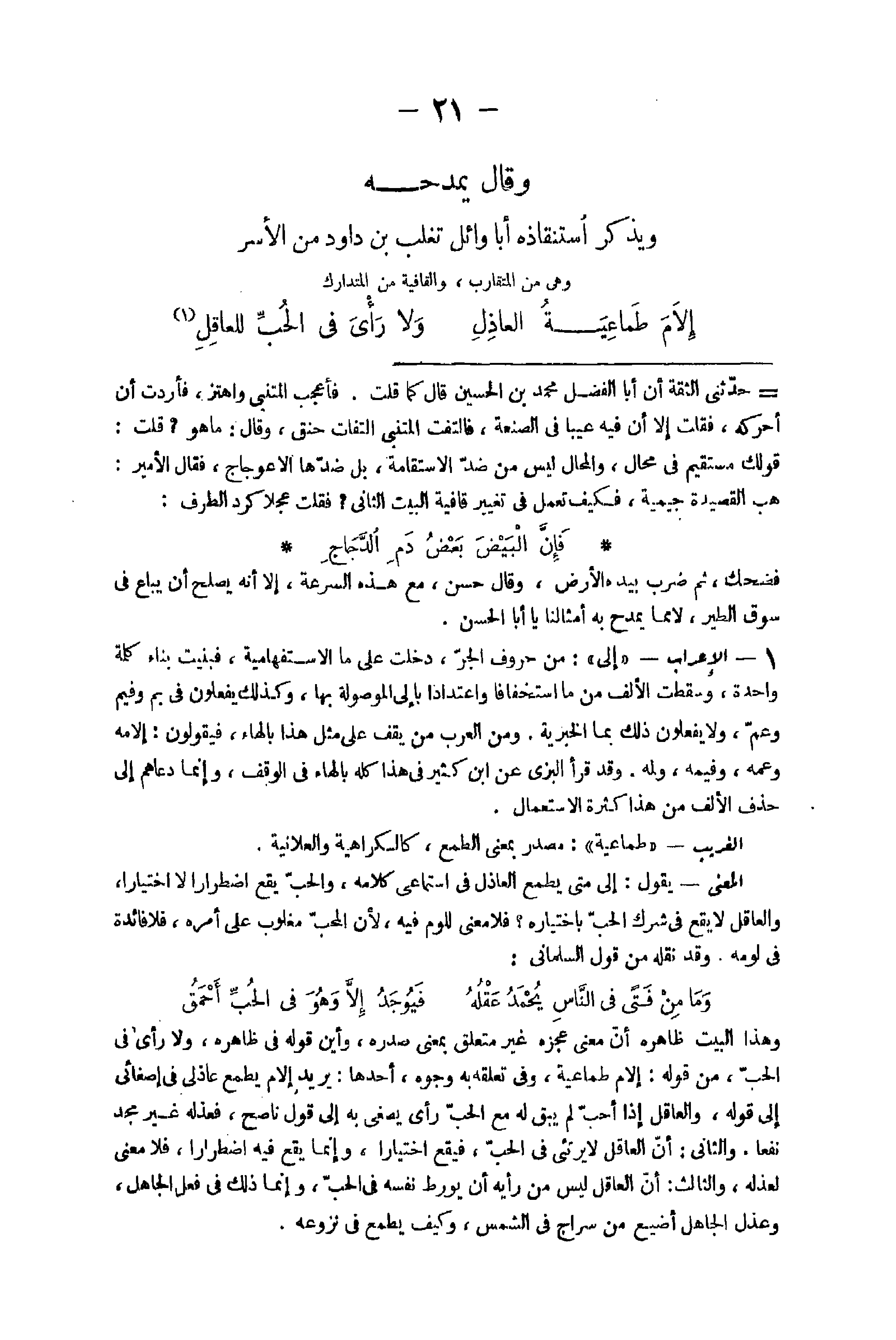 - 1 الْإِعْرَاب إِلَى من حُرُوف الْجَرّ دخلت على مَا الاستفهامية فبينت بِنَاء كلمة وَاحِدَة وَسَقَطت الْألف من مَا اسْتِخْفَافًا واعتداد بإلى الموصولة بهَا وَكَذَلِكَ يَفْعَلُونَ فِي بِمَ وفيم وَعم وَلَا يَفْعَلُونَ ذَلِك بِمَا الخبرية وَمن الْعَرَب من يقف على مثل هَذَا بِالْهَاءِ فَيَقُولُونَ إلامه وَعَمه وفيمه ولمه وَقد قَرَأَ البزي عَن ابْن كثير فِي هَذَا كُله بِالْهَاءِ فِي الوفق وَإِنَّمَا دعاهم إِلَى حذف الْألف من هَذَا كَثْرَة الِاسْتِعْمَال الْغَرِيب طماعية مصدر بِمَعْنى الطمع كالكراهية وَالْعَلَانِيَة الْمَعْنى يَقُول إِلَى مَتى يطْمع العاذل فِي استماعي كَلَامه وَالْحب يَقع اضطرارا لَا اخْتِيَارا والعاقل لَا يَقع فِي شرك الْحبّ بِاخْتِيَارِهِ فَلَا معنى للوم فِيهِ لِأَن الْمُحب مغلوب على أمره فَلَا فَائِدَة فِي لومه وَقد نَقله من قَول السَّلمَانِي