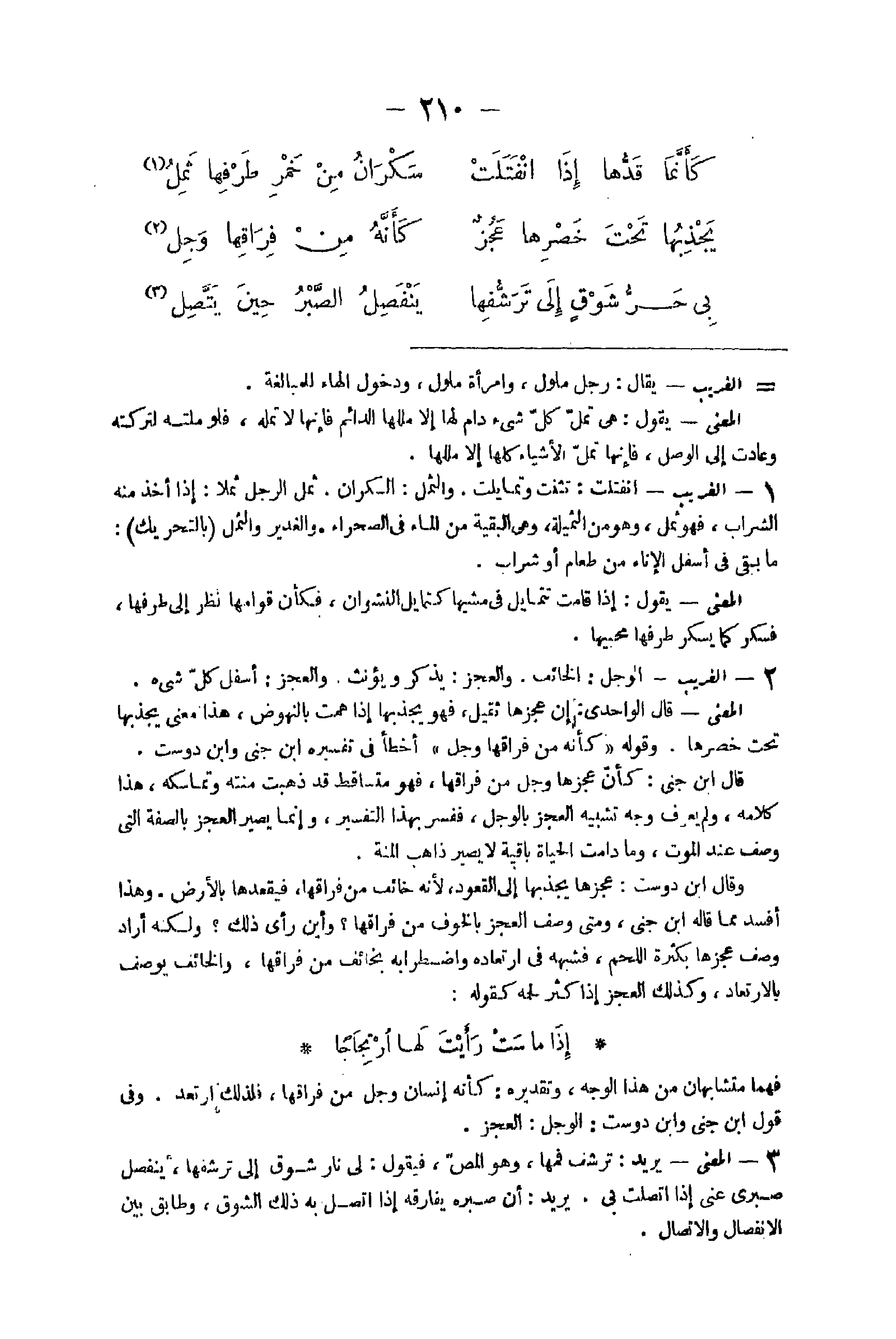3 - الْغَرِيب انفتلت تثنت وتمايلت والثمل السَّكْرَان ثمل الرجل ثملا إِذا أَخذ مِنْهُ الشَّرَاب فَهُوَ ثمل وَهُوَ من الثميلة وَهِي الْبَاقِيَة من المَاء فِي الصَّحرَاء والغدير والثمل بِالتَّحْرِيكِ مَا بَقِي فِي أَسْفَل الْإِنَاء من طَعَام أَو شراب الْمَعْنى يَقُول إِذا قَامَت تمايل فِي مشيها كتمايل النشوان فَكَأَن قوامها نظرا إِلَى طرفها فَسَكِرَ كَمَا يسكر طرفها محبيها