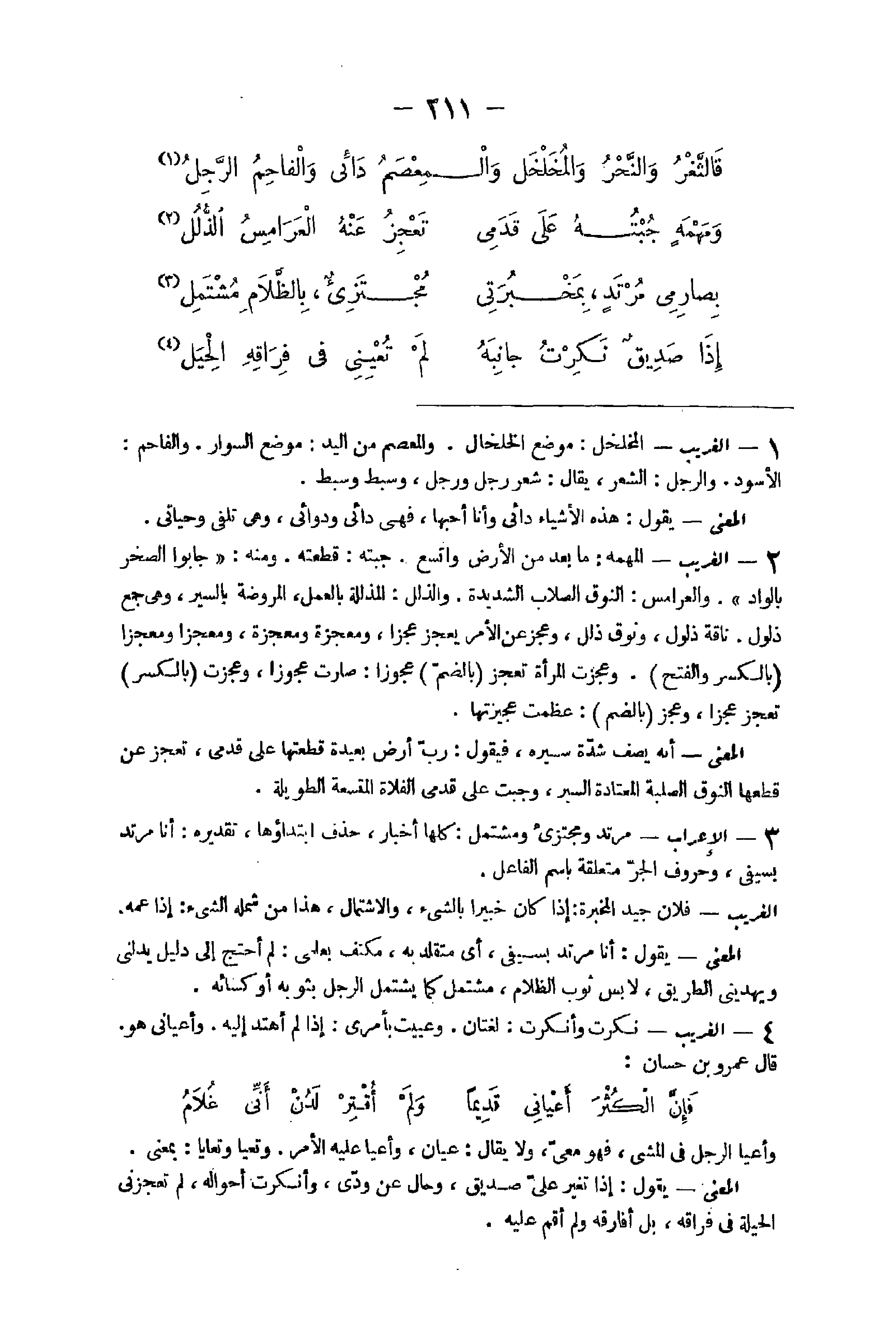 9 - الْغَرِيب نكرت وَأنْكرت لُغَتَانِ وعييت بأَمْري إِذا لم أهتد إِلَيْهِ وأعياني هُوَ قَالَ عَمْرو بن حسان