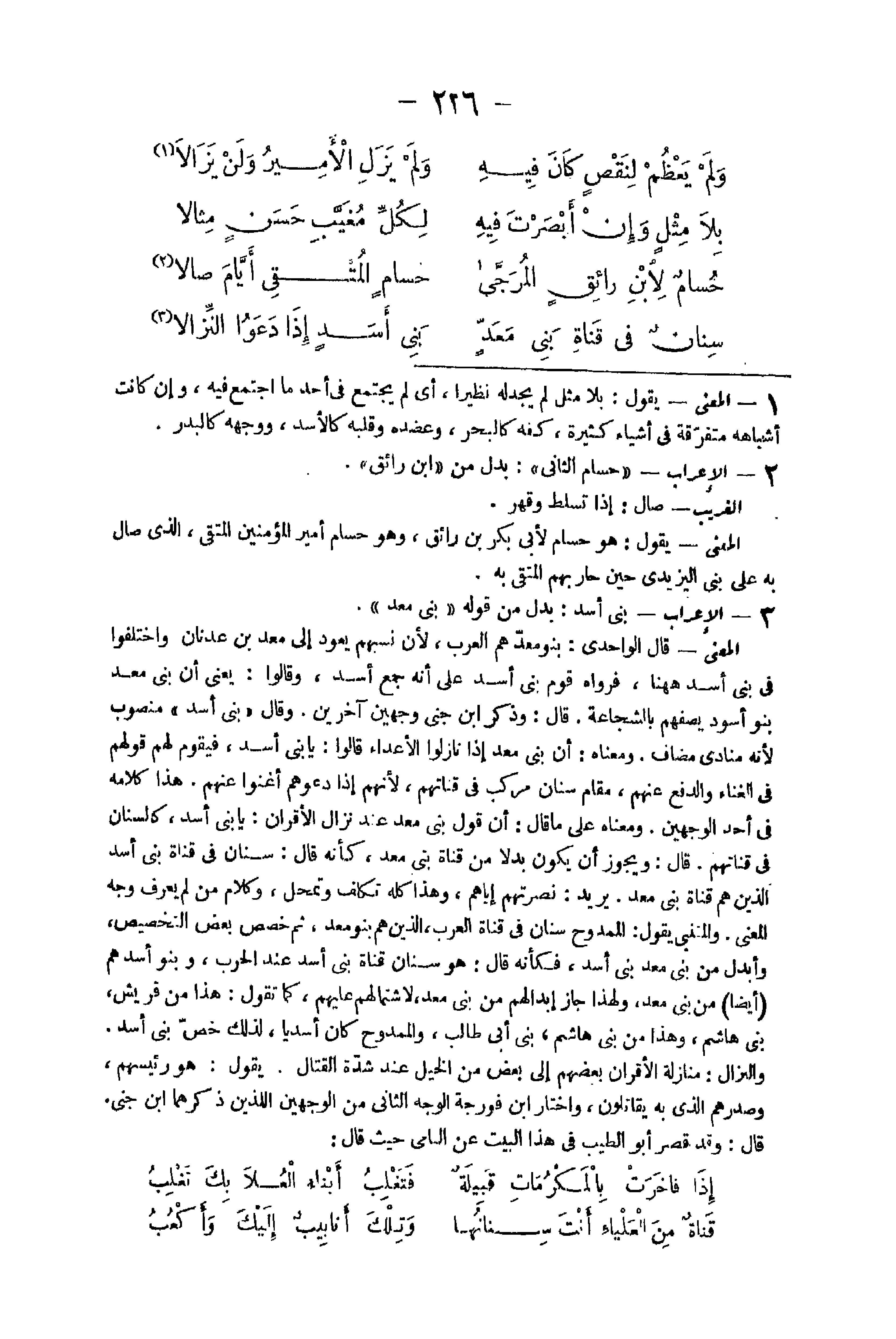 21 - الْإِعْرَاب بني أَسد بدل من قَوْله بني معد الْمَعْنى قَالَ الواحدي بَنو معد هم الْعَرَب لِأَن نسبهم يعود إِلَى معد بن عدنان وَاخْتلفُوا فِي بني أَسد هَهُنَا فَرَوَاهُ بنى أَسد على أَنه جمع أَسد وَقَالُوا يَعْنِي أَن بني معد بَنو أسود يصفهم بالشجاعة قَالَ وَذكر ابْن جنى وَجْهَيْن آخَرين وَقَالَ بني أَسد مَنْصُوب لِأَنَّهُ منادى مُضَاف وَمَعْنَاهُ أَن بني معد إِذا نازلوا الْأَعْدَاء قَالُوا يَا بني أَسد فَيقوم لَهُم قَوْلهم فِي الْغناء وَالدَّفْع عَنْهُم مقَام سِنَان مركب فِي قناتهم لأَنهم إِذا دعوهم أغنوا عَنْهُم هَذَا كَلَامه فِي أحد الْوَجْهَيْنِ وَمَعْنَاهُ على مَا قَالَ أَن قَول بني معد عِنْد نزال الأقران يَا بني أَسد كالسنان فِي قناتهم قَالَ وَيجوز أَن يكون بَدَلا من قناة بني معد كَأَنَّهُ قَالَ سِنَان فِي قناة بني أَسد الَّذين هم قناة بني معد يُرِيد نصرتهم إيَّاهُم وَهَذَا كُله تكلّف وتمحل وَكَلَام من لم يعرف وَجه الْمَعْنى والمتنبي يَقُول الممدوح سِنَان فِي قناة الْعَرَب الَّذين هم بَنو معد ثمَّ خصص بعض التَّخْصِيص وأبدل من بني معد بني أَسد فَكَأَنَّهُ قَالَ هُوَ سِنَان قناة بني أَسد عَن الْحَرْب وَبَنُو أَسد هم أَيْضا من بني معد وَلِهَذَا جَازَ إبدالهم من بني معد الأشتمالهم عَلَيْهِم كَمَا تَقول هَذَا من قُرَيْش بني هَاشم وَهَذَا من بني هَاشم بني أبي طَالب والممدوح كَانَ أسديا لذَلِك خص بني أَسد والنزال منازلة الأقران بَعضهم إِلَى بعض من الْخَيل عِنْد شدَّة الْقِتَال يَقُول هُوَ رئيسهم وصدرهم الَّذِي بِهِ يُقَاتلُون وَاخْتَارَ ابْن فورجة الْوَجْه الثَّانِي من الْوَجْهَيْنِ اللَّذين ذكرهمَا ابْن جنى قَالَ وَقد قصر أَبُو الطّيب فِي هَذَا الْبَيْت عَن النامي حَيْثُ قَالَ