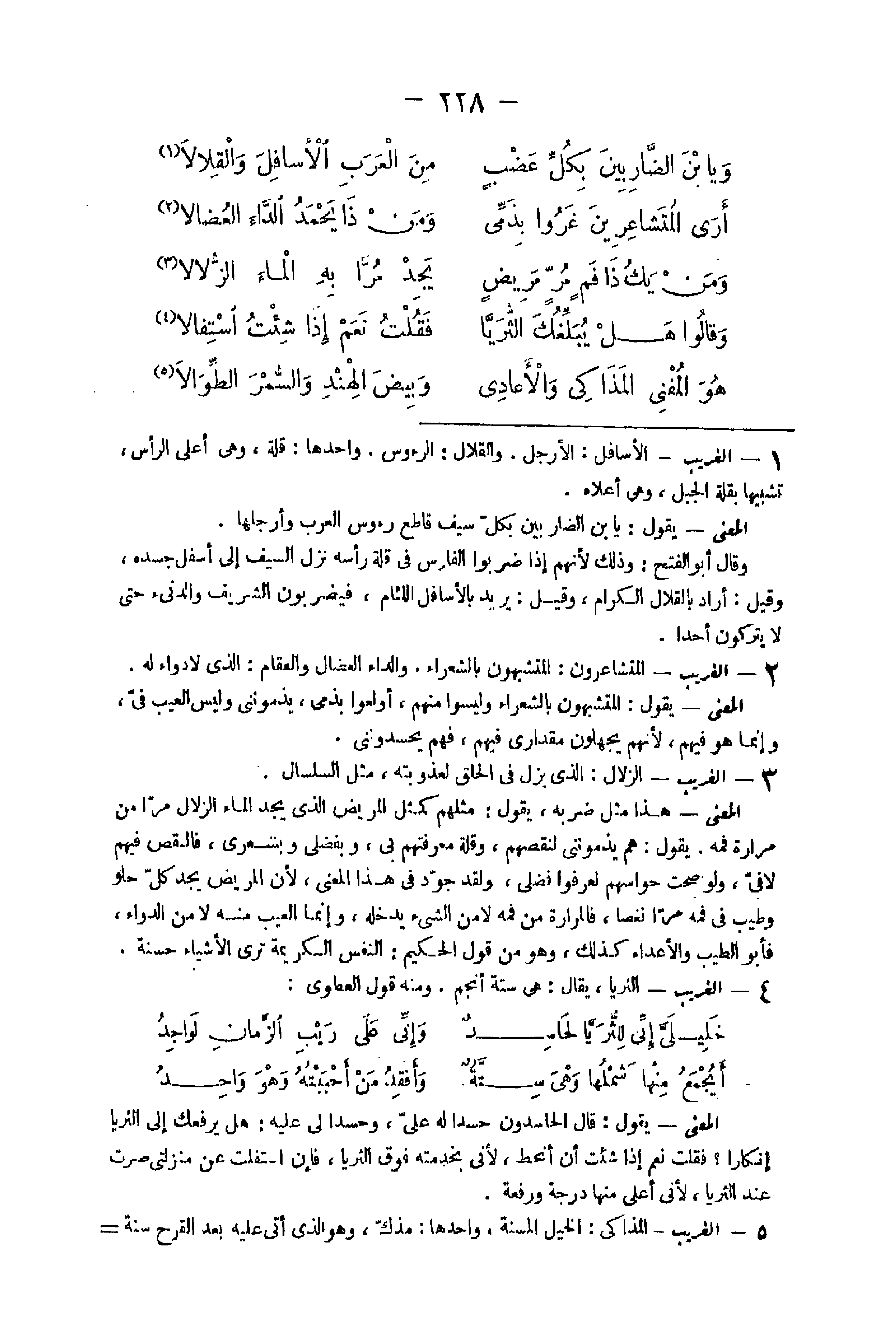 - الْغَرِيب الأسافل الارجل والقلال الرُّءُوس وَاحِدهَا قلَّة وَهِي أَعلَى الرَّأْس تشبيهها بقلة الْجَبَل وَهِي أَعْلَاهُ الْمَعْنى يَقُول يَا بن الضاربين بِكُل سيف قَاطع رُءُوس الْعَرَب وأرجلها وَقَالَ أَبُو الْفَتْح وَذَلِكَ لأَنهم إِذا ضربوا الْفَارِس فِي قلَّة رَأسه نزل السَّيْف إِلَى أَسْفَل جسده وَقيل أَرَادَ بالقلال الْكِرَام وَقيل يُرِيد بالأسافل اللئام فيضربون الشريف والدنيء حَتَّى لَا يتركون أحدا