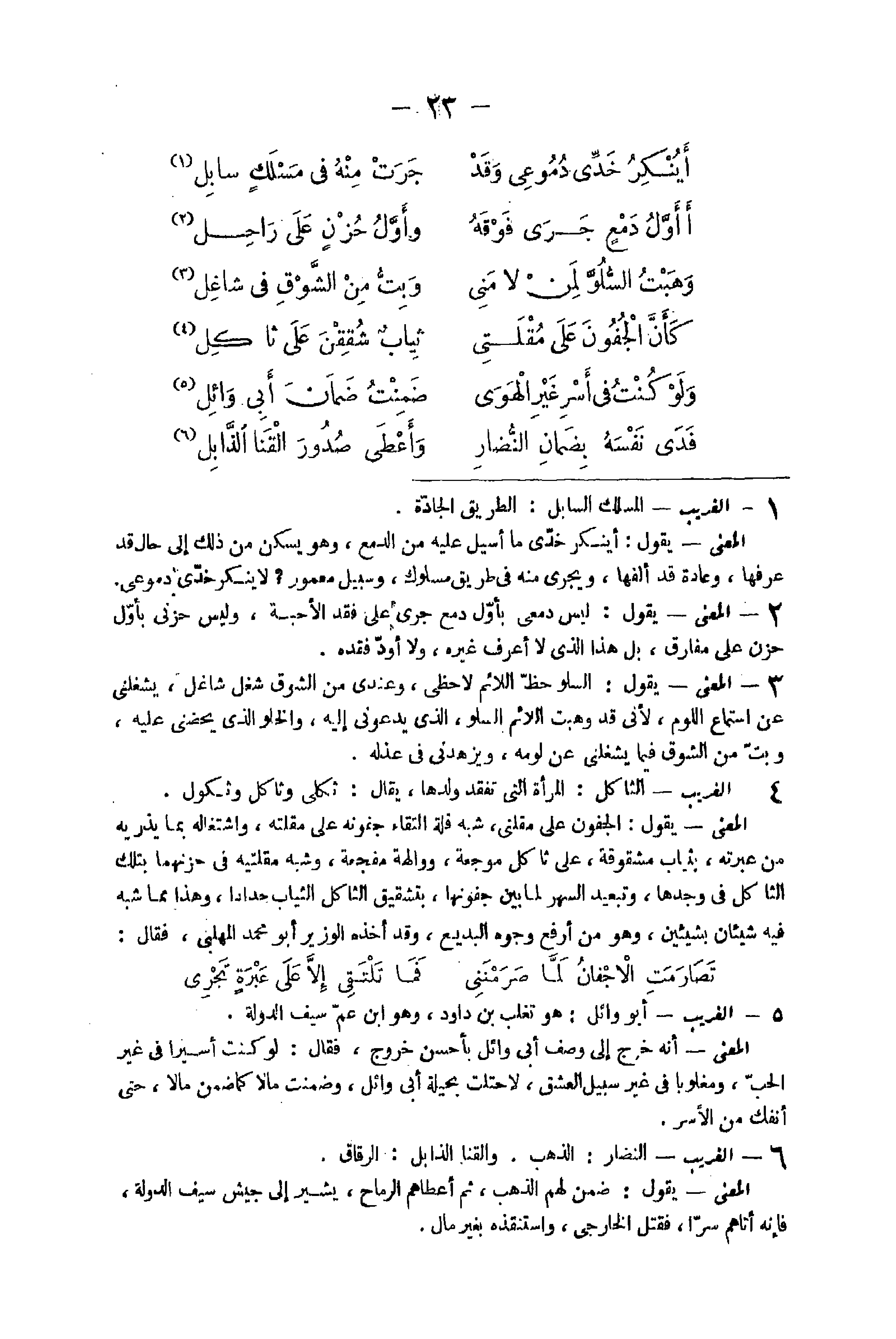 6 - الْمَعْنى يَقُول لَيْسَ دمعي بِأول دمع جرى على فقد الْأَحِبَّة وَلَيْسَ حزني بِأول حزن على مفارق بل هَذَا الَّذِي لَا أعرف غَيره وَلَا أود فَقده
