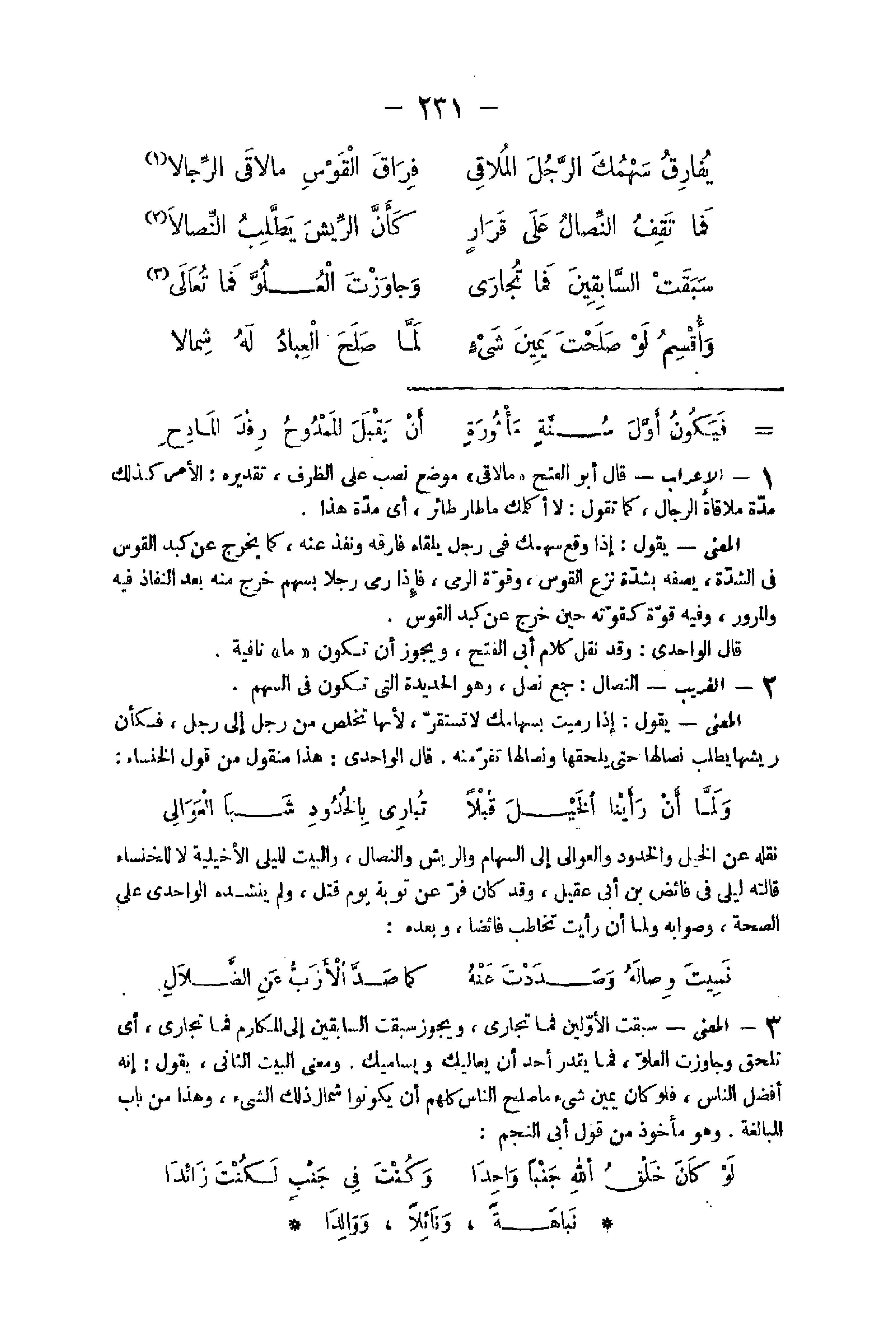 نَقله عَن الْخَيل وَالْحُدُود والعوالي إِلَى السِّهَام والريش والنصال وَالْبَيْت لليلى الأخيلية لَا للخنساء قالته ليلى فِي فائض بن أبي عقيل وَقد كَانَ فر عَن تَوْبَة يَوْم قتل وَلم ينشده الواحدي على الصِّحَّة وَصَوَابه وَلما أَن رَأَيْت تخاطب فائضا وَبعده