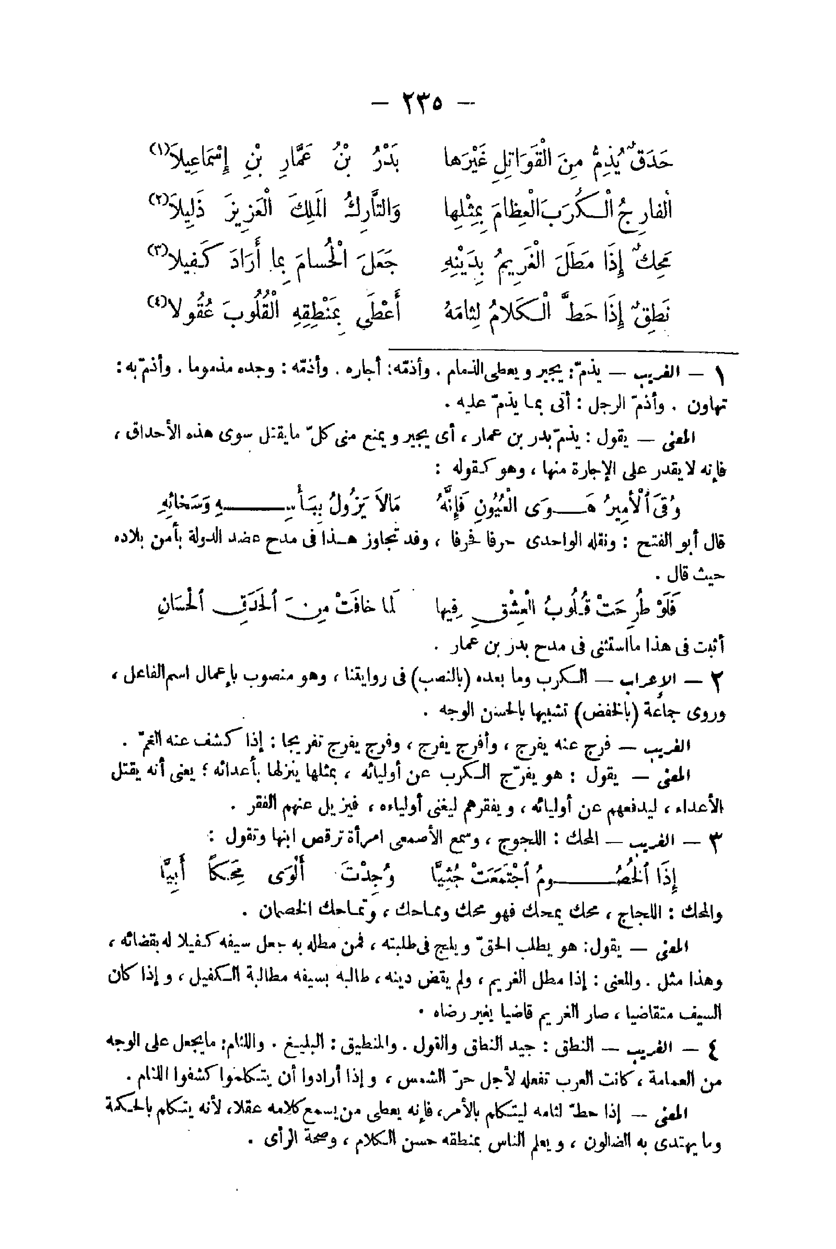10 - الْإِعْرَاب الكرب وَمَا بعده بِالنّصب فِي روايتنا وَهُوَ مَنْصُوب بإعمال اسْم الْفَاعِل وروى جمَاعَة بالخفض تَشْبِيها بالْحسنِ الْوَجْه الْغَرِيب فرج عَنهُ يفرج وَأَفْرج يفرج وَفرج يفرج تفريجا إِذا كشف عَنهُ الْغم الْمَعْنى يَقُول هُوَ يفرج الكرب عَن أوليائه بِمِثْلِهَا ينزلها بأعدائه يعْنى أَنه يقتل الْأَعْدَاء ليدفعهم عَن أوليائه ويفقرهم ليغنى أولياءه فيزيل عَنْهُم الْفقر