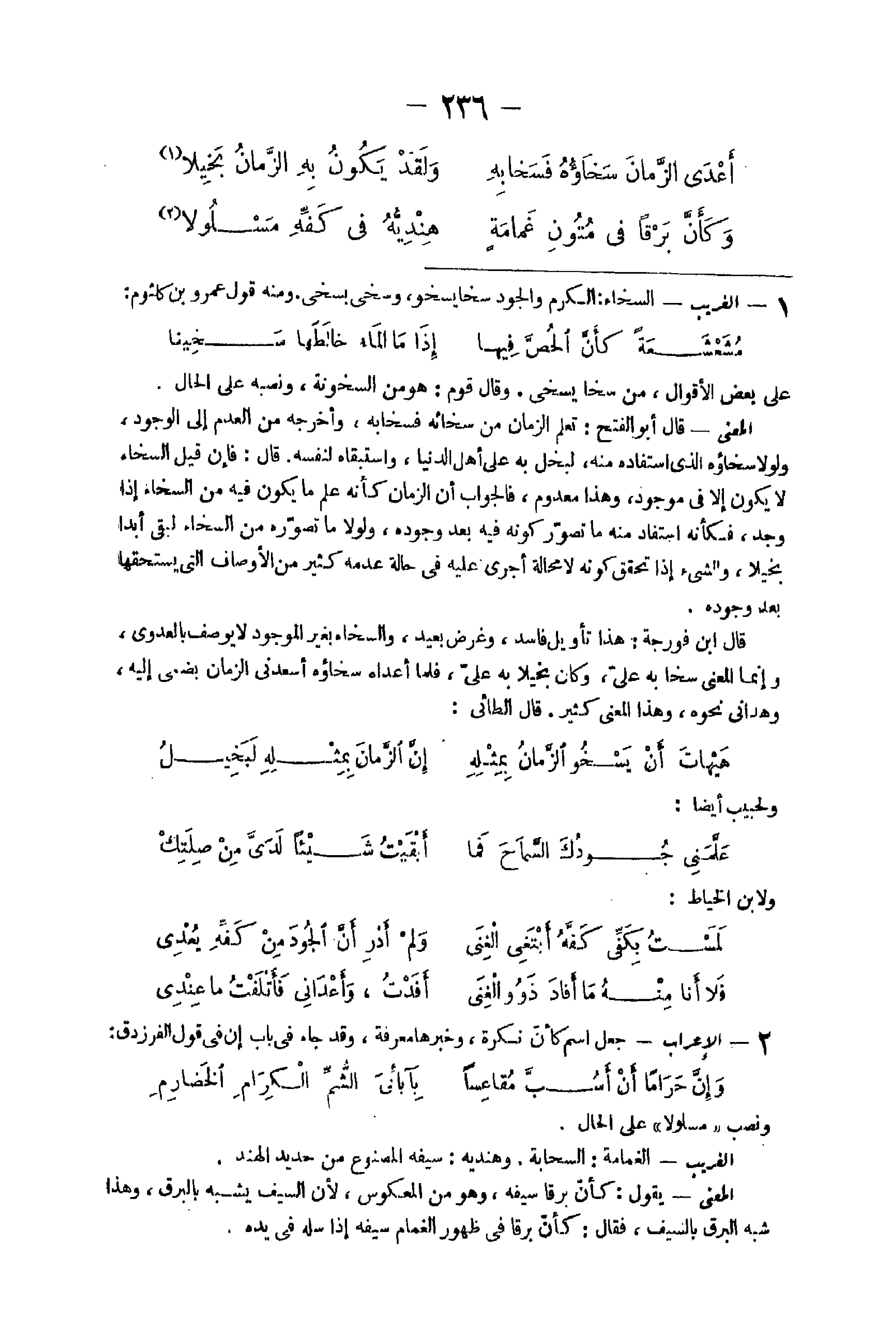 على بعض الْأَقْوَال من سخا يسخي وَقَالَ قوم هُوَ من السخونة ونصبه على الْحَال الْمَعْنى قَالَ أَبُو الْفَتْح تعلم الزَّمَان من سخائه فسخا بِهِ وَأخرجه من الْعَدَم إِلَى الْوُجُود وَلَوْلَا سخاءوه الَّذِي استفاده مِنْهُ لبخل بِهِ على أهل الدُّنْيَا واستبقاه لنَفسِهِ قَالَ فَإِن قيل السخاء لَا يكون إِلَّا فِي مَوْجُود وَهَذَا مَعْدُوم فَالْجَوَاب أَن الزَّمَان كَأَنَّهُ علم مَا يكون فِيهِ من السخاء إِذا وجد فَكَأَنَّهُ اسْتَفَادَ مِنْهُ مَا تصور كَونه فِيهِ بعد وجوده وَلَوْلَا مَا تصَوره من السخاء لبقي أبدا بَخِيلًا وَالشَّيْء إِذا تحقق كَونه لَا محَالة أجري عَلَيْهِ فِي حَالَة عَدمه كثير من الْأَوْصَاف الَّتِي يَسْتَحِقهَا بعد وجوده قَالَ ابْن فورجة هَذَا تَأْوِيل فَاسد وغرض بعيد والسخاء بِغَيْر الْمَوْجُود لَا يُوصف بالعدوى وَإِنَّمَا الْمَعْنى سخا بِهِ على وَكَانَ بَخِيلًا بِهِ على فَلَمَّا أعداه سخاؤه أسعدني الزَّمَان يضمي إِلَيْهِ وهداني تحوه وَهَذَا الْمَعْنى كثير قَالَ الطَّائِي