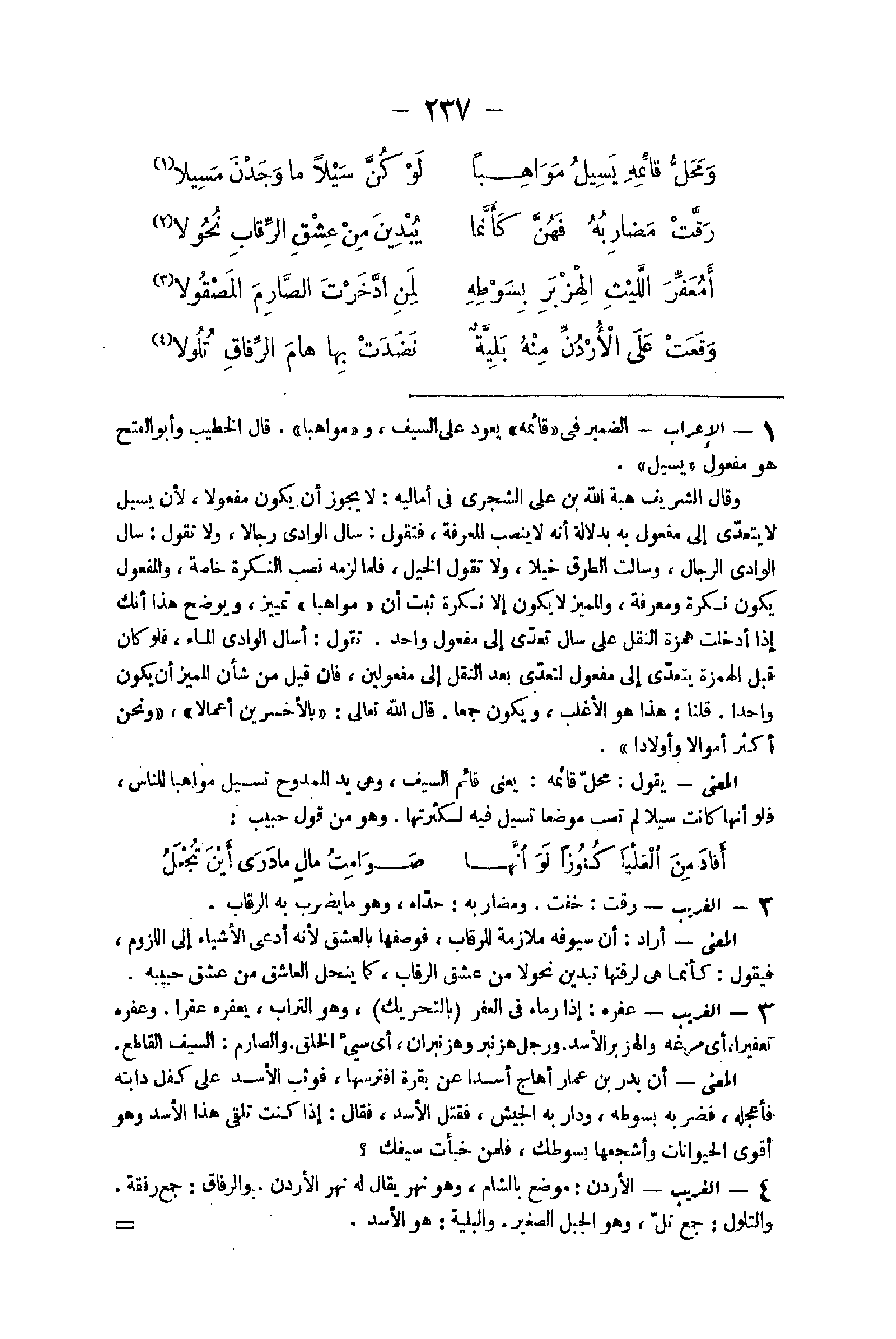 - الْإِعْرَاب الضَّمِير فِي قائمه يعود على السَّيْف ومواهبا قَالَ الْخَطِيب وَأَبُو الْفَتْح هُوَ مفعول يسيل وَقَالَ الشريف هبة الله بن عَليّ الشجري فِي أَمَالِيهِ لَا يجوز أَن يكون مَفْعُولا لِأَن يسيل لَا يتَعَدَّى إِلَى مفعول بِهِ بِدلَالَة أَنه لَا ينصب الْمعرفَة فَتَقول سَالَ الْوَادي رجَالًا وَلَا تَقول سَالَ الْوَادي الرِّجَال وسالت الطّرق خيلا وَلَا تَقول الْخَيل فَلَمَّا لزمَه نصب النكرَة خَاصَّة وَالْمَفْعُول يكون نكرَة وَمَعْرِفَة والمميز لَا يكون إِلَّا نكرَة ثَبت أَن مواهبا تَمْيِيز ويوضح هَذَا أَنَّك إِذا أدخلت همزَة النَّقْل على سَالَ تعدِي إِلَى مفعول وَاحِد تَقول أسَال الوادى المَاء فاو كَانَ قبل الْهمزَة يتَعَدَّى إِلَى مفعول لتعدي بعد النَّقْل إِلَى مفعولين فَإِن قيل من شَأْن الْمُمَيز أَن يكون وَاحِد قُلْنَا هَذَا هُوَ الْأَغْلَب وَيكون جمعا قَالَ الله تَعَالَى {بالأخسرين أعمالا} و {نَحن أَكثر أَمْوَالًا وأولادا} الْمَعْنى يَقُول مَحل قائمه يَعْنِي قَائِم السَّيْف وَهِي يَد الممدوح تسيل مواهبا للنَّاس فَلَو أَنَّهَا كَانَت سيلا لم تصب موضعا تسيل فِيهِ لكثرتها وَهُوَ من قَول حبيب
