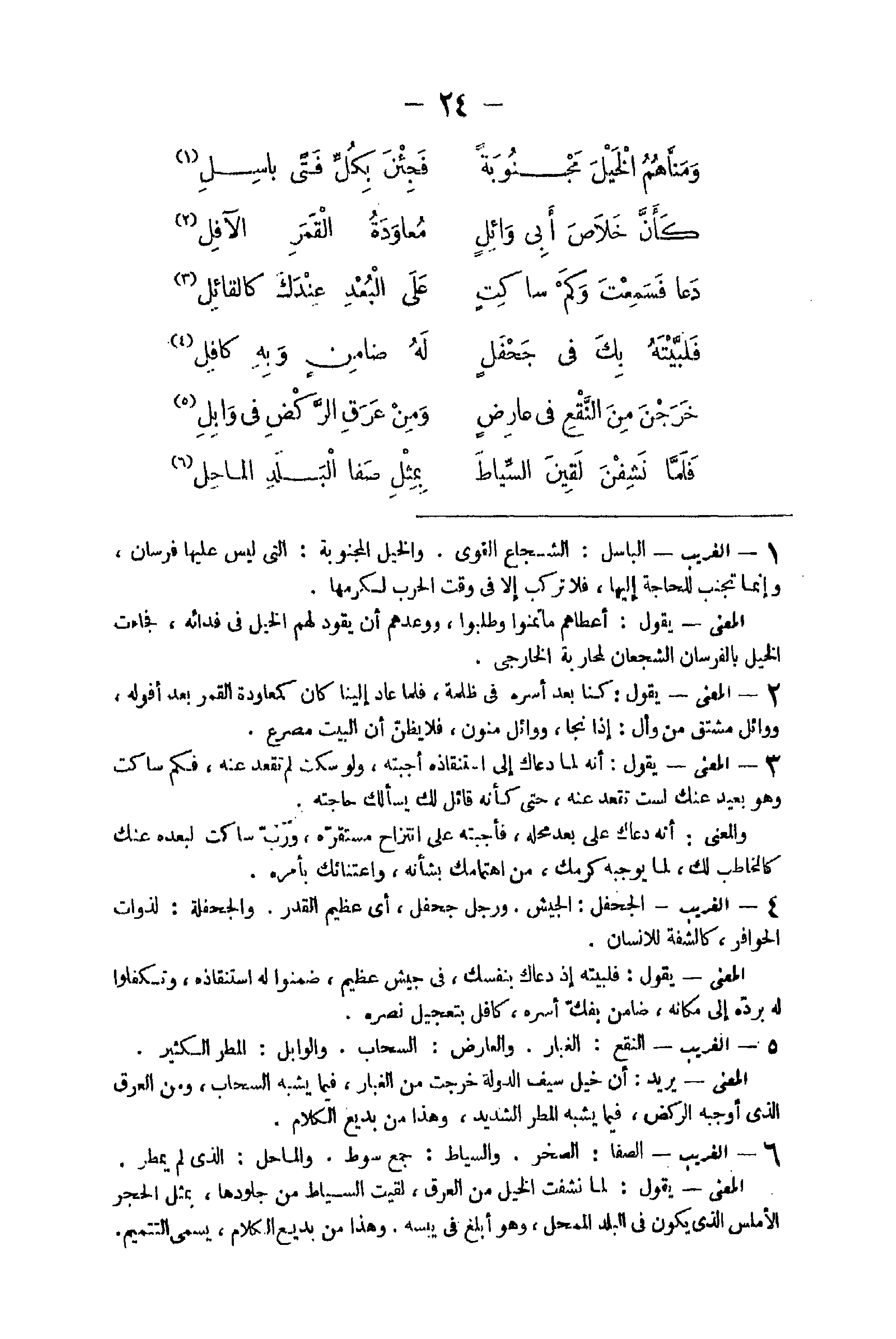 16 - الْغَرِيب الصَّفَا الصخر والسياط جمع سَوط والماحل الَّذِي لم يمطر الْمَعْنى يَقُول لما نشفت الْخَيل من الْعرق لقِيت السِّيَاط من جلودها بِمثل الْحجر الأملس الَّذِي يكون فِي الْبَلَد الممحل وَهُوَ أبلغ فِي يبسه وَهَذَا من بديع الْكَلَام يُسمى التتميم