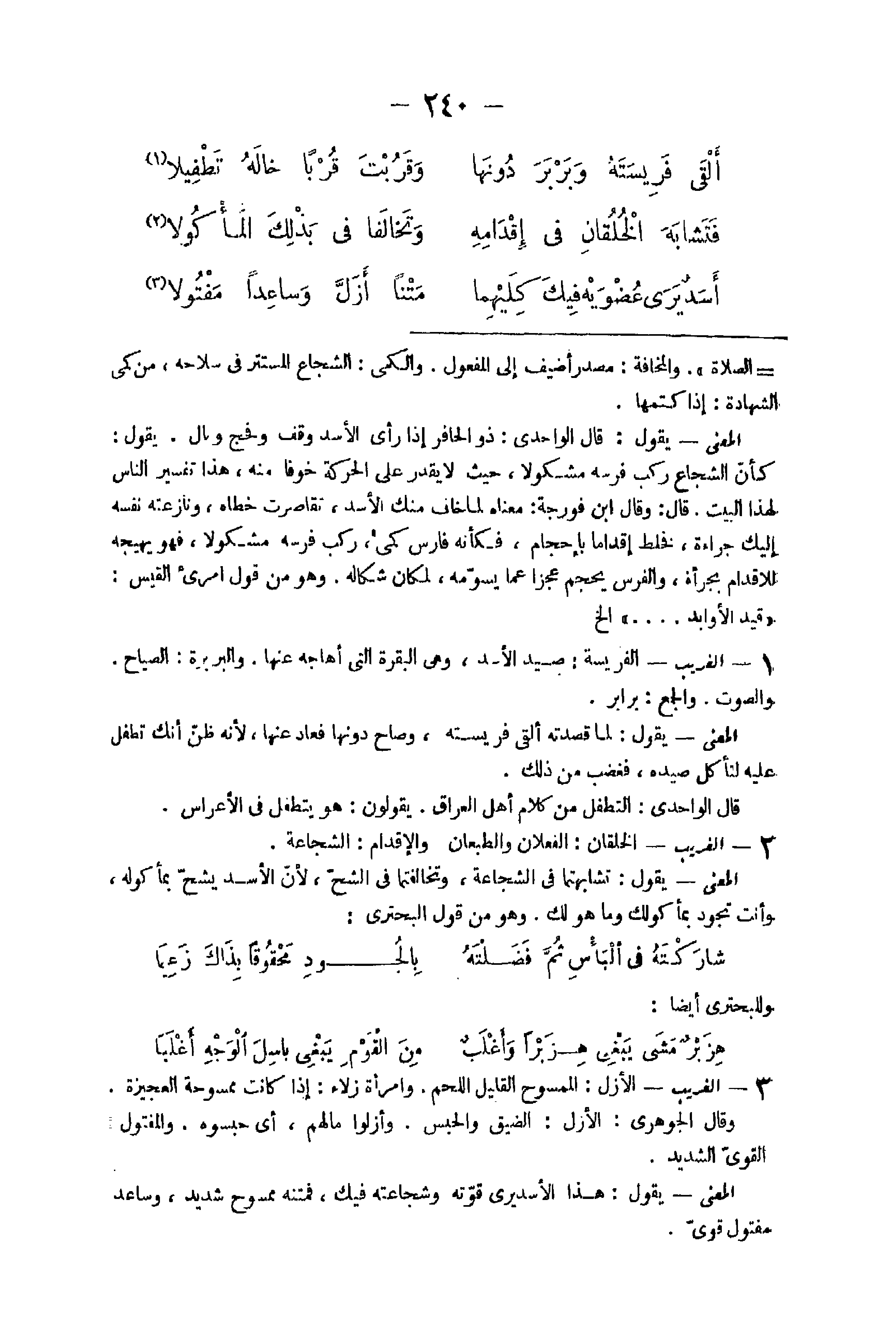 29 - الْغَرِيب الْأَزَل الْمَمْسُوح الْقَلِيل اللَّحْم وَامْرَأَة زلاء إِذا كنت ممسوحة العجيزة وَقَالَ الْجَوْهَرِي الْأَزَل الضّيق وَالْحَبْس وأزلوا مَا لَهُم أَي حبسوه والمفتول الْقوي الشَّديد الْمَعْنى يَقُول هَذَا الْأسد يرى قوته وشجاعته فِيك فمتنه مَمْسُوح شَدِيد وساعده مفتول قوي