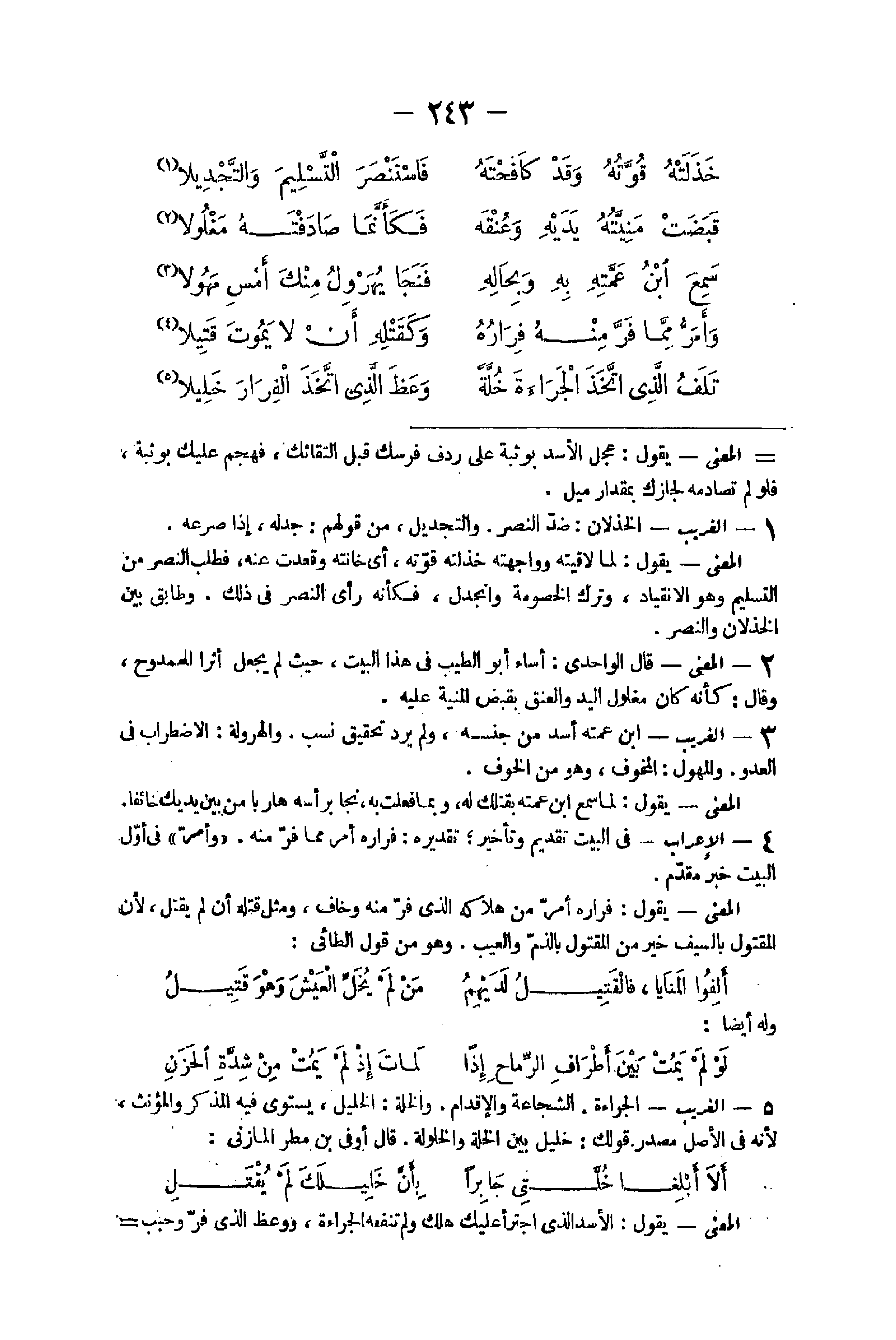 39 - الْغَرِيب الخذلان ضد النَّصْر والتجديل من قَوْلهم جدله إِذا صرعه الْمَعْنى يَقُول لما لاقيته وواجهته خذلته قوته أَي خانته وَقَعَدت عَنهُ فَطلب النَّصْر من التَّسْلِيم وَهُوَ الانقياد وَترك الْخُصُومَة وانجدل فَكَأَنَّهُ رأى النَّصْر فِي ذَلِك وطابق بَين الخذلان والنصر
