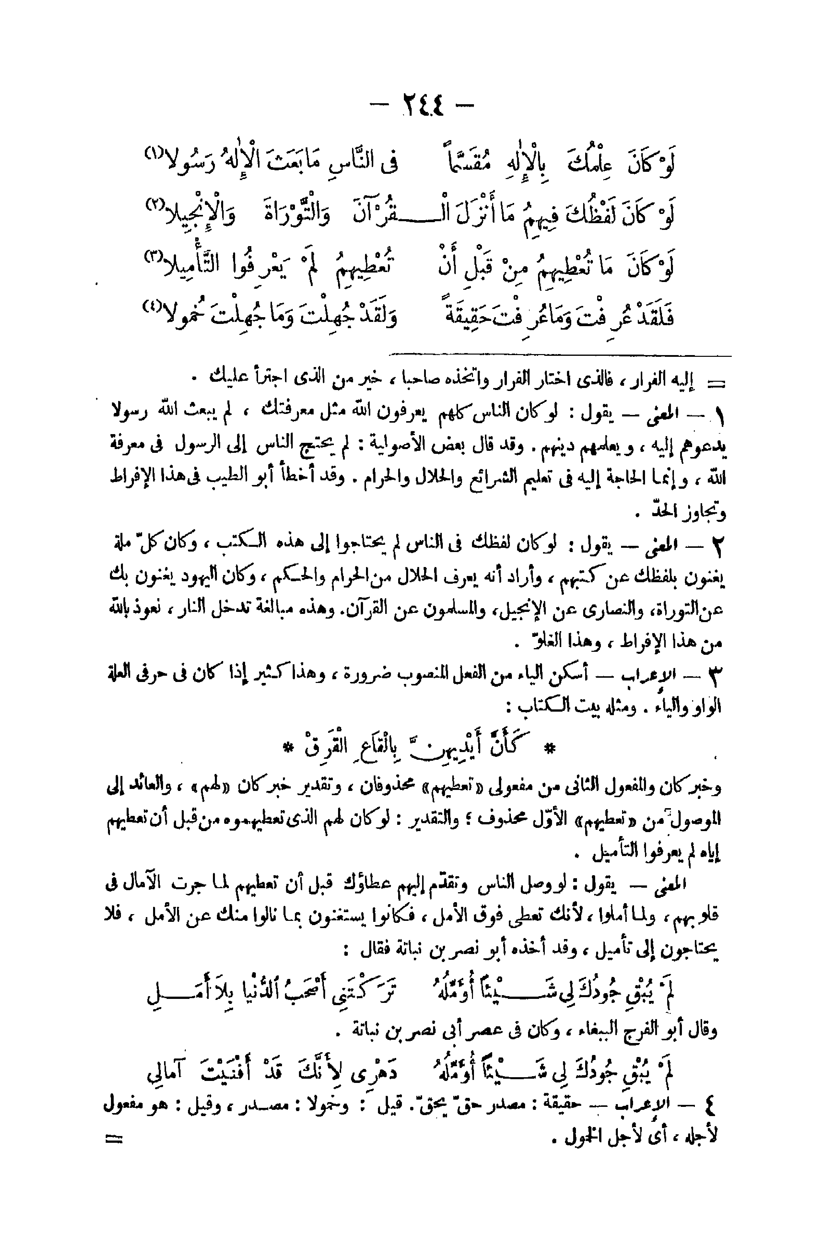 44 - الْمَعْنى يَقُول لَو كَانَ النَّاس كلهم يعْرفُونَ الله مثل معرفتك لم يبْعَث الله رَسُولا يَدعُوهُم إِلَيْهِ وَيُعلمهُم دينهم وَقد قَالَ بعض الْأُصُولِيَّة لم يحْتَج النَّاس إِلَى رَسُول فِي معرفَة الله وَإِنَّمَا الْحَاجة إِلَيْهِ فِي تَعْلِيم الشَّرَائِع والحلال وَالْحرَام وَقد أَخطَأ أَبُو الطّيب فِي هَذَا الإفراط وَتجَاوز الْحَد