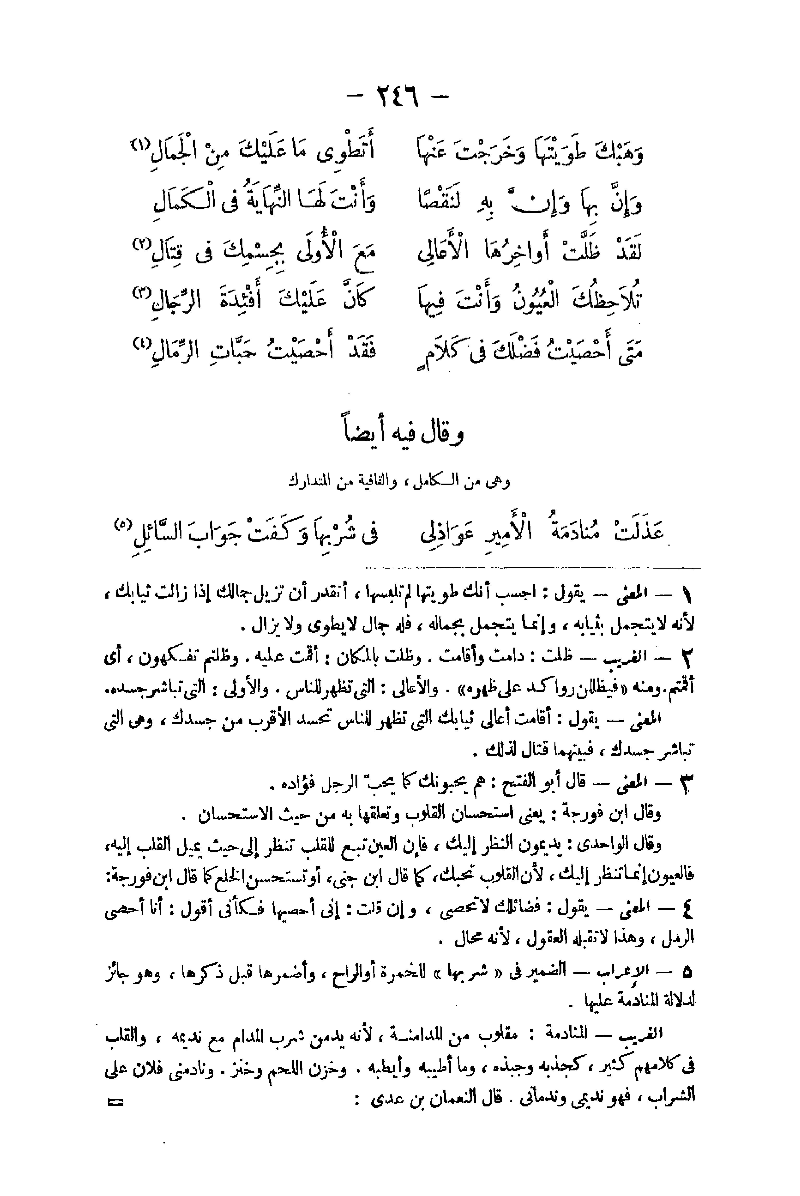 - 1 الْإِعْرَاب الضَّمِير فِي شربهَا للخمرة أَو الراح وأضمرها قبل ذكرهَا وَهُوَ جَائِز لدلَالَة المنادمة عَلَيْهَا الْغَرِيب المنادمة مقلوب من المدامنة لانه يدمن شرب المدام مَعَ نديمه وَالْقلب فِي كَلَامهم كثير كجذبه وحبذه وَمَا أطيبه وأيطبه وخزن اللَّحْم وخنز ونادمني فلَان على الشَّرَاب فَهُوَ نديمي وندماني قَالَ النُّعْمَان بن عدي