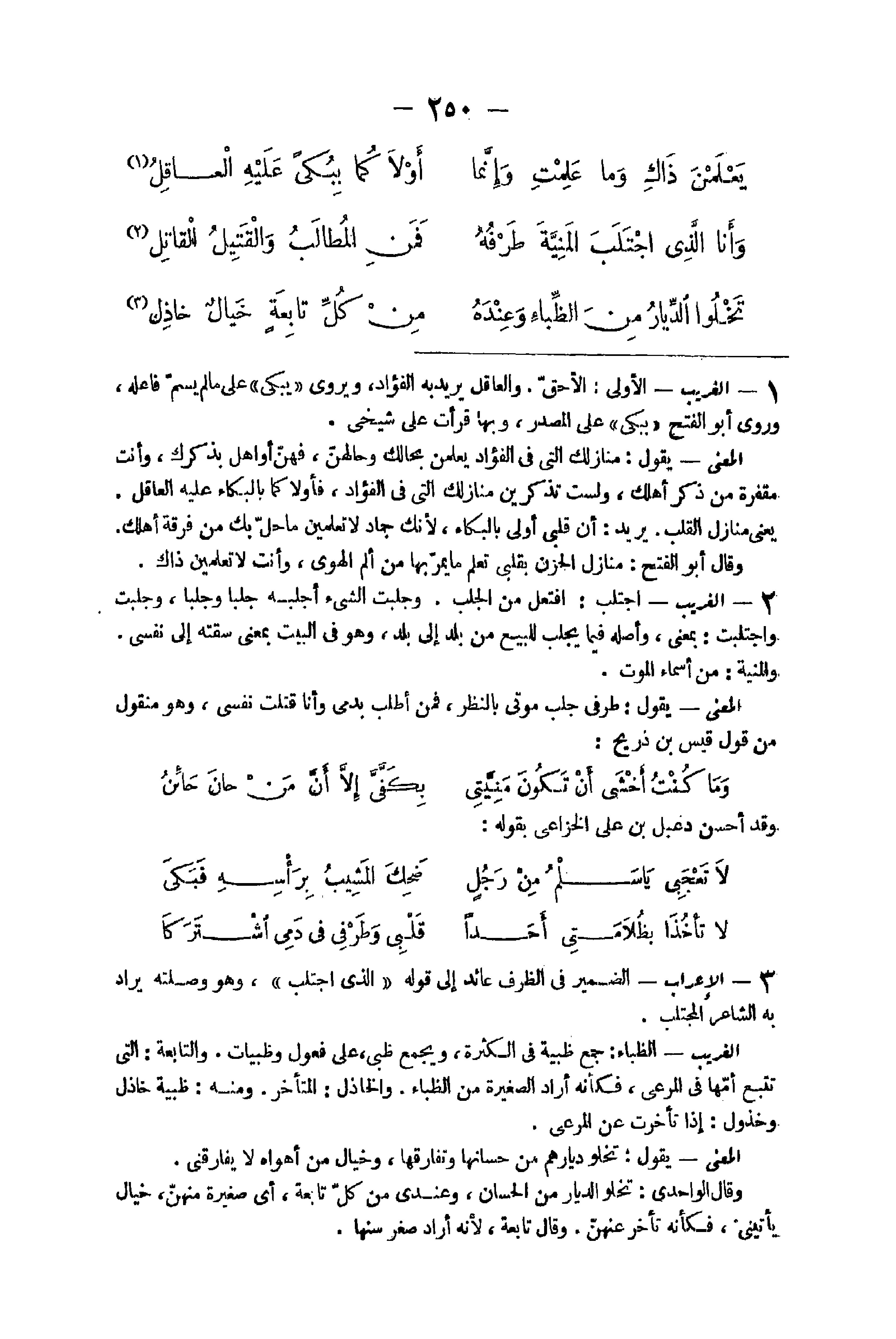 4 - الْإِعْرَاب الضَّمِير فِي الظّرْف عَائِدًا إِلَى قَوْله الَّذِي اجتلب وَهُوَ صلته يُرَاد بِهِ الشَّاعِر المجتلب الْغَرِيب الظباء جمع ظَبْيَة فِي الْكَثْرَة وَيجمع ظَبْي على فعول وظبيات والتابعة الَّتِي تتبع أمهَا فِي المرعى فَكَأَنَّهُ أَرَادَ الصَّغِيرَة من الظباء والخاذل الْمُتَأَخر وَمِنْه ظَبْيَة خاذل وخذول إِذا تَأَخَّرت عَن المرعى الْمَعْنى يَقُول تَخْلُو دِيَارهمْ من حسانها وتفارقها وخيال من أهواه لَا يفارقني وَقَالَ الواحدي تَخْلُو الديار من الحسان وَعِنْدِي من كل تَابِعَة أَي صَغِيرَة مِنْهُنَّ خيال يأتيني فَكَأَنَّهُ تَأَخّر عَنْهُن وَقَالَ تَابِعَة لِأَنَّهُ أَرَادَ صغر سنّهَا