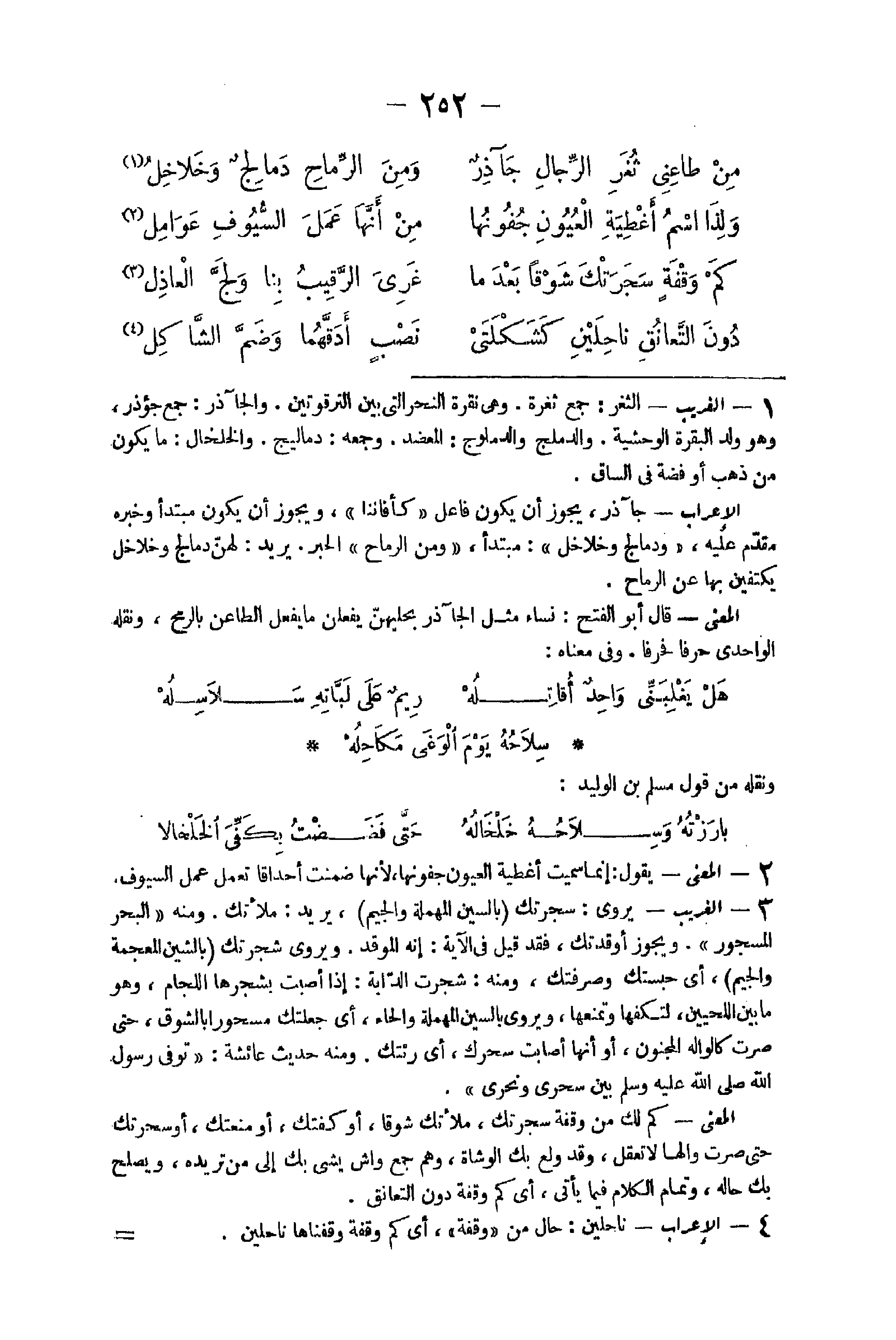 - الْغَرِيب الثغر جمع ثغرة وَهِي نقرة النَّحْر الَّتِي بَين الترقوتين والجآذر جمع جؤذر وَهُوَ ولد الْبَقَرَة الوحشية والدملج والدملوج المعضد وَجمعه دماليج والخلخال مَا يكون من ذهب أَو فِي فضَّة فِي السَّاق الْإِعْرَاب جآذر يجوز أَن يكون فَاعل كأفاننا وَيجوز ان يكون مُبْتَدأ وَخَبره مقدم عَلَيْهِ ودمالج وخلاخل مُبْتَدأ وَمن الرماح الْخَبَر يُرِيد لَهُنَّ دمالج وخلاخل يكتفين بهَا عَن الرماح الْمَعْنى قَالَ أَبُو الْفَتْح نسَاء مثل الجآذر بحليهن يفعلن مَا يفعل الطاعن بِالرُّمْحِ وَنَقله الواحدي حرفا فحرفا وَفِي مَعْنَاهُ