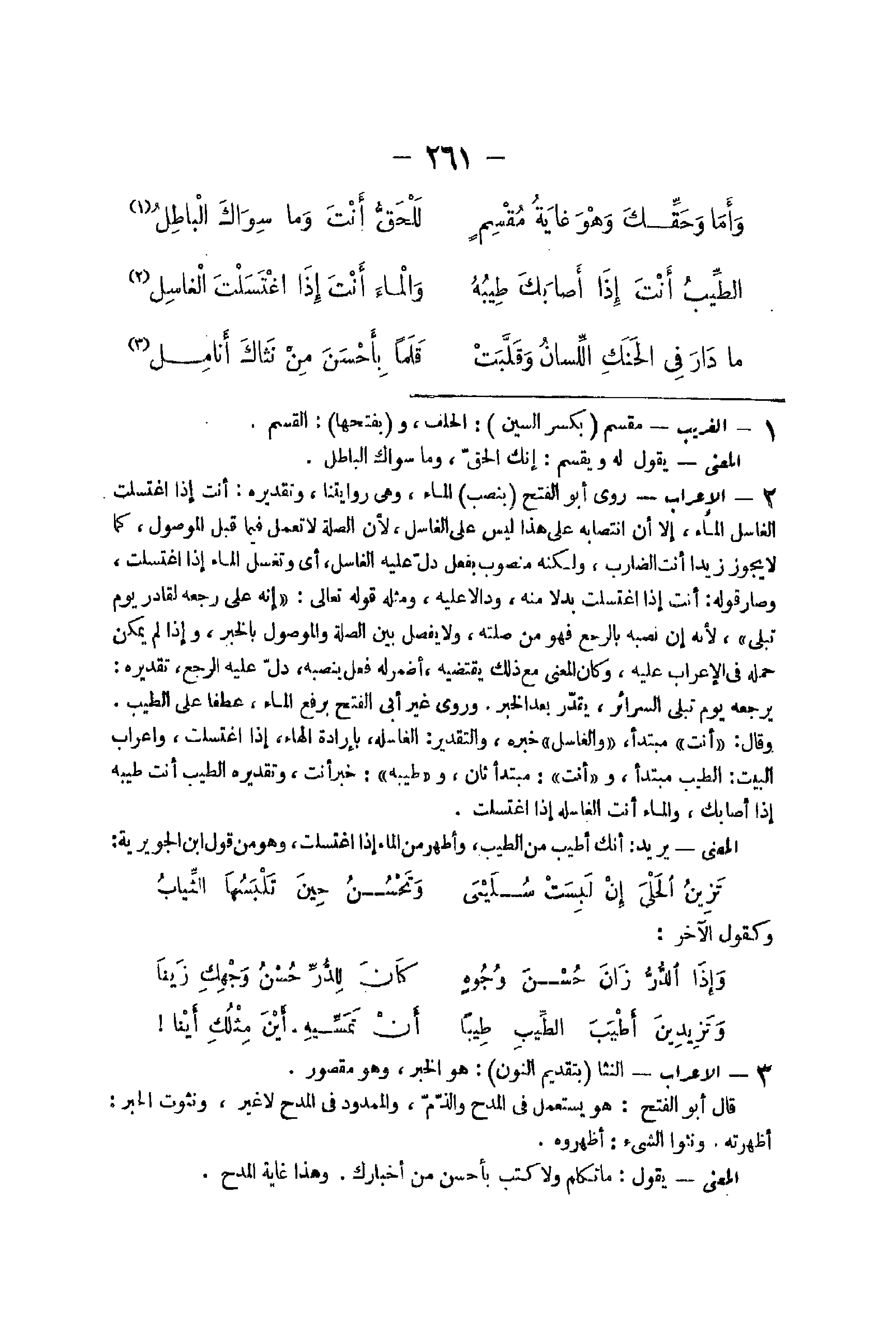 42 - الْإِعْرَاب روى أَبُو الْفَتْح بِنصب المَاء وَهِي روايتنا وَتَقْدِيره أَنْت إِذا اغْتَسَلت الْغَاسِل المَاء إِلَّا ان انتصابه على هَذَا لَيْسَ على الْغَاسِل لِأَن الصِّلَة لَا تعْمل فِيمَا قبل الْمَوْصُول كَمَا لَا يجوز زيدا أَنْت الضَّارِب وَلكنه مَنْصُوب بِفعل دلّ عَلَيْهِ الْغَاسِل أَي وتغسل المَاء إِذا اغْتَسَلت وَصَارَ قَوْله أَنْت إِذا اغْتَسَلت بَدَلا مِنْهُ ودالا عَلَيْهِ وَمثله قَوْله تَعَالَى {إِنَّه على رجعه لقادر يَوْم تبلى} لِأَنَّهُ نَصبه بالرجع فَهُوَ من صلته وَلَا يفصل بَين الصِّلَة والموصول بالْخبر وَإِذا لم يُمكن حمله فِي الْإِعْرَاب عَلَيْهِ وَكَانَ الْمَعْنى مَعَ ذَلِك يَقْتَضِيهِ أضمر لَهُ فعل ينصبه دلّ عَلَيْهِ الرجع تَقْدِيره يرجعه يَوْم تبلى السرائر يقدر بعد الْخَبَر وروى غير أبي الْفَتْح بِرَفْع المَاء عطفا على الطّيب وَقَالَ أَنْت مُبْتَدأ والغاسل خَبره وَالتَّقْدِير الغاسله بِإِرَادَة الْهَاء إِذا اغْتَسَلت وإعراب الْبَيْت الطّيب مُبْتَدأ وَأَنت مُبْتَدأ ثَان وطيبه خبر أَنْت وَتَقْدِيره الطّيب أَنْت طيبه إِذا أَصَابَك وَالْمَاء وَأَنت الغاسله إِذا اغْتَسَلت الْمَعْنى يُرِيد أَنَّك أطيب من الطّيب وأطهر من المَاء إِذا اغْتَسَلت وَهُوَ من قَول ابْن الجويرية