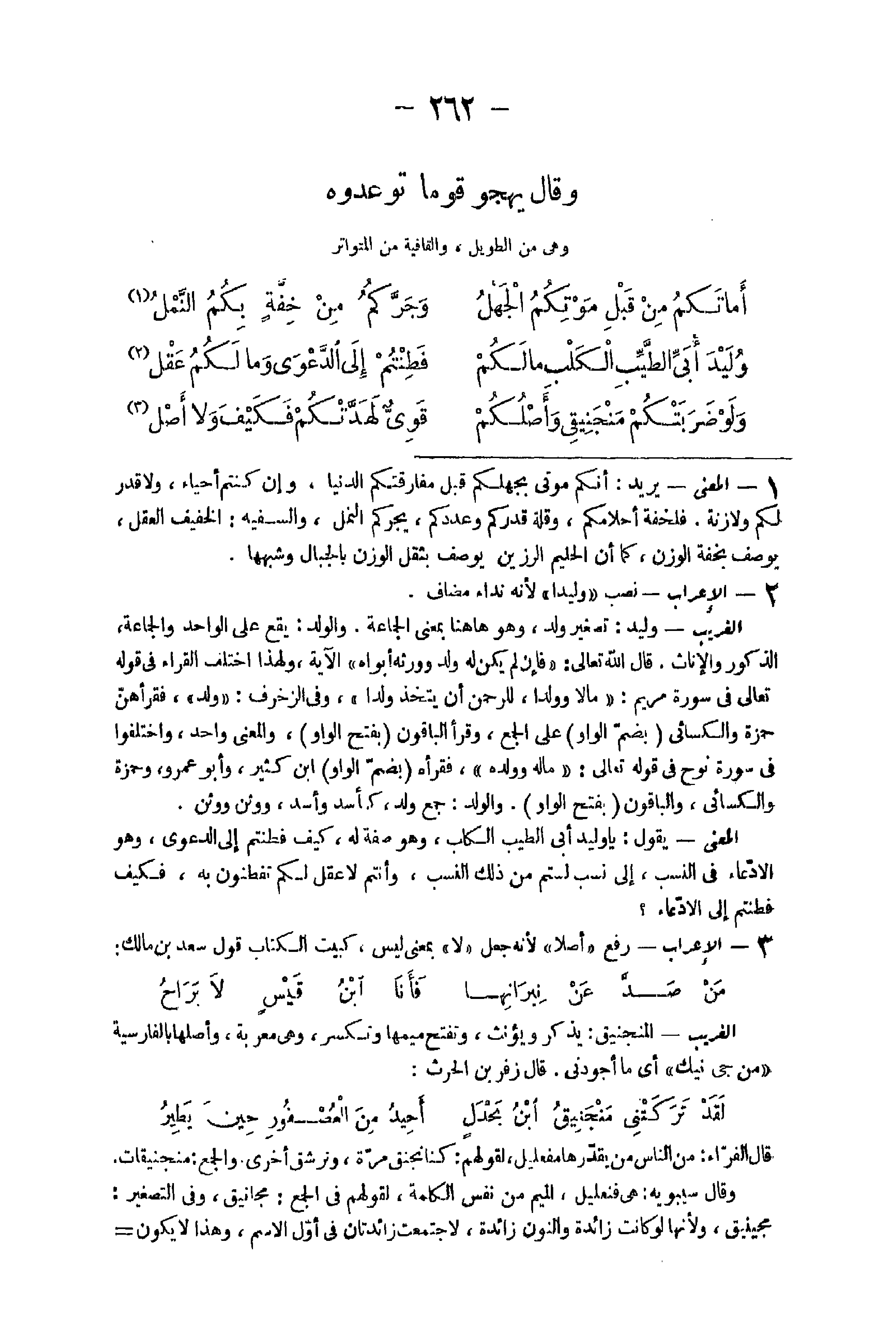 2 - الْإِعْرَاب نصب وليد وليداً لِأَنَّهُ نِدَاء مُضَاف الْغَرِيب تَصْغِير ولد وَهُوَ هَاهُنَا بِمَعْنى الْجَمَاعَة وَالْولد يَقع على الْوَاحِد وَالْجَمَاعَة الذُّكُور وَالْإِنَاث قَالَ الله تَعَالَى {فَإِن لم يكن لَهُ ولد وَورثه أَبَوَاهُ} الْآيَة وَلِهَذَا اخْتلف الْقُرَّاء فِي قَوْله تَعَالَى فِي سُورَة مَرْيَم {مَالا وَولدا للرحمن ان يتَّخذ ولدا} 6 وَفِي الزخرف {ولدا} فقرأهن حَمْزَة وَالْكسَائِيّ بِضَم الْوَاو على الْجمع وقرا الْبَاقُونَ بِفَتْح الْوَاو وَالْمعْنَى وَاحِد وَاخْتلفُوا فِي سُورَة نوح فِي قَوْله تَعَالَى {مَاله وَولده} فَقَرَأَ بِضَم الْوَاو ابْن كثير وَأَبُو عَمْرو وَحَمْزَة وَالْكسَائِيّ وَالْبَاقُونَ بِفَتْح الْوَاو وَالْولد جمع ولد كأسد وَأسد ووثن ووثن الْمَعْنى يَقُول يَا وليد أبي الطّيب الْكَلْب وَهُوَ صفة لَهُ كَيفَ فطنتم إِلَى دَعْوَى وَهُوَ الإدعاء فِي النّسَب إِلَى نسب لَسْتُم من ذَلِك النّسَب وَأَنْتُم لَا عقل لكم تفطنون بِهِ فَكيف فطنتم إِلَى الادعاء