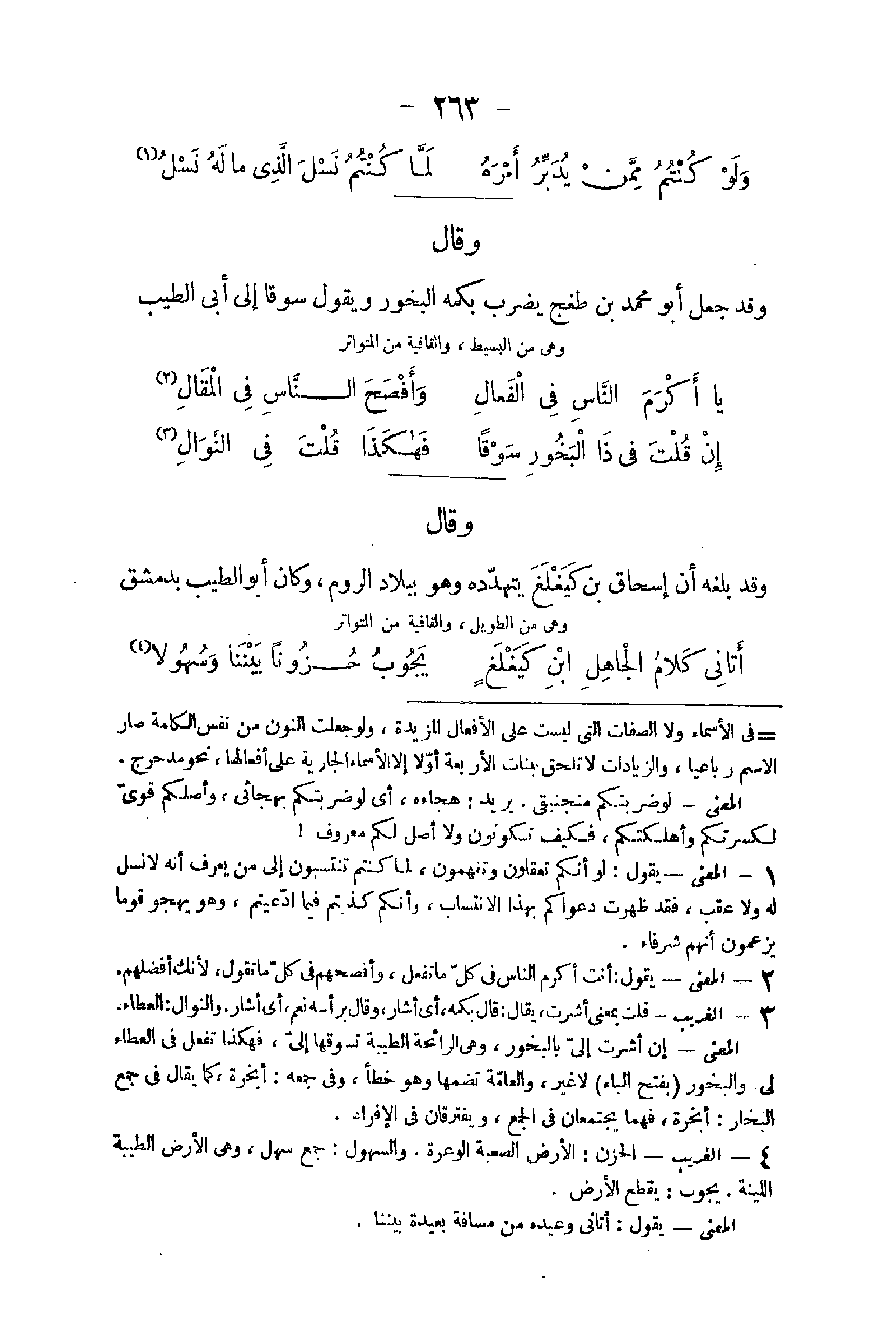 - 1 الْمَعْنى يَقُول إِن قَالَ إِنَّه ذل بالهجاء لقد كذب بل كَانَ من قبل هجائي لَهُ ذليلا حَقِيرًا الْغَرِيب الرّبع الْمنزل صيفا وشتاء والطلل مَا شخص من آثَار الديار والحي الْجَمَاعَة النازلون والراحلون وَحسب مستقبله يجوز الْكسر وَالْفَتْح فِي سينه وَالْأَفْعَال السالمة الَّتِي جَاءَت فِي الْمَاضِي بِكَسْر الْعين تكون فِي الْمُسْتَقْبل بِالْفَتْح نَحْو علم يعلم إِلَّا أَرْبَعَة أَفعَال فَإِنَّهَا جَاءَت نَوَادِر مثل حسب يحْسب ويبس ييبس ويئس ييئس وَنعم ينعم فَإِنَّهَا جَاءَت من السَّالِم بِالْكَسْرِ وَالْفَتْح وَجَاء من المعتل الْمَاضِي والمستقبل بِالْكَسْرِ ومق يمق ووفق يفق ووثق يَثِق وورع يرع وورم يرم وَورث يَرث وروى الزنديري وَولى يَلِي وَحسب يحْسب بِالْفَتْح لُغَة فصيحة وَبهَا قَرَأَ ابْن عَامر وَعَاصِم وَحَمْزَة كل فعل مُسْتَقْبل فِي الْقُرْآن الْمَعْنى يَقُول لَا تحسبوا ربعكم أول قَتِيل قَتله فراقكم فَإِنَّكُم قد قتلتم نفوسا كَثِيرَة وأطلالا كَثِيرَة إِذْ رحلتم عَنْهَا وخلت مِنْكُم فَجعل رحليهم عَن الرّبع موتا لَهُ لِأَنَّهُ زَالَ جماله عَنهُ بزوالهم والأمكنة إِنَّمَا حَيَاتهَا بالعمارة فَإِذا خلت من الْعِمَارَة فَهِيَ ميتَة