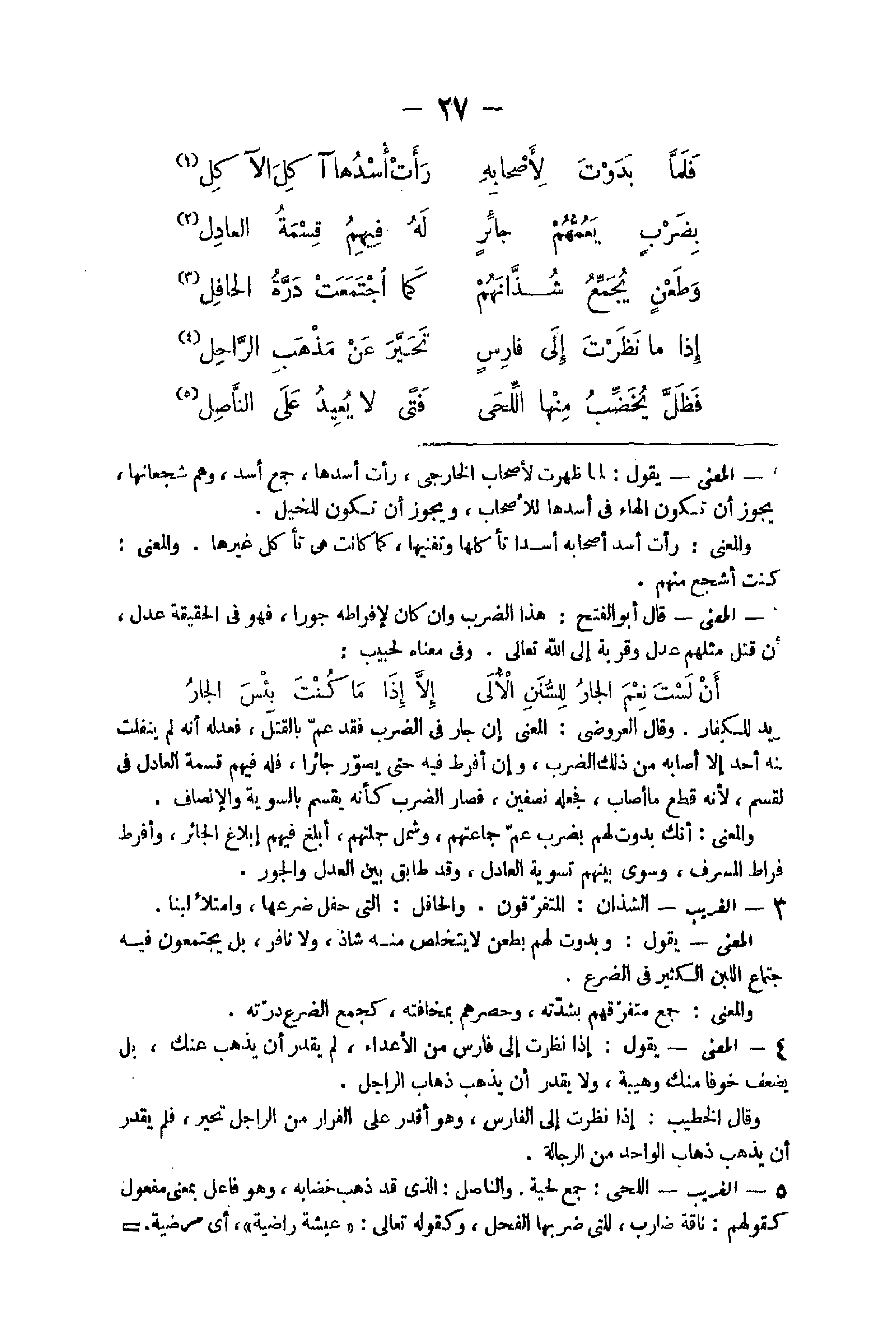 - الْمَعْنى يَقُول لما ظَهرت لأَصْحَاب الْخَارِجِي رَأَتْ أسدها جمع أَسد وهم شجعانها وَيجوز أَن تكون الْهَاء فِي أسدها للأصحاب وَيجوز أَن تكون للخيل وَالْمعْنَى رَأَتْ أَسد أَصْحَابه أسدا تأكلها وتفنيها كَمَا كَانَت هِيَ تَأْكُل غَيرهَا وَالْمعْنَى كنت أَشْجَع مِنْهُم