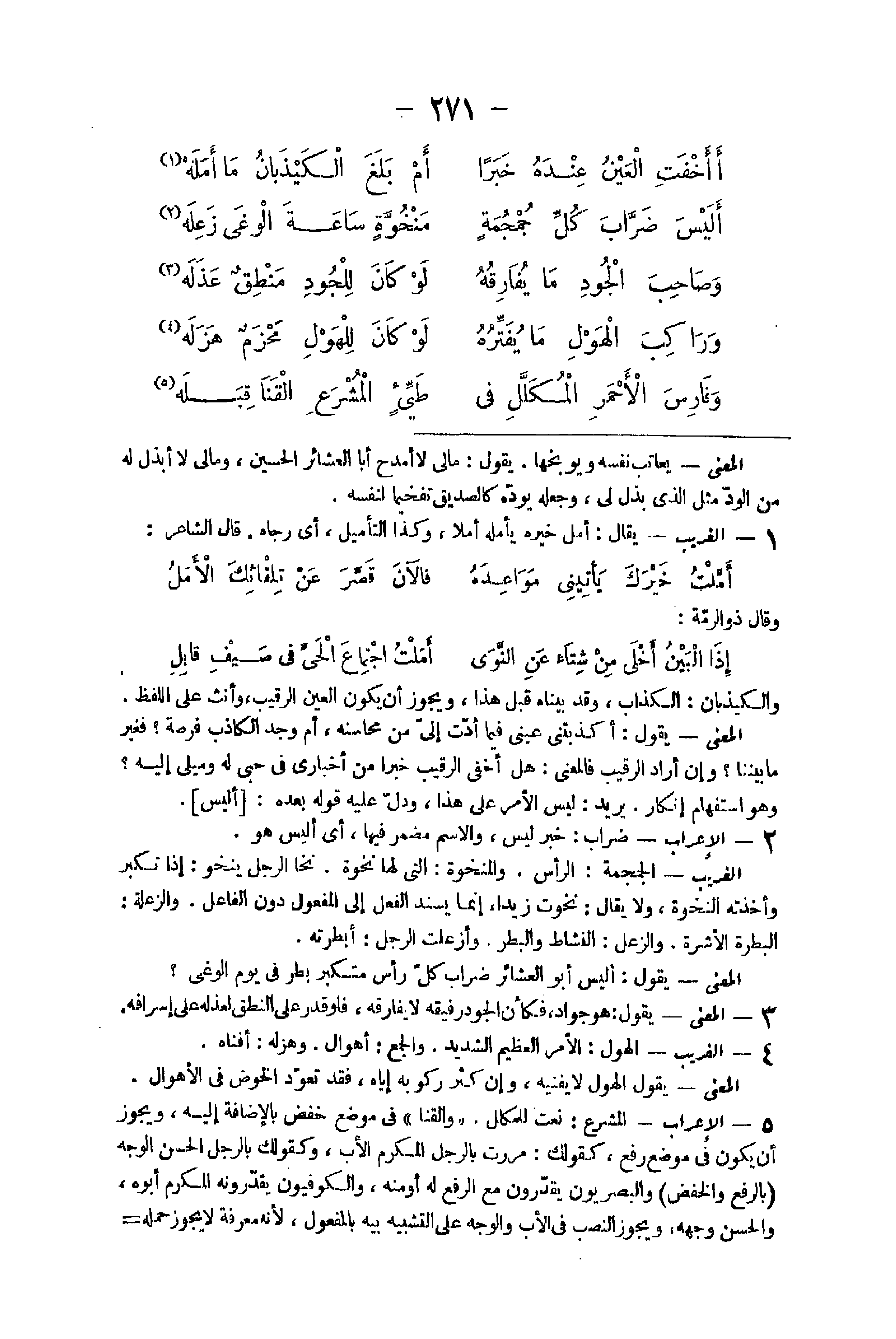 26 - الْإِعْرَاب ضراب خبر لَيْسَ وَالِاسْم مُضْمر فِيهَا أَي أَلَيْسَ هُوَ الْغَرِيب الجمجمة الرَّأْس والمنخوة الَّتِي لَهَا نخوة نخا الرجل ينخو إِذا تكبر وأخذته النخوة وَلَا يُقَال نخوت زيدا إِنَّمَا يسند الْفِعْل إِلَى الْمَفْعُول دون الْفَاعِل والزعلة البطرة الأشرة والزعل النشاط والبطر وأزعلت الرجل أبطرته الْمَعْنى يَقُول أَلَيْسَ أَبُو العشائر ضراب كل رَأس متكبر بطر فِي يَوْم الوغى