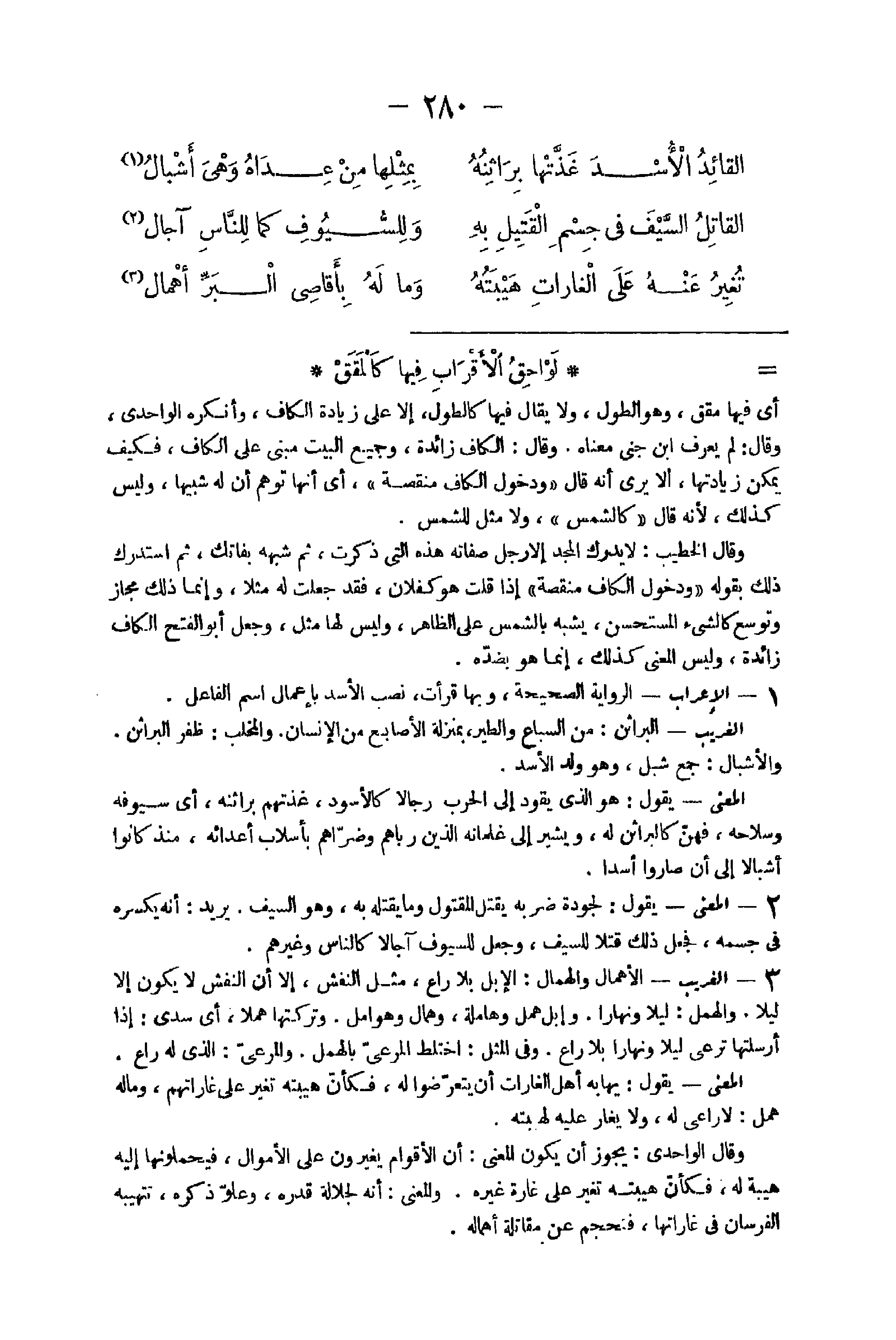14 - الْإِعْرَاب الرِّوَايَة الصَّحِيحَة وَبهَا قَرَأت نصب الْأسد بإعمال إسم الْفَاعِل الْغَرِيب البراثن من السبَاع وَالطير بِمَنْزِلَة الْأَصَابِع من الْإِنْسَان والمخلب ظفر البراثن والأشبال جمع شبْل وَهُوَ ولد الْأسد الْمَعْنى يَقُول هُوَ الَّذِي يَقُود إِلَى الْحَرْب ورجالا كالأسود غذتهم براثنه أَي سيوفه وسلاحه فهن كالبراثن لَهُ وَيُشِير إِلَى غلمانه الَّذين رباهم وضراهم بإسلاب أعدائه مُنْذُ كَانُوا أشبالا إِلَى ان صَارُوا أسدا