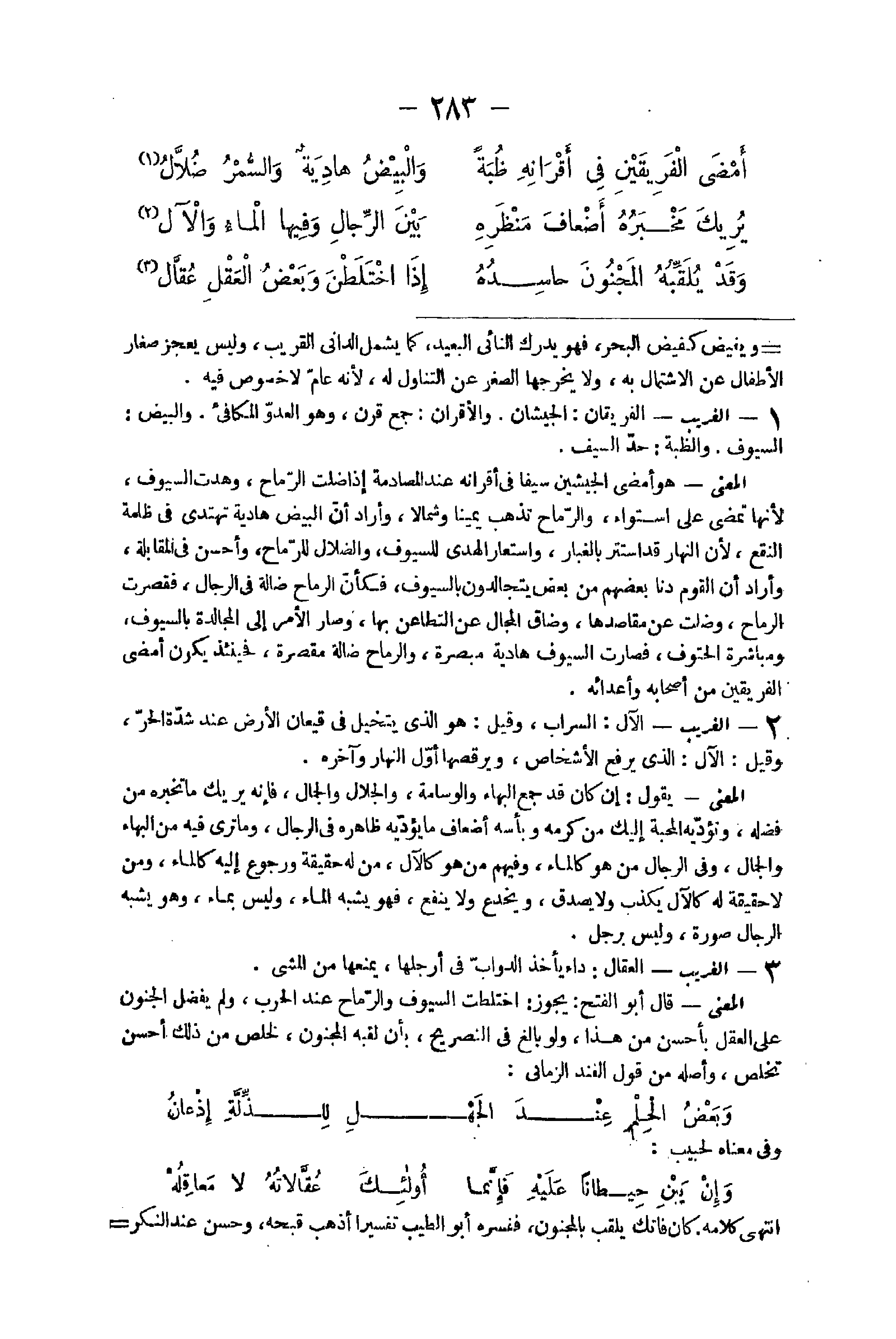 25 - الْغَرِيب الْفَرِيقَانِ الجيشان والأقران جمع قرن وَهُوَ الْعَدو المكافئ وَالْبيض السيوف والظبة حد السَّيْف الْمَعْنى هُوَ أمضى الجيشين سَيْفا فِي أقرانه عِنْد المصادمة إِذا ضلت الرماح وهدت السيوف لِأَنَّهَا تمْضِي على اسْتِوَاء والرماح تذْهب يَمِينا وَشمَالًا وَأَرَادَ أَن الْبيض هادية تهتدي فِي ظلمَة النَّقْع لِأَن النَّهَار قد استتر بالغبار واستعار الْهدى للسيوف والظلال للرماح وَأحسن فِي الْمُقَابلَة وَأَرَادَ أَن الْقَوْم دنا بَعضهم من بعض يتجادلون بِالسُّيُوفِ فَكَانَ الرماح ضَالَّة فِي الرِّجَال فقصرت الرماح وضلت عَن مقاصدها وضاق المجال عَن التطاعن بهَا وَصَارَ الْأَمر إِلَى المجادلة بِالسُّيُوفِ ومباشرة الحتوف فَصَارَت السيوف هادية مبصرة والرماح ضَالَّة مقصرة فَحِينَئِذٍ يكون أمضى الْفَرِيقَيْنِ من أَصْحَابه وأعدائه