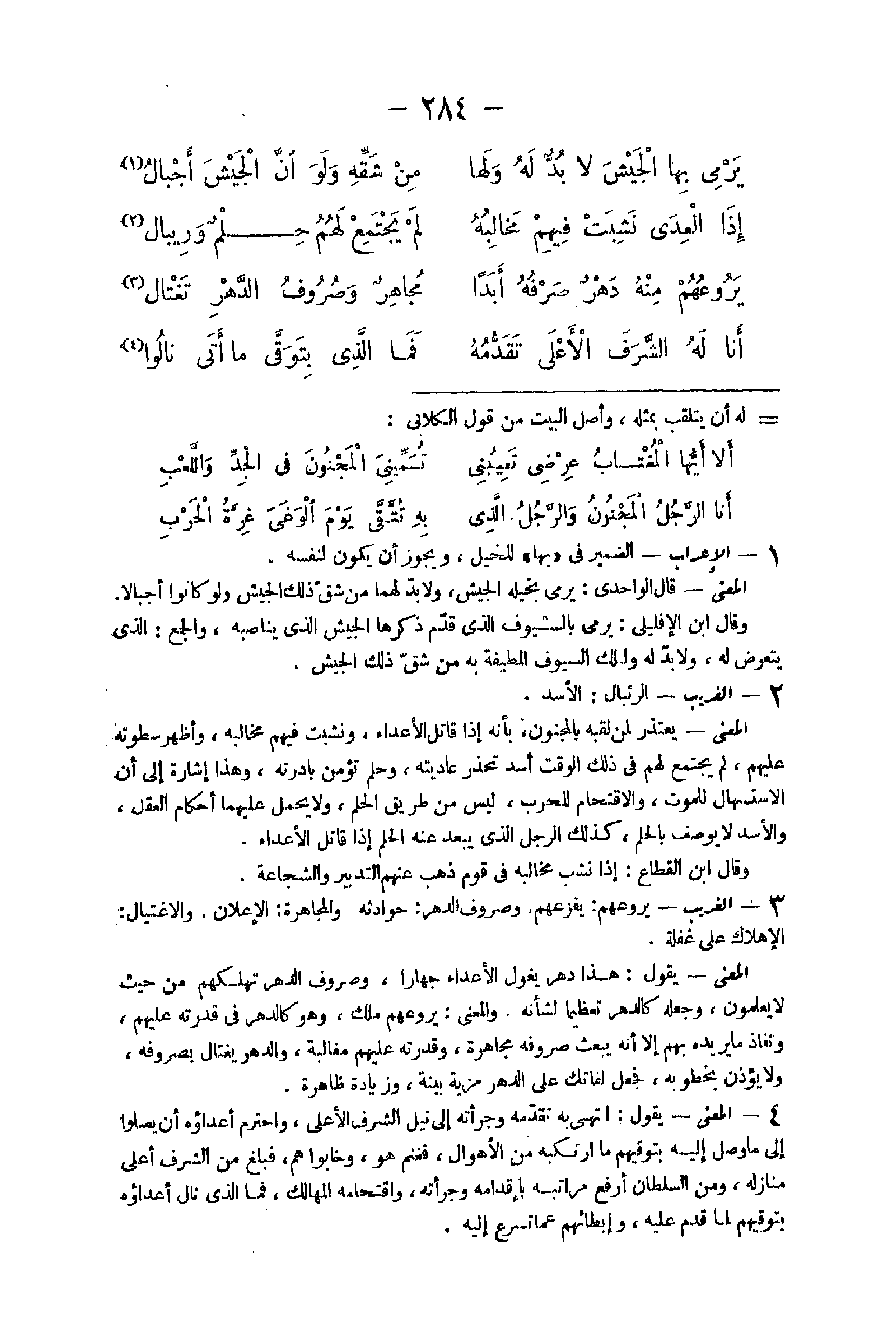 29 - الْغَرِيب الرئبال الْأسد الْمَعْنى يعْتَذر لمن لقبه بالمجنون بِأَنَّهُ إِذا قَاتل الْأَعْدَاء ونشبت فيهم مخالبه وَأظْهر سطوته عَلَيْهِم لم يجْتَمع لَهُم فِي ذَلِك الْوَقْت أَسد تحذر عاديته وحلم تؤمن بادرته وَهَذَا إِشَارَة إِلَى أَن الاستهال للْمَوْت والاقتحام للحرب لَيْسَ من طَرِيق الْحلم وَلَا يحمل عَلَيْهَا أَحْكَام الْعقل والأسد لَا يُوصف بالحلم كَذَلِك الرجل الَّذِي يبعد عَنهُ الْحلم إِذا قَاتل الْأَعْدَاء وَقَالَ ابْن القطاع إِذا نشبت مخالبه فِي قوم ذهب عَنْهُم التَّدْبِير والشجاعة