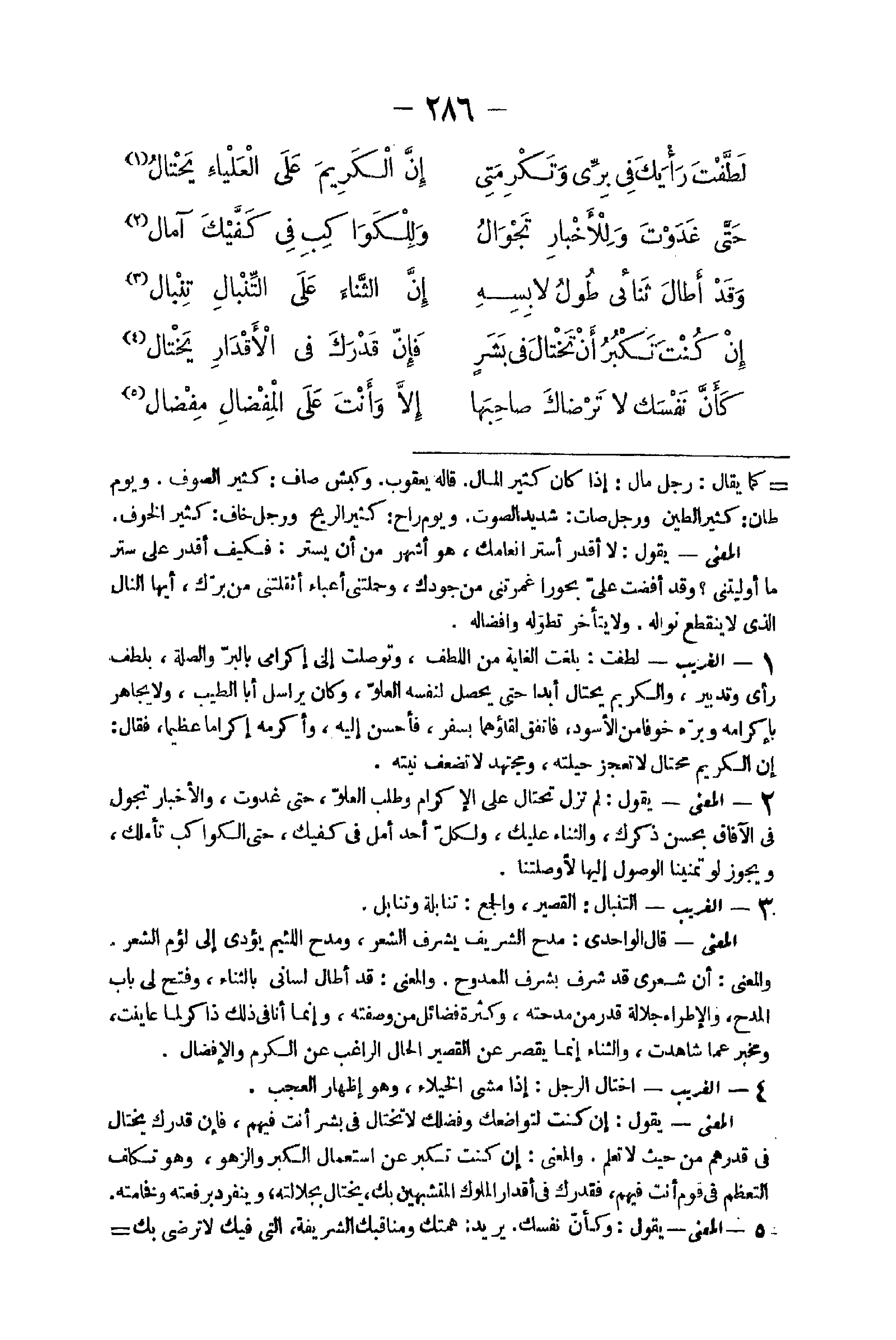 39 - الْغَرِيب التنبال الْقصير وَالْجمع تنابلة وتنابل الْمَعْنى قَالَ الواحدي مدح الشريف يشرف الشّعْر ومدح اللَّئِيم يُؤَدِّي إِلَى لؤم الشّعْر وَالْمعْنَى إِن شعري قد شرف بشرف الممدوح وَالْمعْنَى قد أَطَالَ لساني بالثناء وَفتح لي بَاب الْمَدْح والإطراء جلالة قدر من مدحته وَكَثْرَة فَضَائِل من وَصفته وَإِنَّمَا أَنا فِي ذَلِك ذَاكِرًا لما عانيت ومخبر عَمَّا شاهدت وَالثنَاء إِنَّمَا يقصر عَن الْقصير الْحَال الرَّاغِب عَن الْكَرم والإفضال