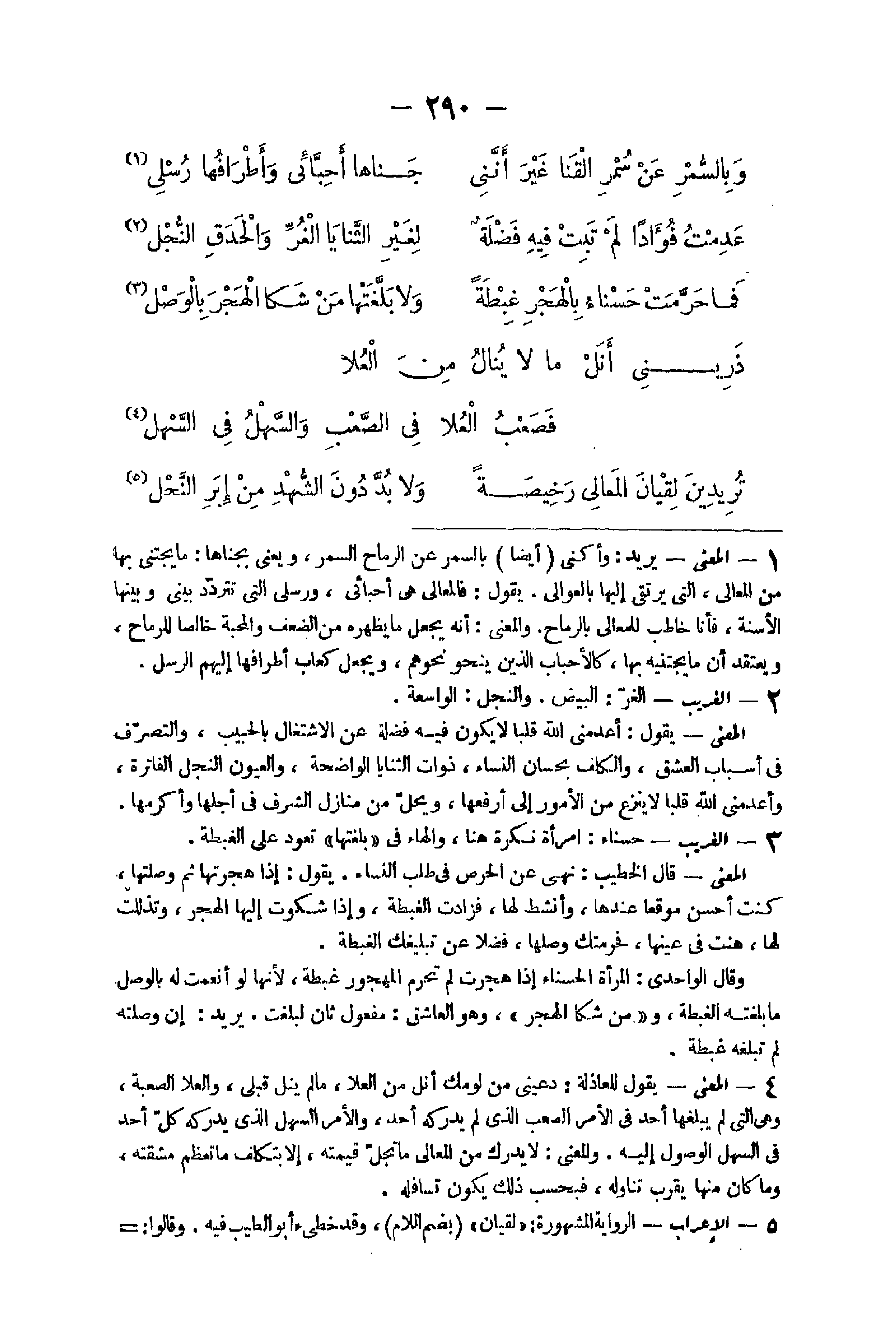 6 - الْغَرِيب الغر الْبيض والنجل الواسعة الْمَعْنى يَقُول أعدمني الله قلبا لَا يكون فِيهِ فضلَة عَن الِاشْتِغَال بالحبيب وَالتَّصَرُّف فِي أَسبَاب الْعِشْق والكلف بِحسان النِّسَاء ذَوَات الثنايا الْوَاضِحَة والعيون النجل الفاترة وأعدمني الله قلبا لَا ينْزع من الْأُمُور إِلَى أرفعها وَيحل من منَازِل الشّرف فِي أجلهَا وَأَكْرمهَا