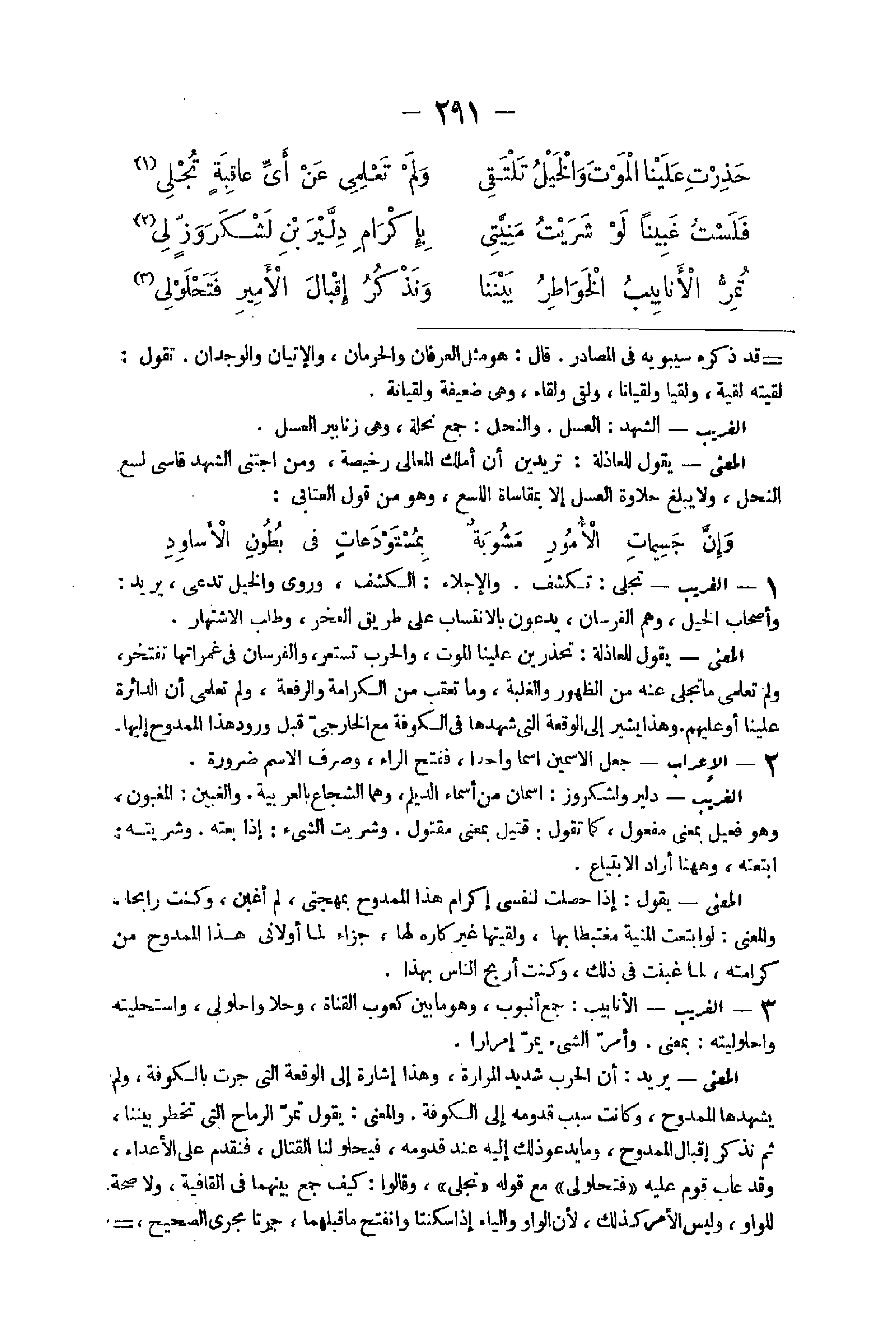 وَقَالُوا قد ذكره سِيبَوَيْهٍ فِي المصادر قَالَ هُوَ مثل الْعرْفَان والحرمان والإتيان والوجدان تَقول لَقيته لقية ولقيا ولقيانا وَلَقي ولقاء وَهِي ضَعِيفَة ولقيانة الْغَرِيب الشهد الْعَسَل والنحل جمع نحلة وَهِي زنابير الْعَسَل الْمَعْنى يَقُول للعاذلة تريدين إِن املك الْمَعَالِي رخيصة وَمن جتني الشَّهِيد قاسي لسع النَّحْل وَلَا يبلغ حلاوة الْعَسَل إِلَّا بمقاساة اللسع وَهُوَ من قَول العتابي