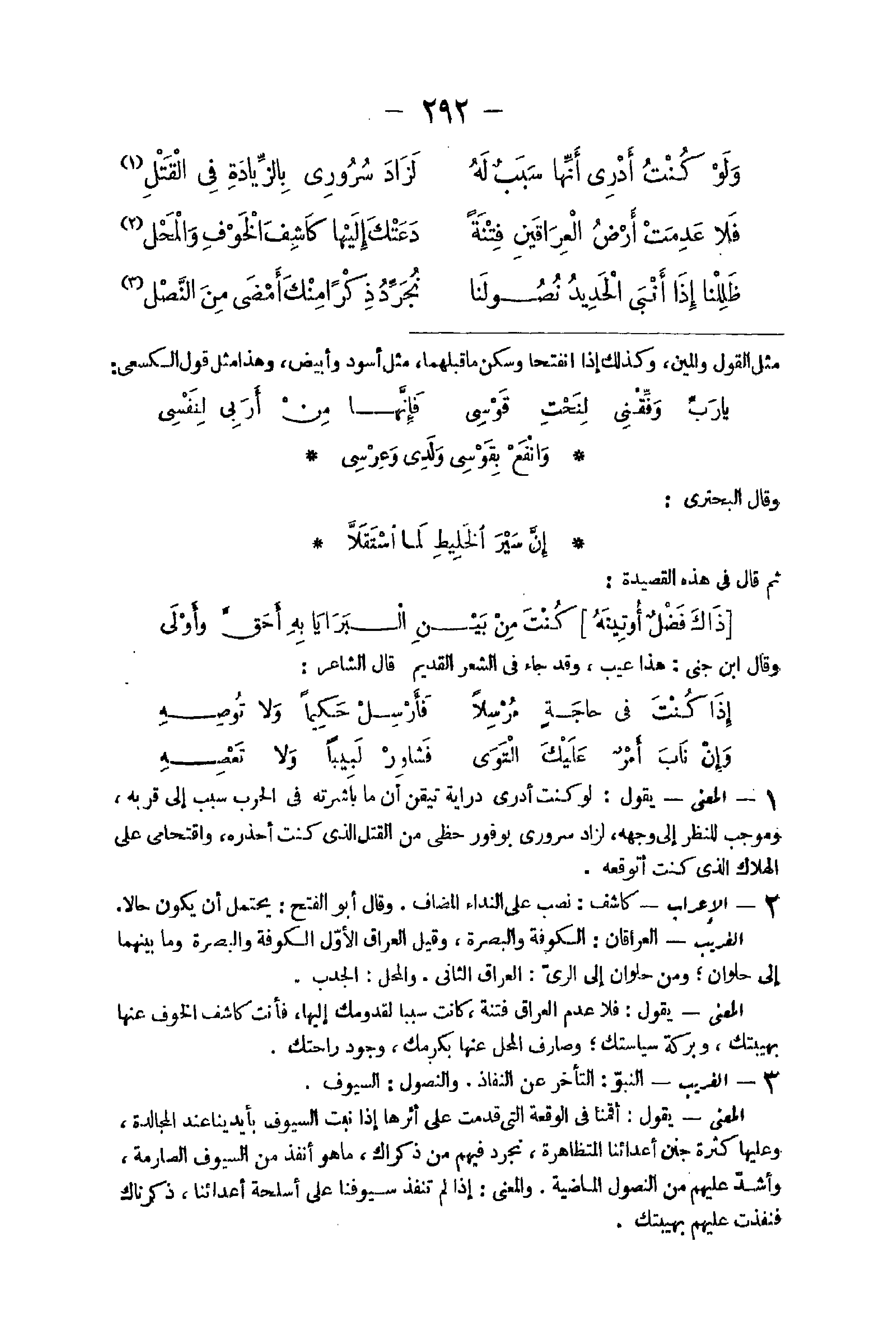 14 - الْإِعْرَاب كاشف نصب على النداء الْمُضَاف وَقَالَ أَبُو الْفَتْح يحْتَمل أَن يكون حَالا الْغَرِيب العراقان الْكُوفَة وَالْبَصْرَة وَقيل الْعرَاق الأول الْكُوفَة وَالْبَصْرَة وَمَا بَينهمَا إِلَى حلوان وَمن حلوان إِلَى الرّيّ الْعرَاق الثَّانِي وَالْمحل الجدب الْمَعْنى يَقُول فَلَا عدم الْعرَاق فتْنَة كَانَت سَببا لقدومك إِلَيْهَا فَأَنت كاشف الْخَوْف عَنْهَا بهيبتك وبركة سياستك وصارف الْمحل عَنْهَا بكرمك وجود راحتك