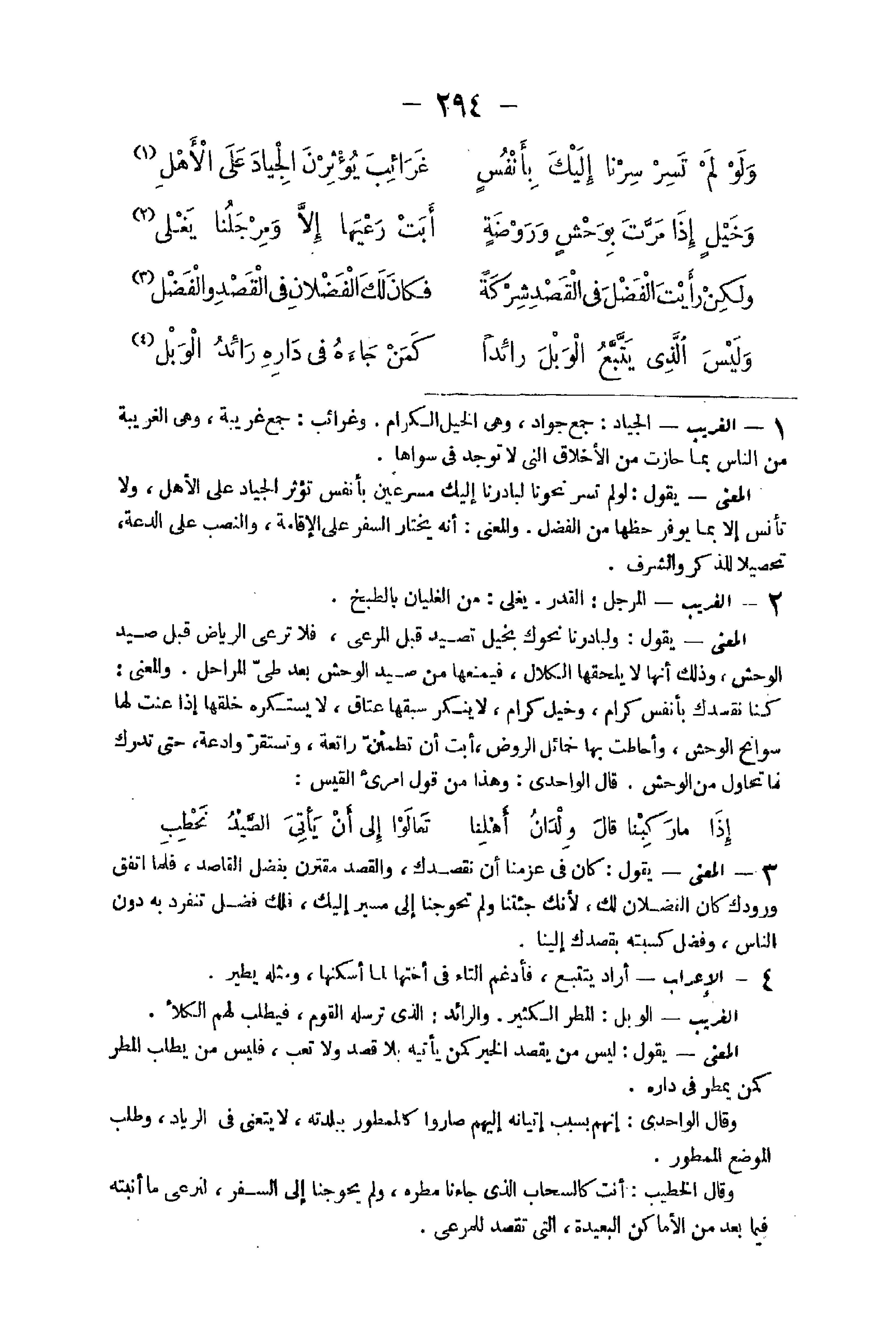 - الْغَرِيب الْجِيَاد جمع جواد وَهِي الْخَيل الْكِرَام وغرائب جمع غَرِيبَة وَهِي الغريبة من النَّاس بِمَا حازت من الْأَخْلَاق الَّتِي لَا تُوجد فِي سواهَا الْمَعْنى يَقُول لَو لم تسر نحونا لبادرنا إِلَيْك مُسْرِعين بأنفس تُؤثر الْجِيَاد على الْأَهْل وَلَا تأنس إِلَّا بِمَا يوفر حظها من الْفضل وَالْمعْنَى أَنه يخْتَار السّفر على الْإِقَامَة وَالنّصب على الدعمة تحصيلا للذّكر والشرف