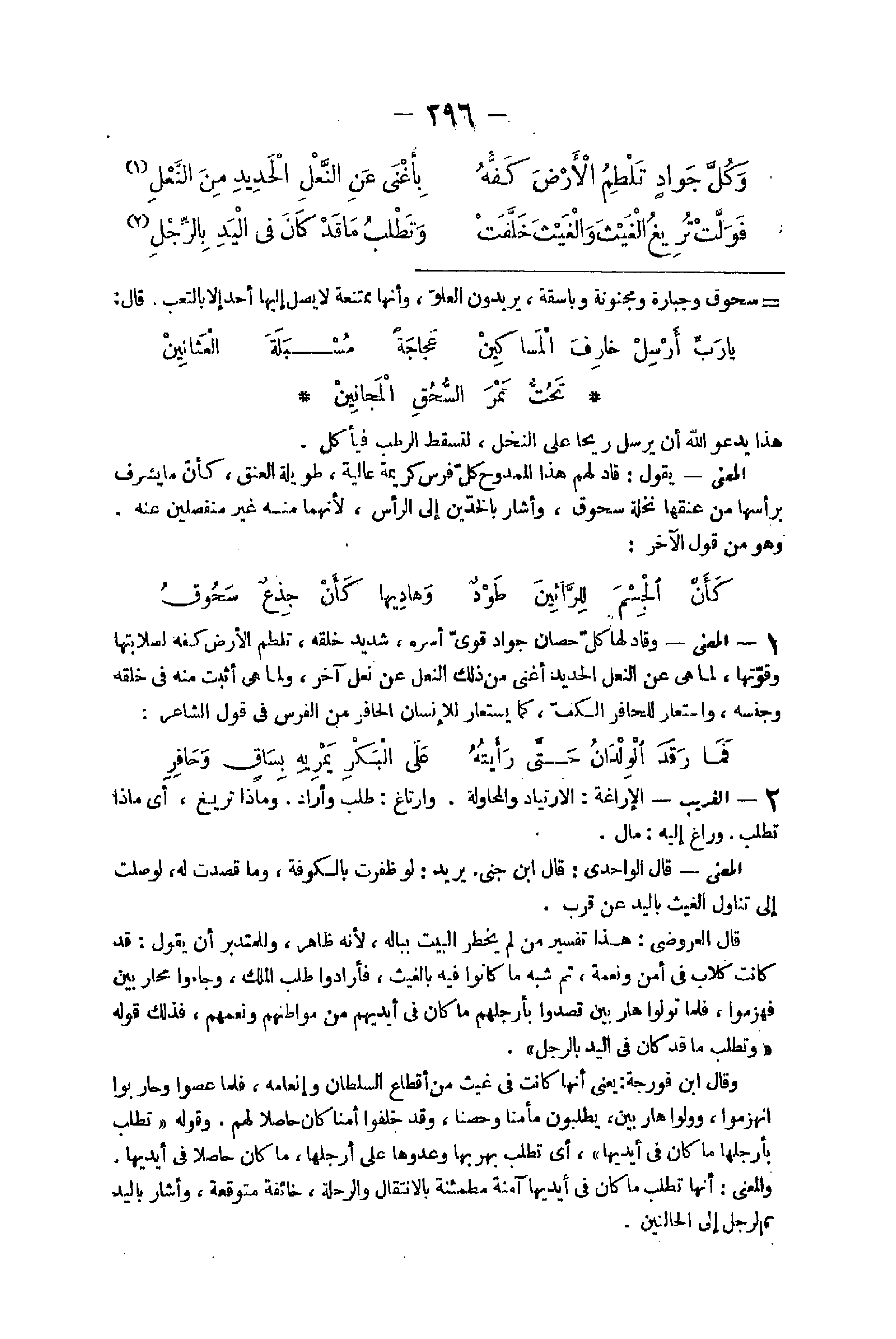 27 - الْمَعْنى وقاد لَهَا كل حصان جواد قوي أسره شَدِيد خلقه تلطم الأَرْض كَفه لصلابته وقوتها لما هِيَ عَن النَّعْل وَالْحَدِيد أغْنى من ذَلِك النَّعْل عَن نعل آخر وَلما هِيَ أثبت مِنْهُ فِي خلقه وجنسه واستعار للحافر الْكَفّ كَمَا يستعار للْإنْسَان الْحَافِر من الْفرس فِي قَول الشَّاعِر