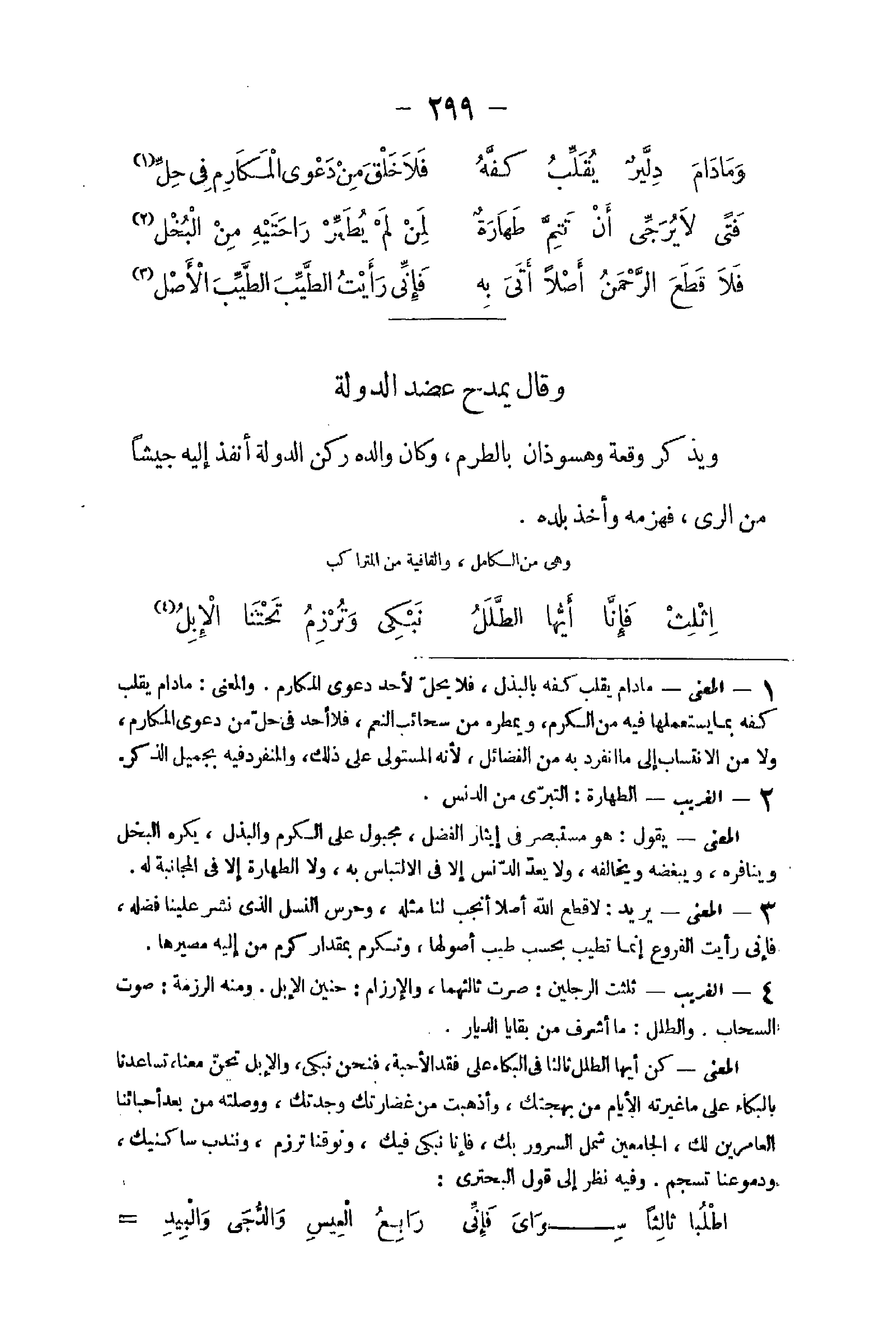 - 1 الْغَرِيب ثلثت الرجلَيْن صرت ثالثهما والإرزام حنين الْإِبِل وَمِنْه الرزمة صَوت السَّحَاب والطلل مَا أشرف من بقايا الديار الْمَعْنى كن أَيهَا الطلل ثَالِثا فِي الْبكاء على فقد الْأَحِبَّة فَنحْن نبكي وَالْإِبِل تحن مَعنا تساعدنا بالبكاء على مَا غيرته الْأَيَّام من بهجتك وأذهبت من غضارتك وَجَدْتُك ووصلته من بعد أحبائنا العامرين لَك الجامعين شَمل السرُور بك فَإنَّا نبكي فِيك ونوقنا ترزم ونندب ساكنيك ودموعنا تسجم وَفِيه نظر إِلَى قَول البحتري