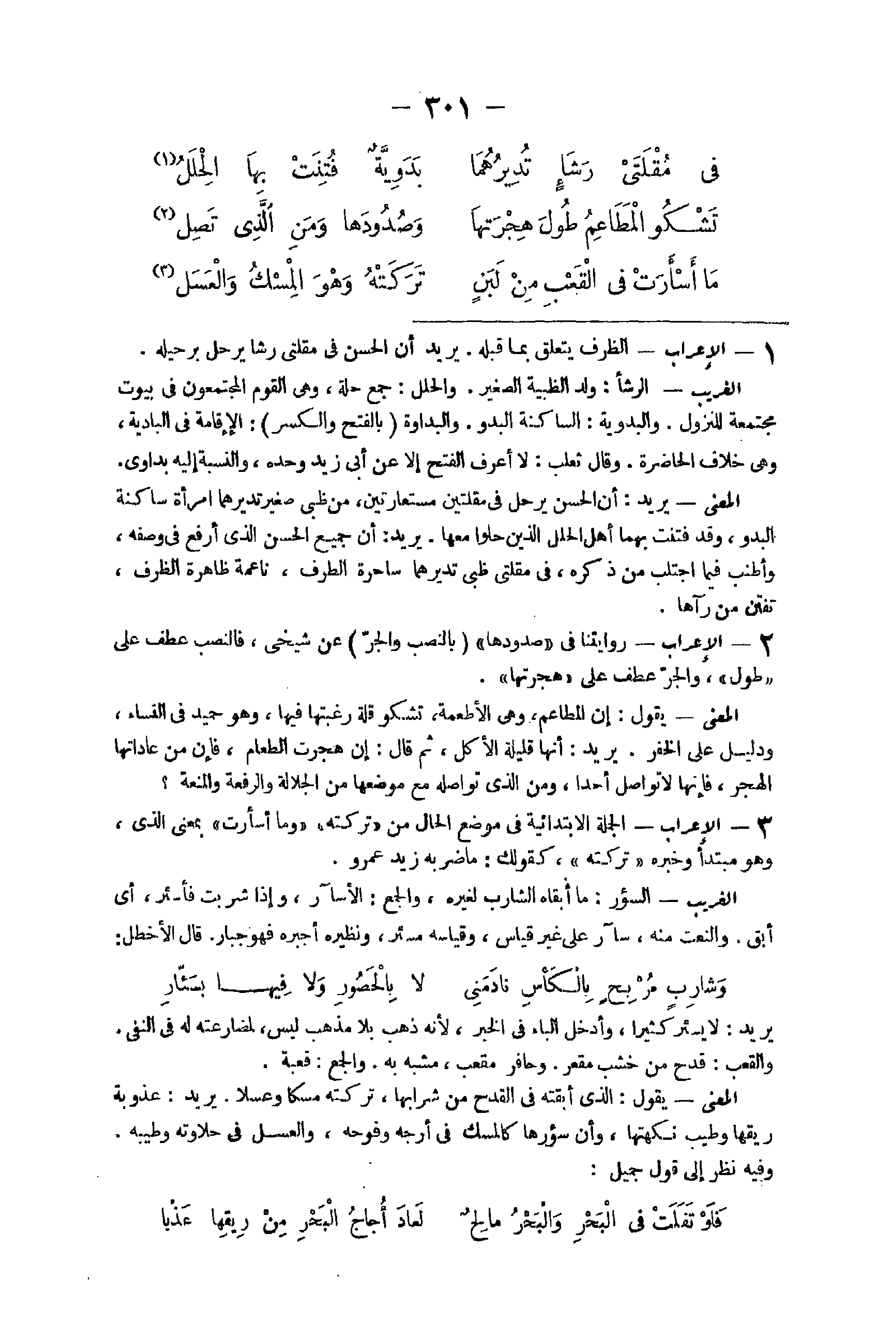 - الْإِعْرَاب الظّرْف يتَعَلَّق بِمَا قبله يُرِيد أَن الْحسن فِي مقلتي رشأ يرحل برحيله الْغَرِيب الرشأ ولد الظبية الصَّغِير وَالْحلَل جمع حلَّة وَهِي الْقَوْم المجتمعون فِي بيُوت مجتمعة للنزول والبدوية الساكنة البدو والبداوة بِالْفَتْح وَالْكَسْر الْإِقَامَة فِي الْبَادِيَة وَهِي خلاف الْحَاضِرَة وَقَالَ ثَعْلَب لَا أعرف الْفَتْح إِلَّا عَن أبي زيد وَحده وَالنِّسْبَة إِلَيْهِ بداوي الْمَعْنى يُرِيد أَن الْحسن يرحل فِي مقلتين مستعارتين من ظَبْي صَغِير تدبرهما امْرَأَة سَاكِنة البدو وَقد فتنت بهما أهل الْحلَل الَّذين حلوا مَعهَا يُرِيد أَن الْجَمِيع الْحسن الَّذِي أرفع فِي وَصفه وَأَطْنَبَ فِيمَا اجتلب من ذكره فِي مقلتي ظَبْي تديرهما سَاحِرَة الطّرف ناعمة ظَاهِرَة الظّرْف تفتن من رَآهَا