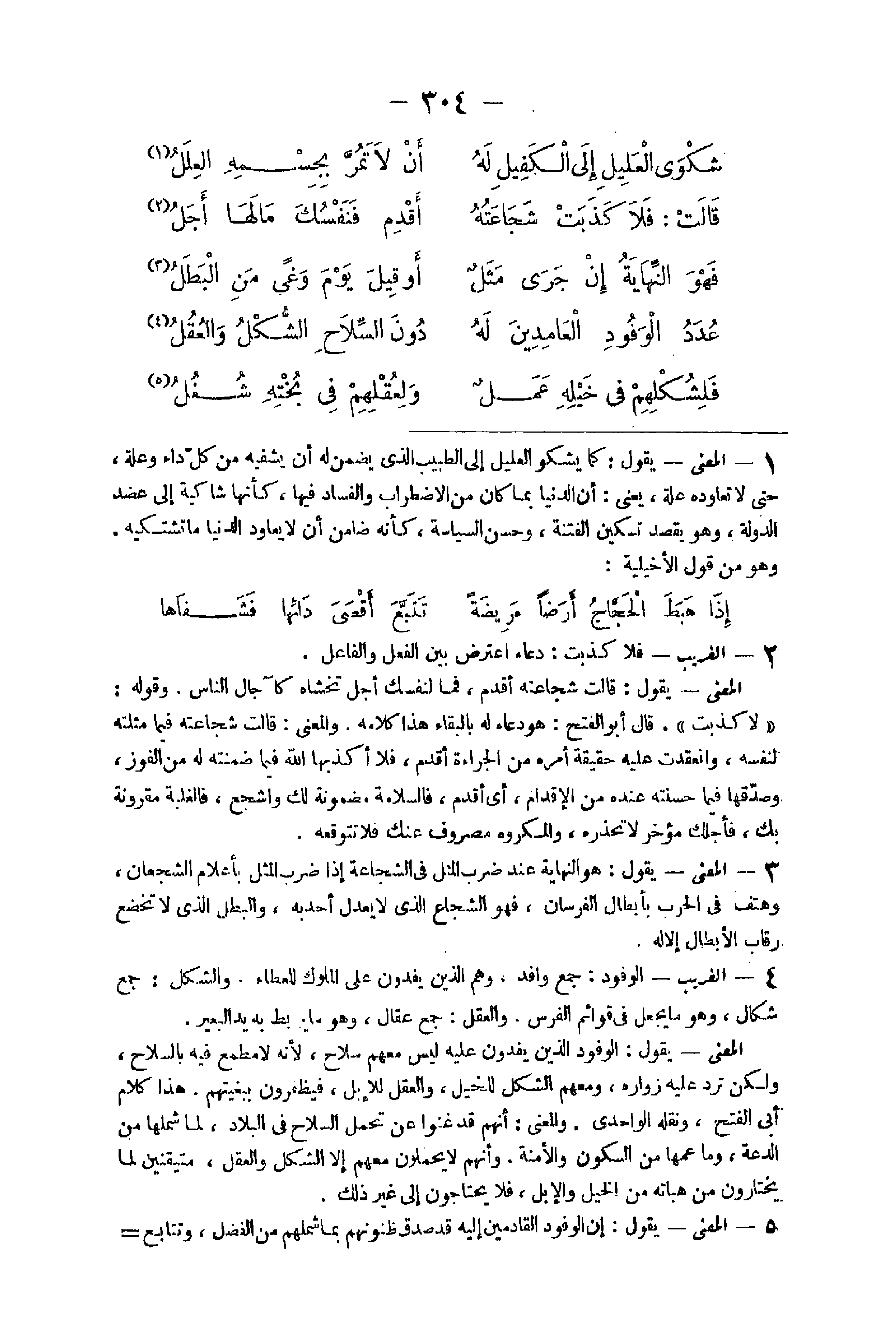 20 - الْغَرِيب فَلَا كذبت دُعَاء اعْتِرَاض بَين الْفِعْل وَالْفَاعِل الْمَعْنى يَقُول قَالَت شجاعته أَقْدَام فَمَا لنَفسك أجل تخشاه كآجال النَّاس وَقَوله لَا كذبت قَالَ أَبُو الْفَتْح هُوَ دُعَاء لَهُ بِالْبَقَاءِ هَذَا كَلَامه وَالْمعْنَى قَالَت شجاعته فِيمَا مثلته لنَفسِهِ وانعقدت عَلَيْهِ حَقِيقَة أمره من الجراءة أَقْدَام فَلَا أكذبها الله فِيمَا ضمنته لَهُ من الْفَوْز وصدقها فِيمَا حسنته عِنْده من الْإِقْدَام أَي أقدم فالسلامة مَضْمُونَة لَك وَأَشْجَع فالغلبة مقرونة بك فأجلك مُؤخر لَا تحذره وَالْمَكْرُوه مَصْرُوف عَنْك فَلَا تتوقعه
