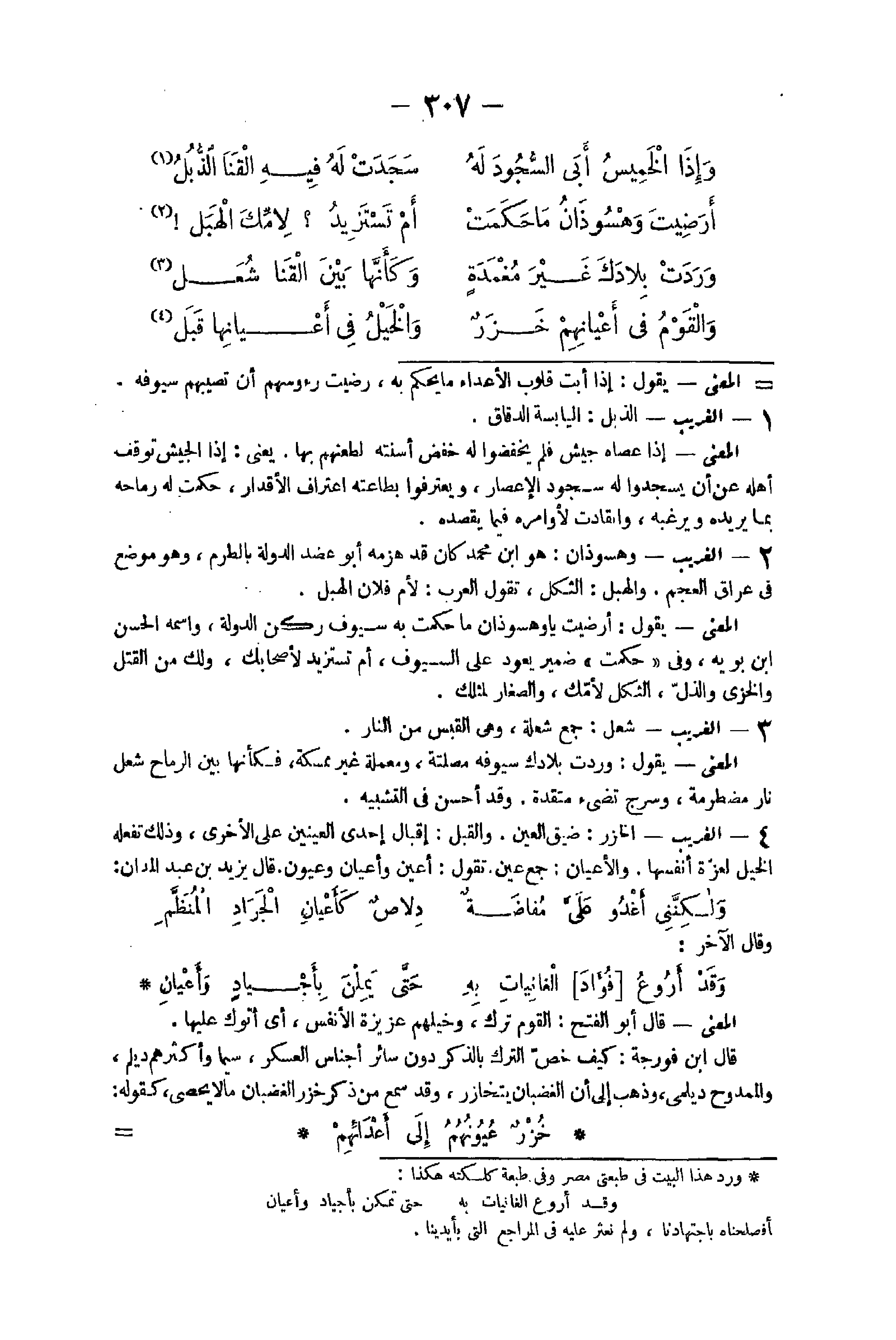 31 - الْغَرِيب الذبل الْيَابِسَة الدقاق الْمَعْنى إِذا عَصَاهُ جَيش فَلم يخفضوا لَهُ خفض أسنته لطعنهم بهَا يَعْنِي إِذا الْجَيْش توقف أَهله عَن أَن يسجدوا لَهُ سُجُود الإعصار ويعترفوا بِطَاعَتِهِ اعْتِرَاف الأقدار حكمت لَهُ رماحه بِمَا يُريدهُ ويرغبه وانقادت لأوامره فِيمَا قَصده