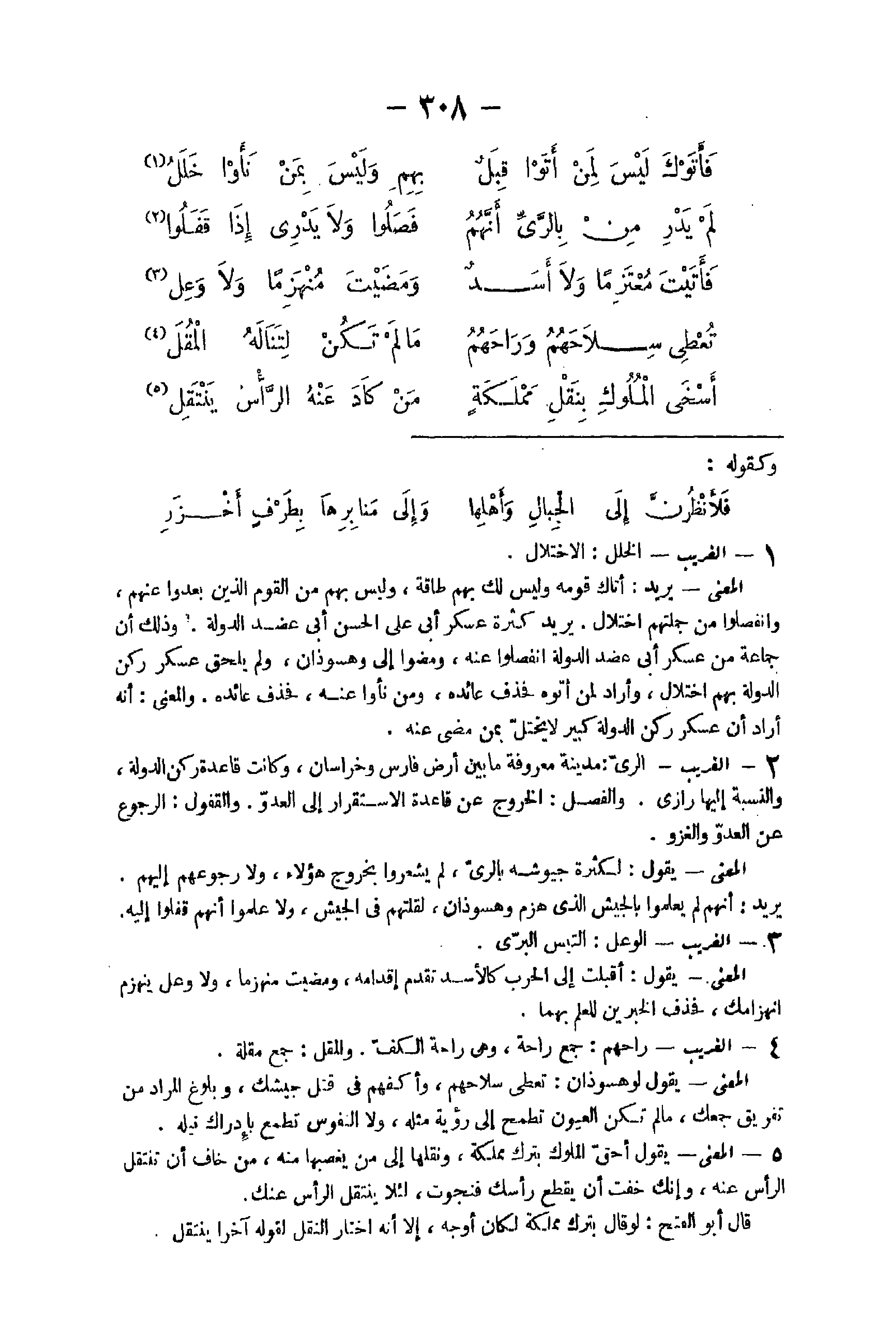 36 - الْغَرِيب الرّيّ مَدِينَة مَعْرُوفَة مَا بَين أَرض فَارس وخراسان وَكَانَت قَاعِدَة ركن الدولة وَالنِّسْبَة إِلَيْهَا رازي والفصل الْخُرُوج من قَاعِدَة الِاسْتِقْرَار إِلَى الْعَدو والقفول الرُّجُوع عَن الْعَدو والغزو الْمَعْنى يَقُول لِكَثْرَة جيوشه بِالريِّ لم يشعروا بِخُرُوج هَؤُلَاءِ وَلَا رجوعهم إِلَيْهِم يُرِيد أَنهم لم يعلمُوا بالجيش الَّذِي هزم وهسوذان لقلتهم فِي الْجَيْش وَلَا علمُوا أَنهم قَفَلُوا إِلَيْهِ