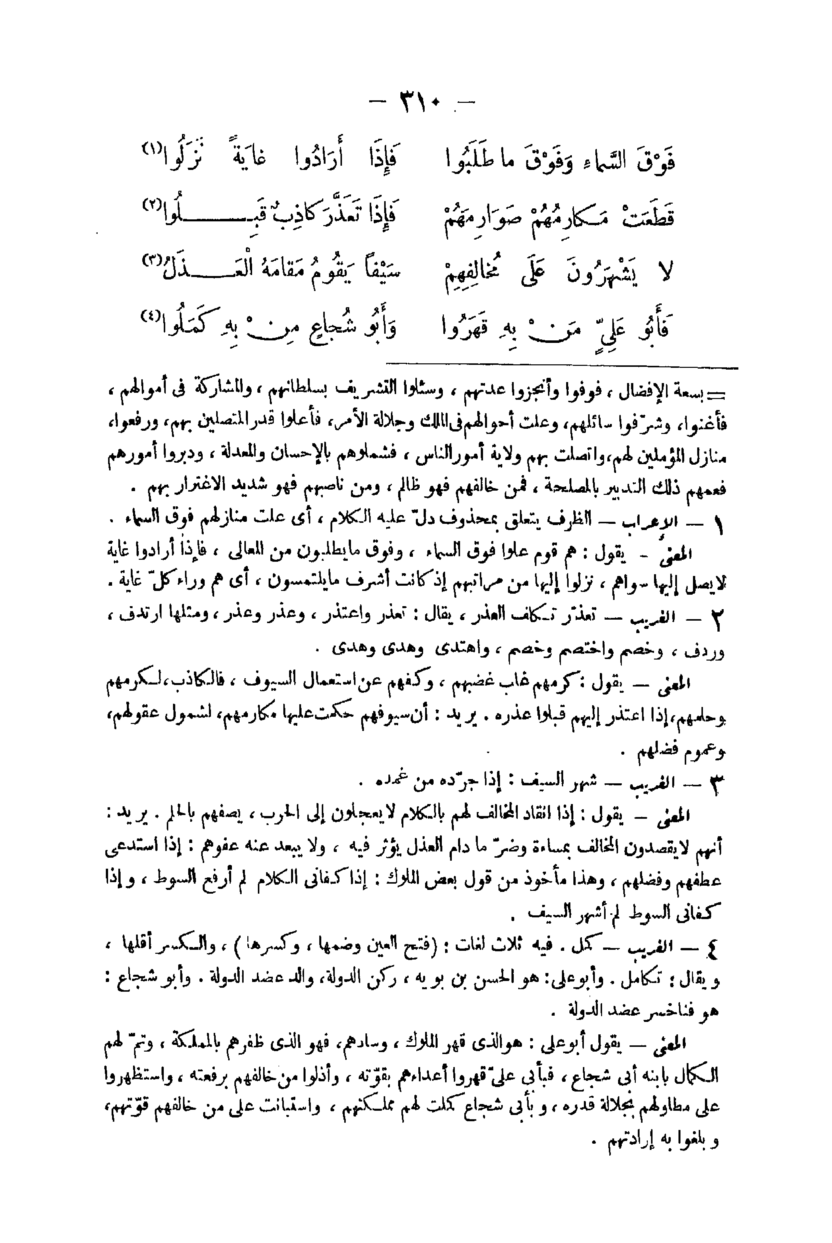 48 - الْغَرِيب كمل فِيهِ ثَلَاث لُغَات فتح الْعين وَضمّهَا وَكسرهَا وَالْكَسْر أقلهَا وَيُقَال تَكَامل وَأَبُو عَليّ هُوَ الْحسن بن بويه ركن الدولة وَالِد عضد الدولة وَأَبُو شُجَاع هُوَ فَنًّا خسر عضد الدولة الْمَعْنى يَقُول أَبُو عَليّ هُوَ الَّذِي قهر الْمُلُوك وسادهم فَهُوَ الَّذِي ظفرهم بالمملكة وَتمّ لَهُم الْكَمَال بِابْنِهِ أبي شُجَاع فَبِأَي على قهروا أعداءهم بقوته وأذلوا من خالفهم برفعته واستظهروا على مطاولهم بجلالة قدره وبأبي شُجَاع كملت لَهُم مملكتهم واستنبات على من خالفهم قوتهم وبلغوا بِهِ أرادتهم