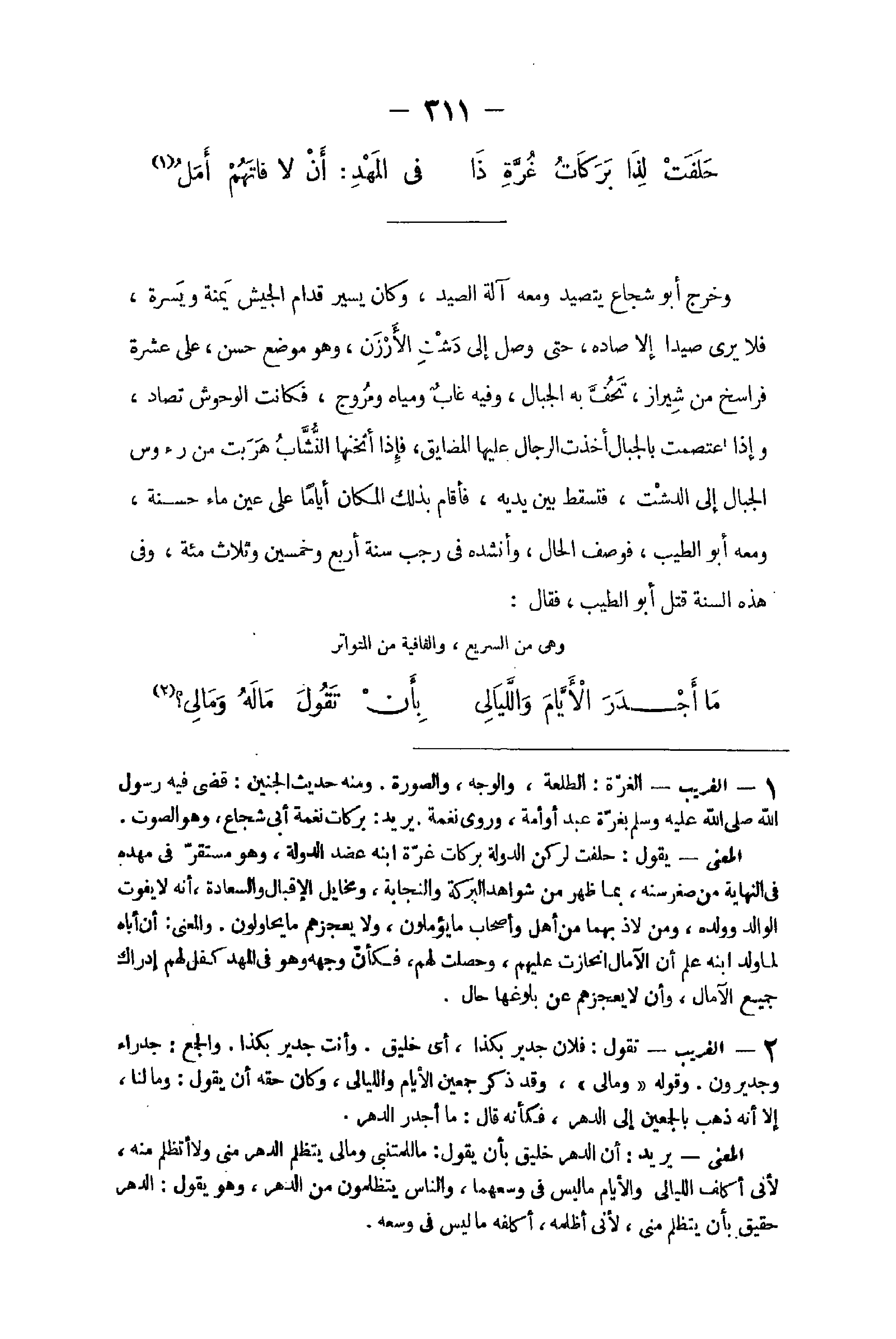 - 1 الْغَرِيب تَقول فلَان جدير بِكَذَا أَي خليق وَأَنت جدير بِكَذَا وَالْجمع جدراء وجديرون وَقَوله مَالِي وَقد ذكر جمعين الْأَيَّام والليالي وَكَانَ حَقه أَن يَقُول وَمَا لنا إِلَّا انه ذهب بالجمعين إِلَى الدَّهْر فَكَأَنَّهُ قَالَ مَا أَجْدَر الدَّهْر الْمَعْنى يُرِيد أَن الدَّهْر خليق بِأَن يَقُول مَا للمتنبي وَمَالِي يتظلم الدَّهْر مني وَلَا أتظلم مِنْهُ لِأَنِّي أكلف اللَّيَالِي وَالْأَيَّام مَا لَيْسَ فِي وسعهما وَالنَّاس يتظلمون من الدَّهْر وَهُوَ يَقُول الدَّهْر حقيق بِأَن يتظلم مني لِأَنِّي أظلمه اكلفه مَا لَيْسَ فِي وَسعه
